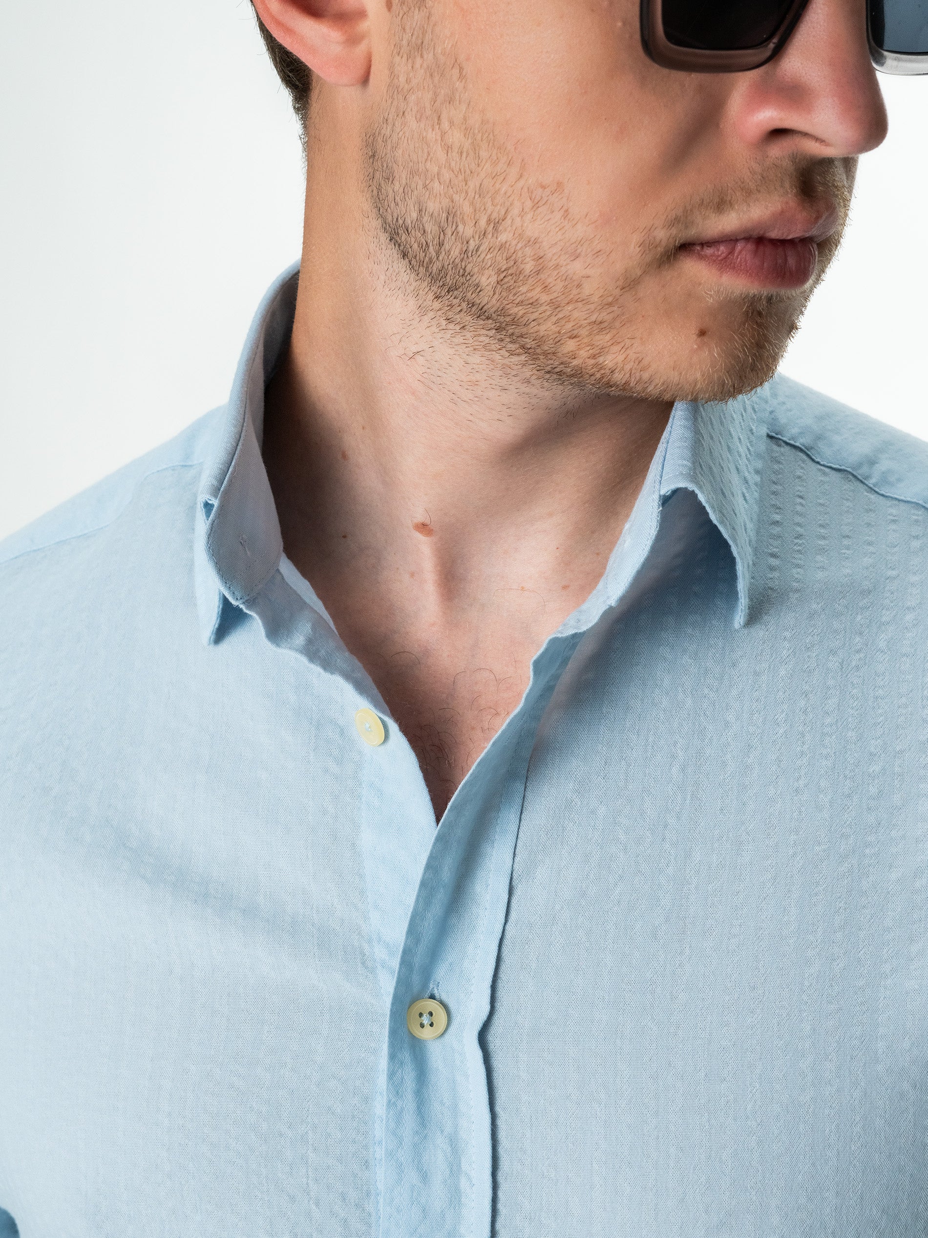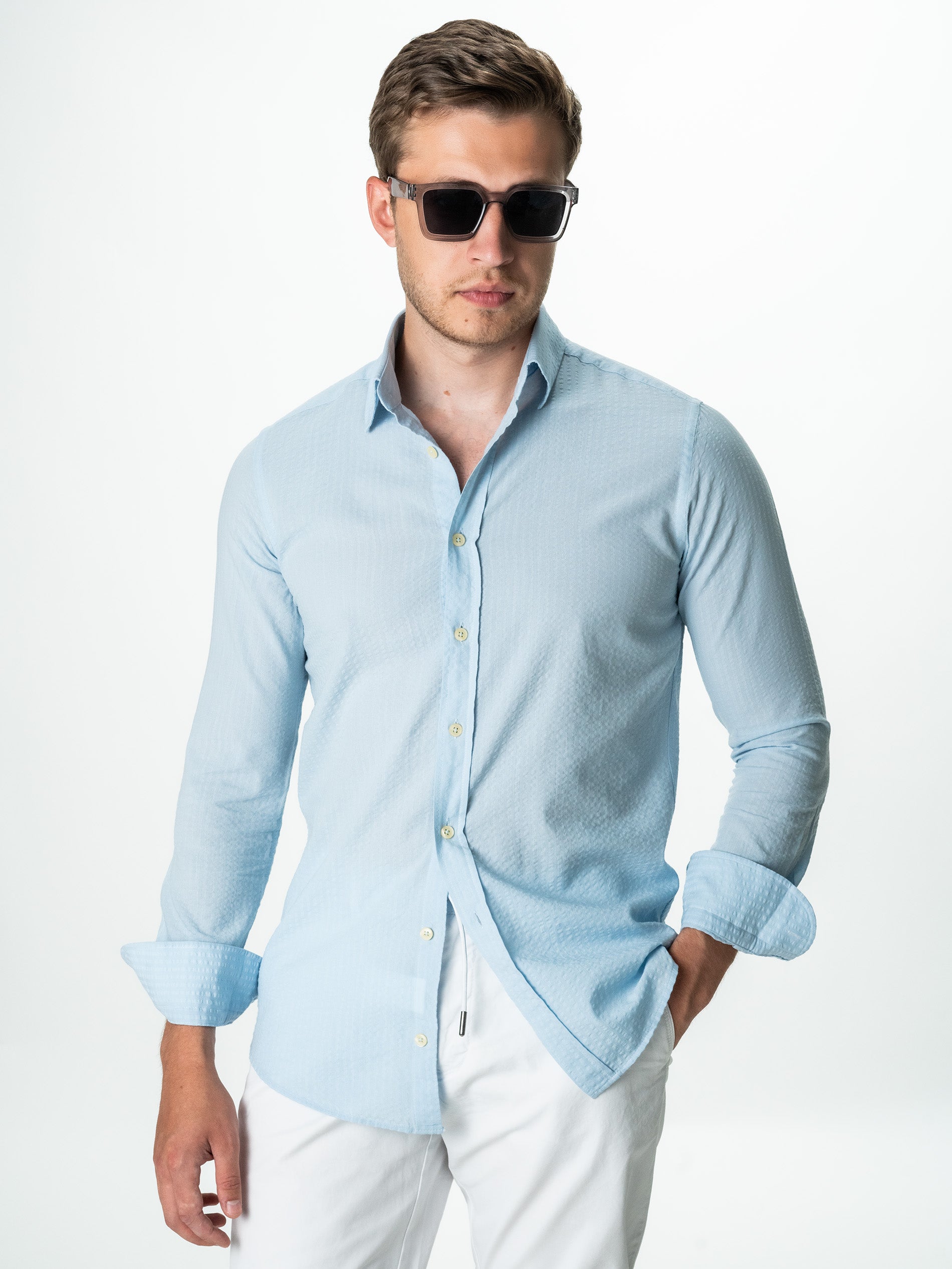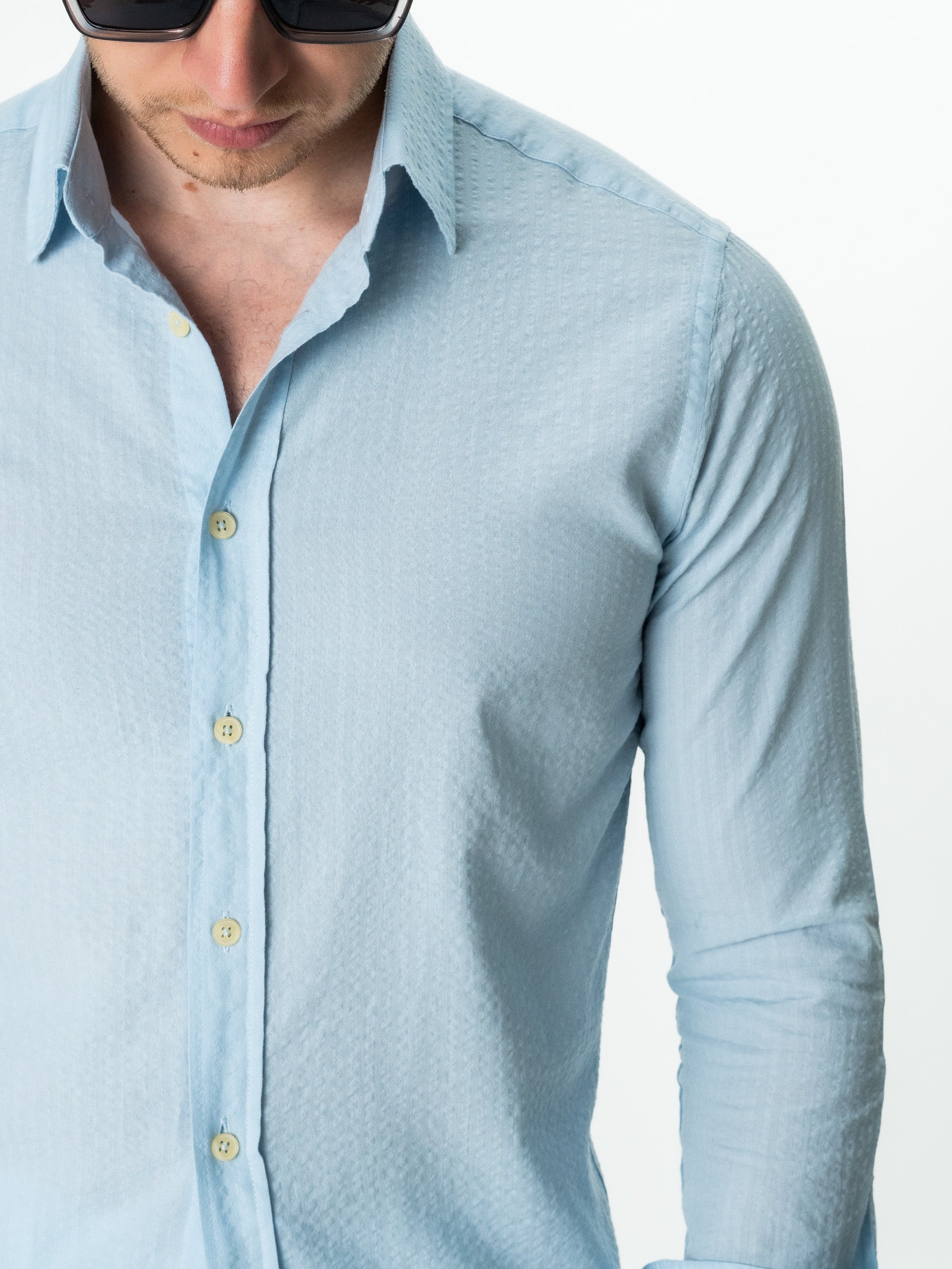 Camasa Barbati Albastru Deschis ( Bleu) De Vara Guler Semi- Deschis ( Semi-Spread) Bman0050, este confectionata din 100% bumbac natural cu design tip Gofre, ceea ce o face confortabila si respirabila, perfecta pentru o varietate de activitati casual de zi cu zi precum vacanta sau plaja. Camasa are un design de guler semi-deschis, care adauga o nota eleganta si sofisticata la tinuta. Culoarea camasii este potrivita pentru a fi asortata cu o varietate de culori, astfel incat poate fi inclusa cu usurinta intr-o varietate de costume si sacouri.