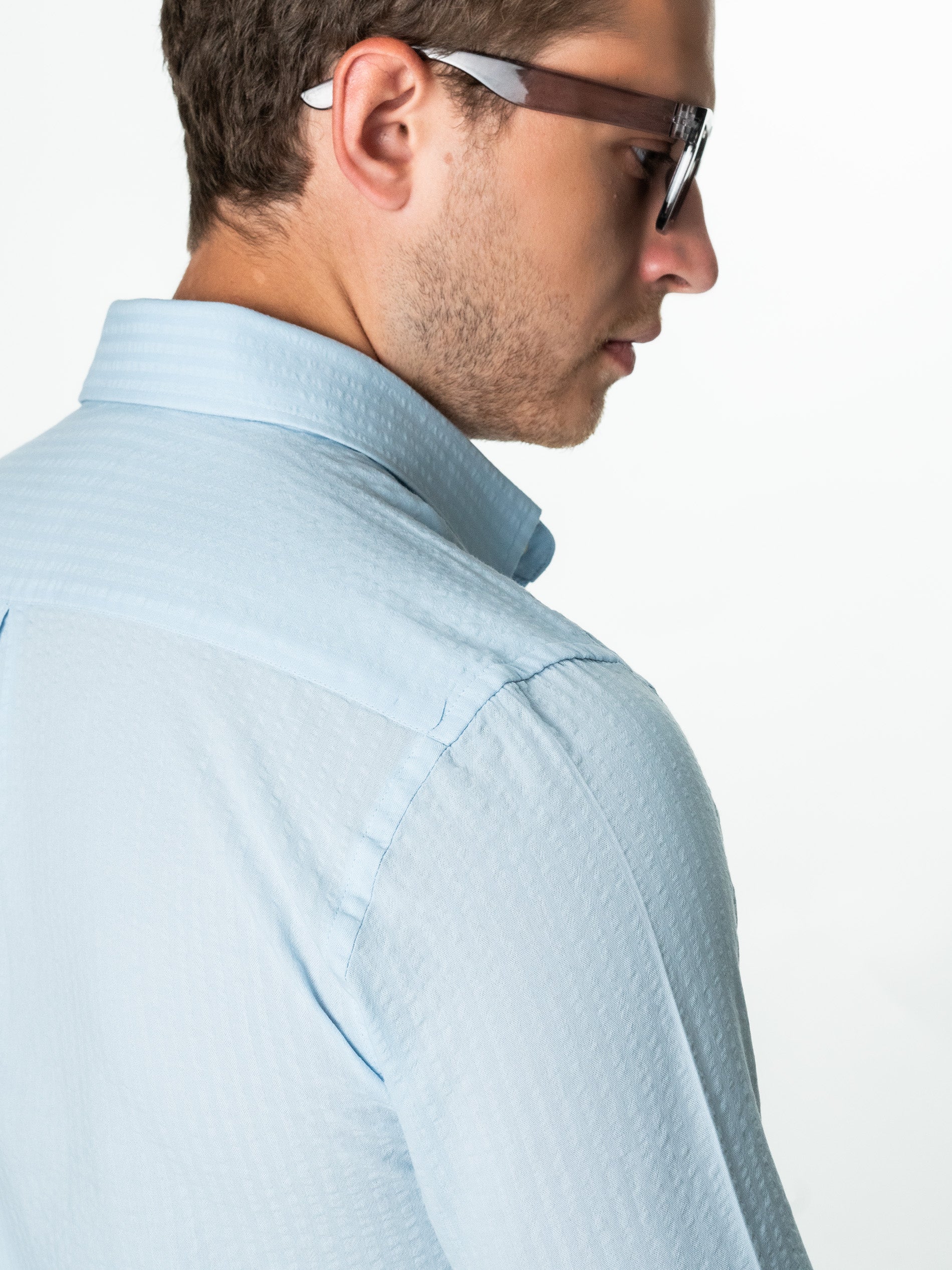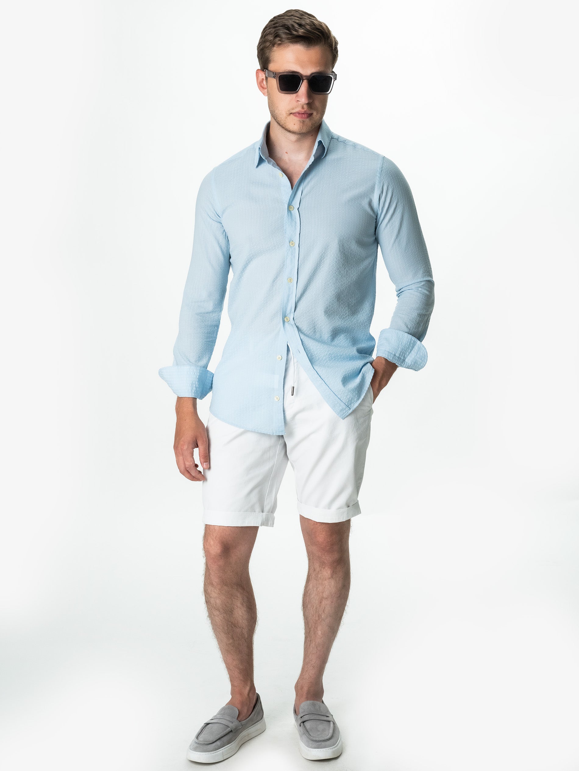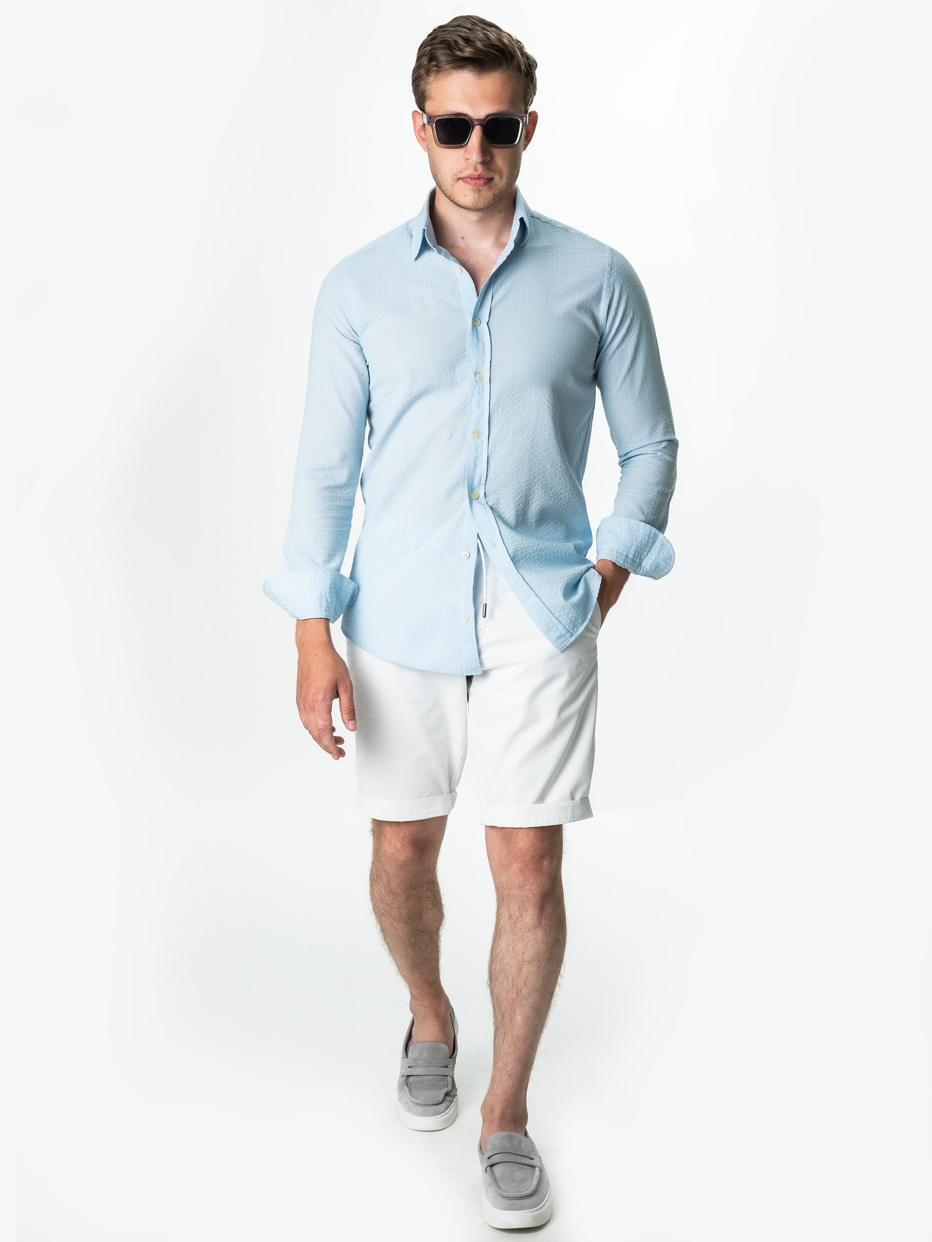 Camasa Barbati Albastru Deschis ( Bleu) De Vara Guler Semi- Deschis ( Semi-Spread) Bman0050, este confectionata din 100% bumbac natural cu design tip Gofre, ceea ce o face confortabila si respirabila, perfecta pentru o varietate de activitati casual de zi cu zi precum vacanta sau plaja. Camasa are un design de guler semi-deschis, care adauga o nota eleganta si sofisticata la tinuta. Culoarea camasii este potrivita pentru a fi asortata cu o varietate de culori, astfel incat poate fi inclusa cu usurinta intr-o varietate de costume si sacouri.