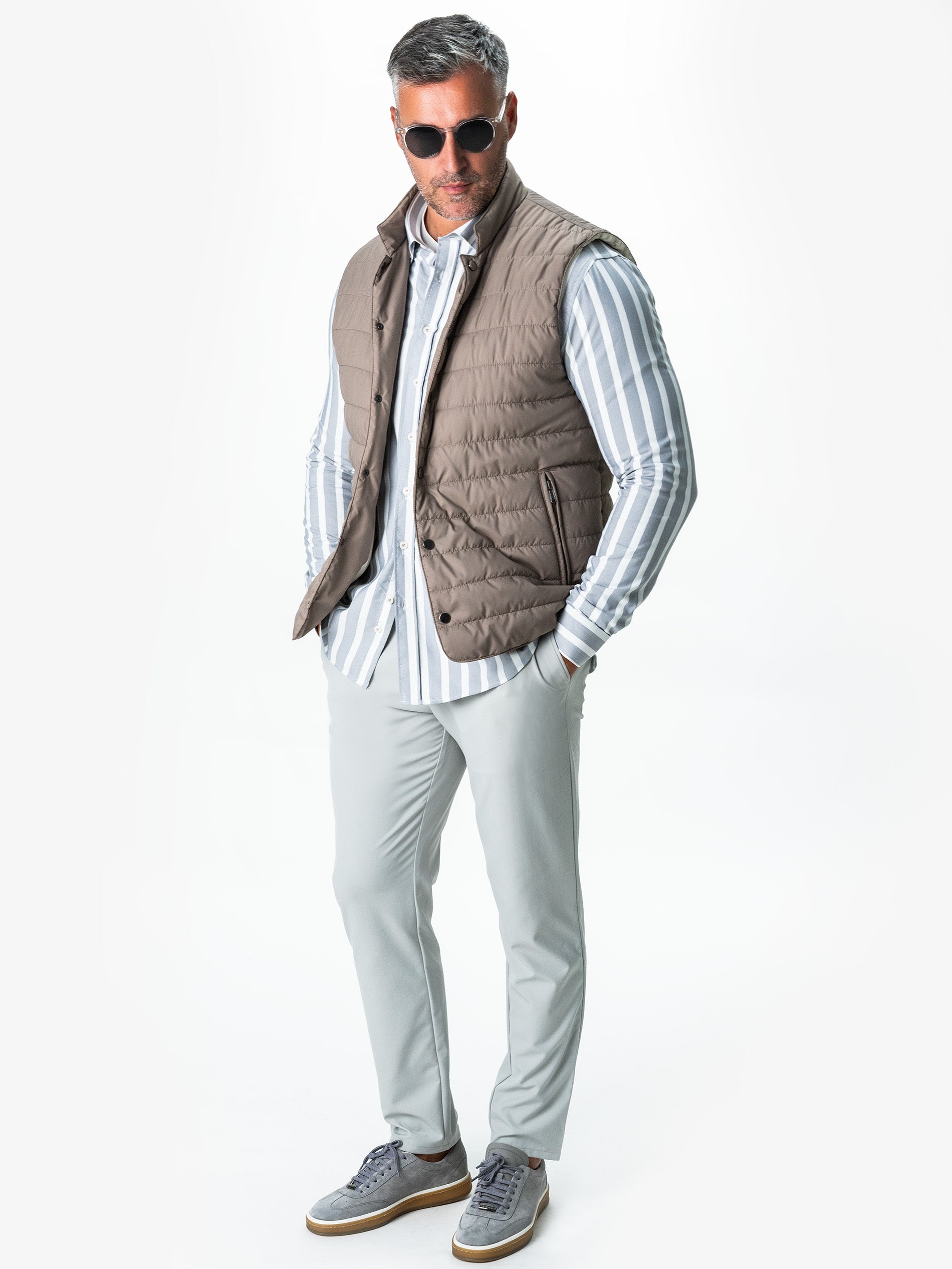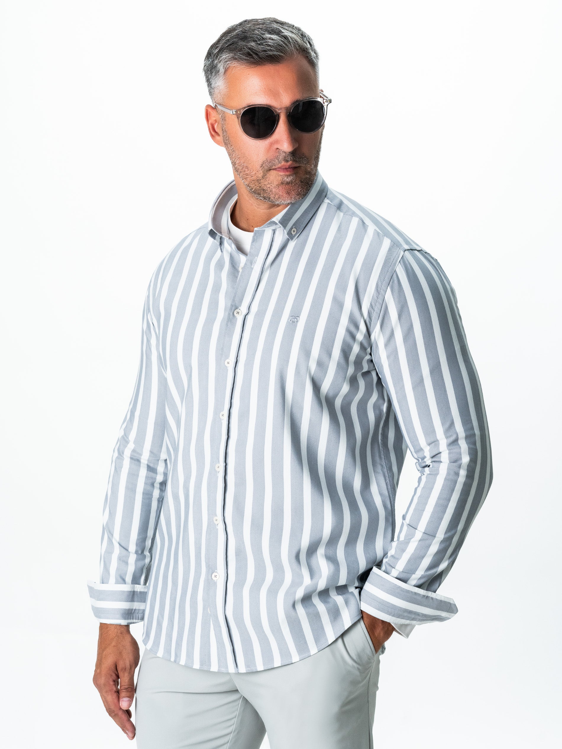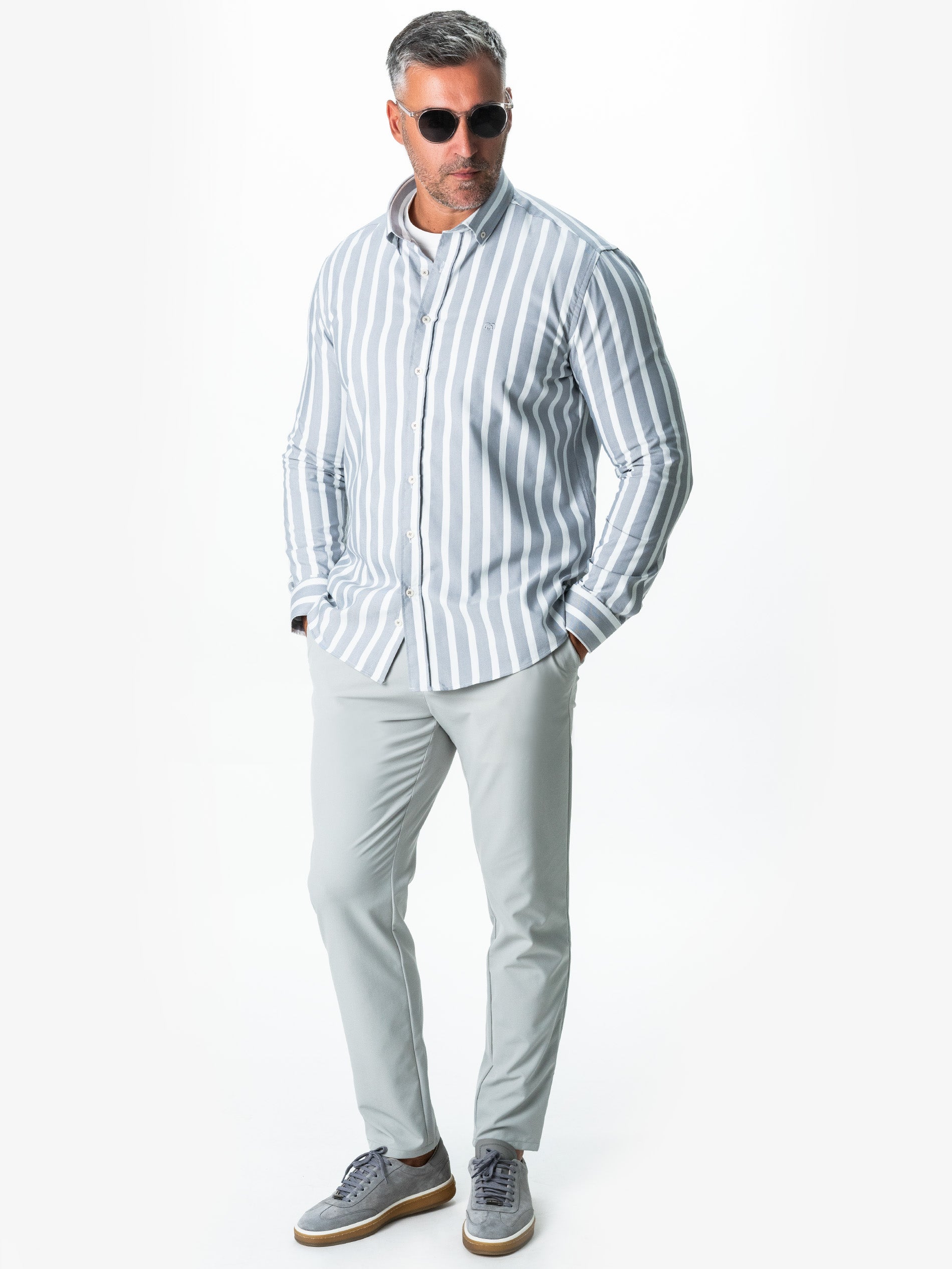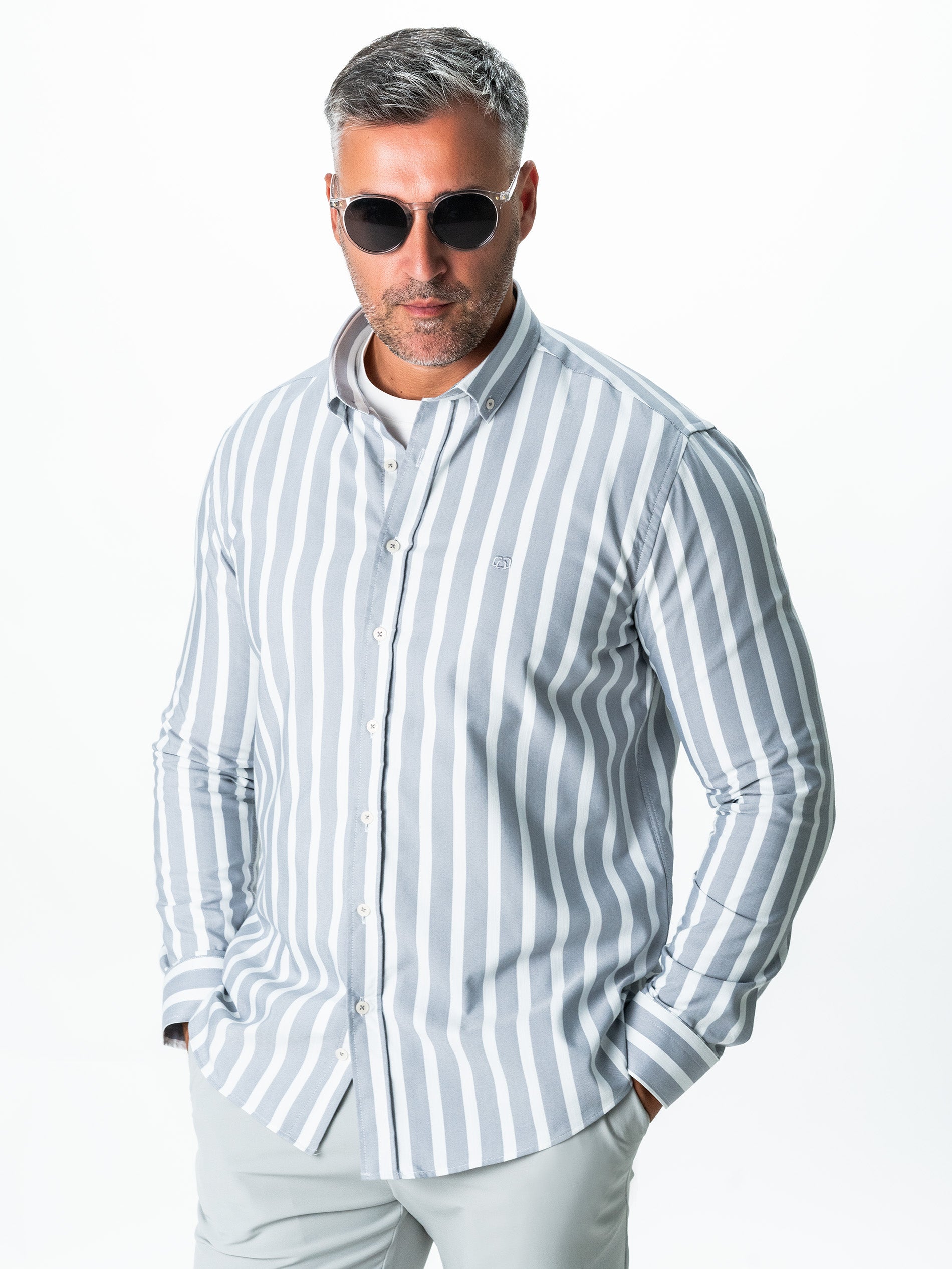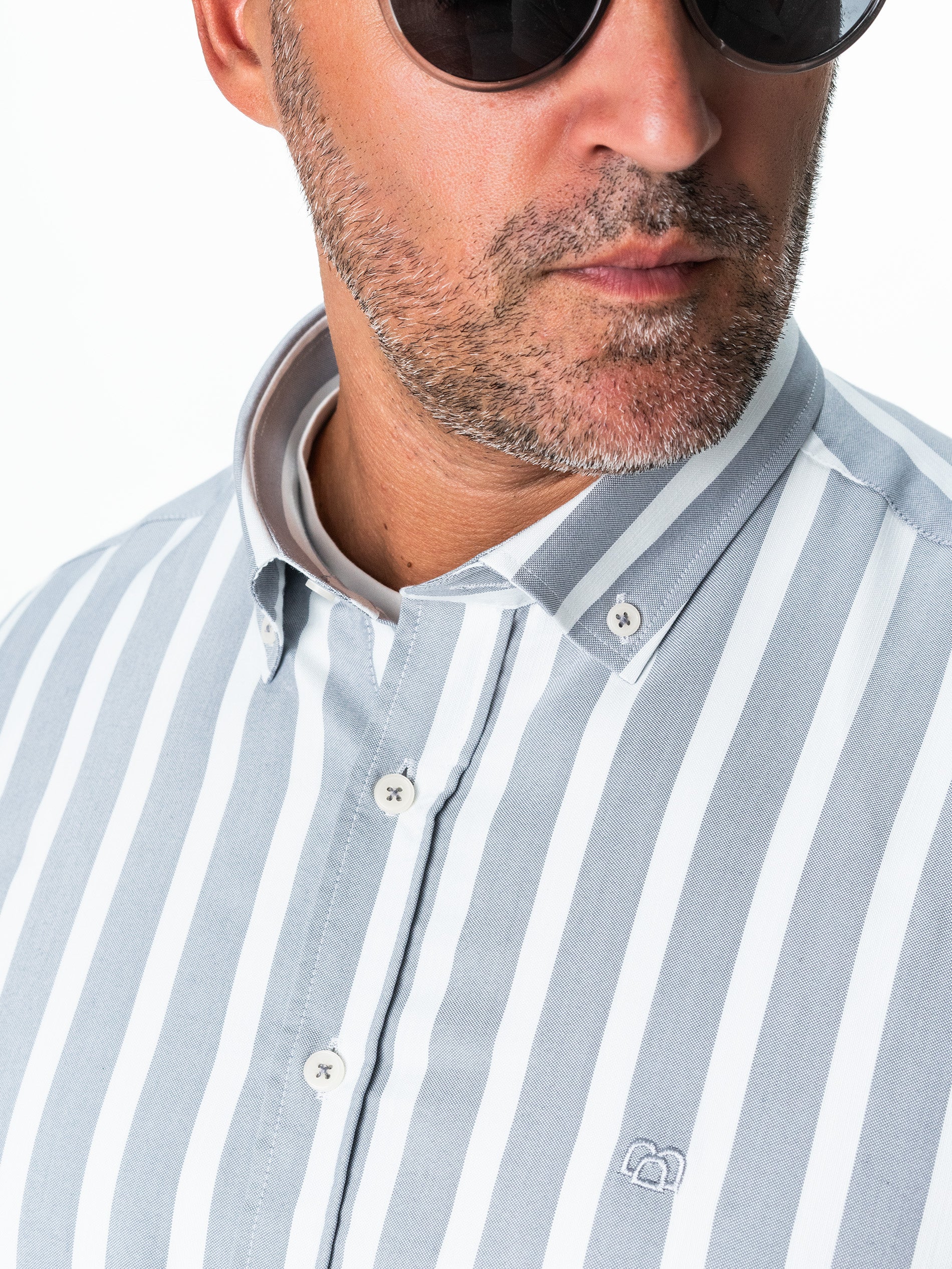 Camasa Casual & Office Barbati Gri În Dungi Guler Cu Prindere In Nasturi Pe Exterior Bman0051, este confectionata din 100% bumbac, ceea ce o face confortabila si respirabila, perfecta pentru o varietate de ocazii sau evenimente de de zi sau formale de seara. Camasa are un design de guler semi-deschis, care adauga o nota eleganta si sofisticata la tinuta. Culoarea bleu deschis a camasii este potrivita pentru a fi asortata cu o varietate de culori, astfel incat poate fi inclusa cu usurinta intr-o varietate de costume si sacouri.