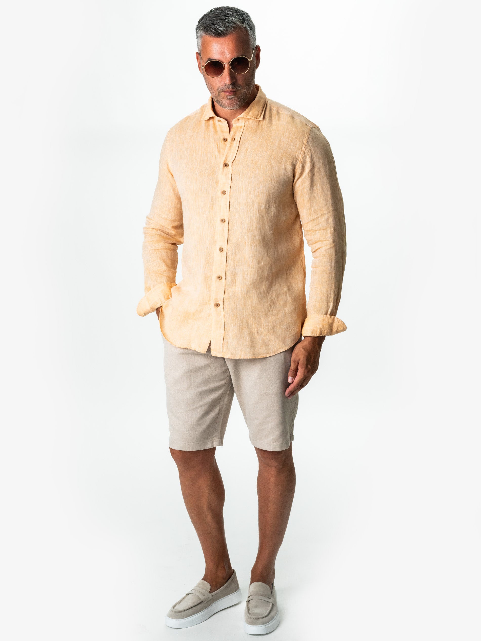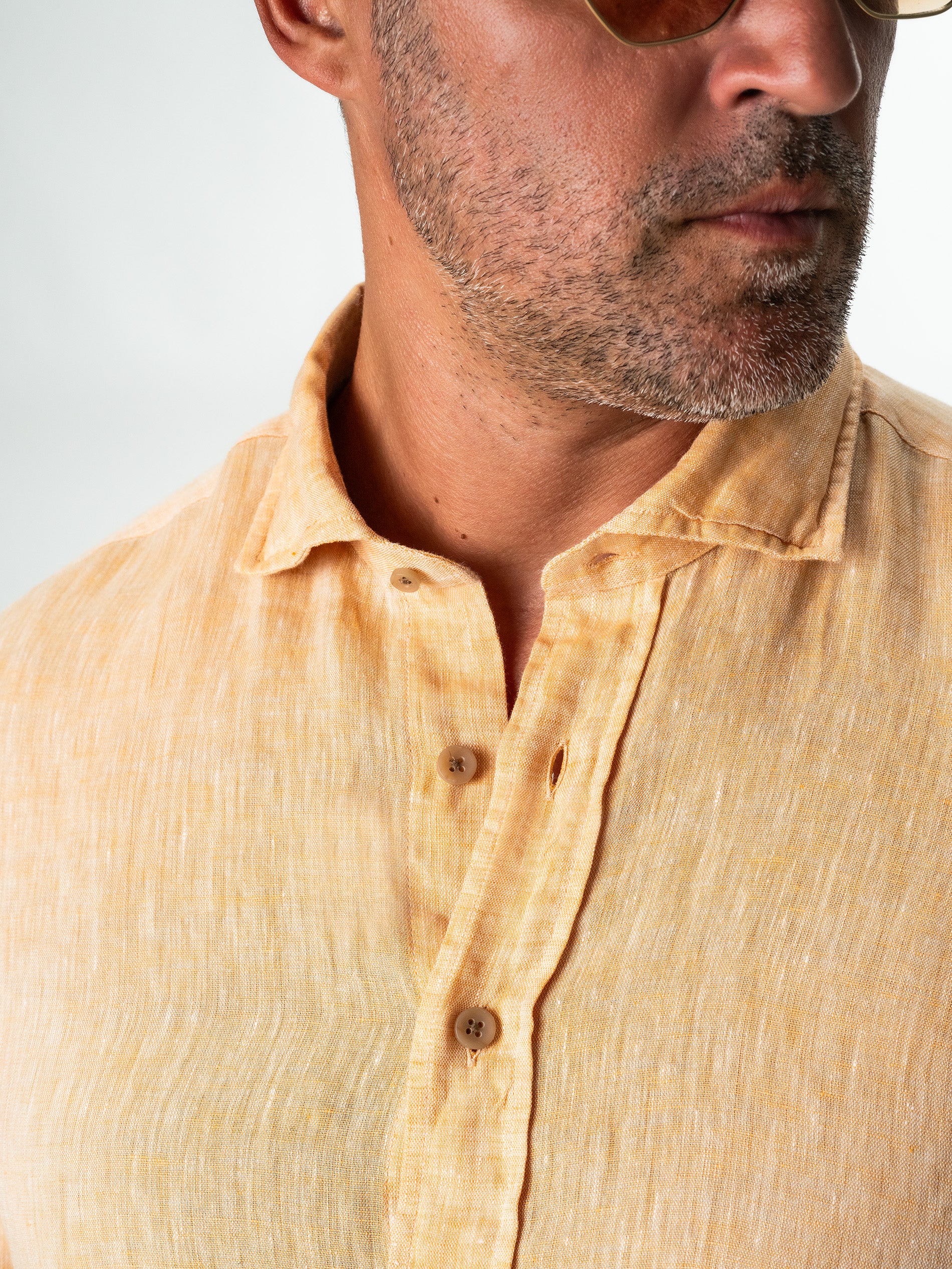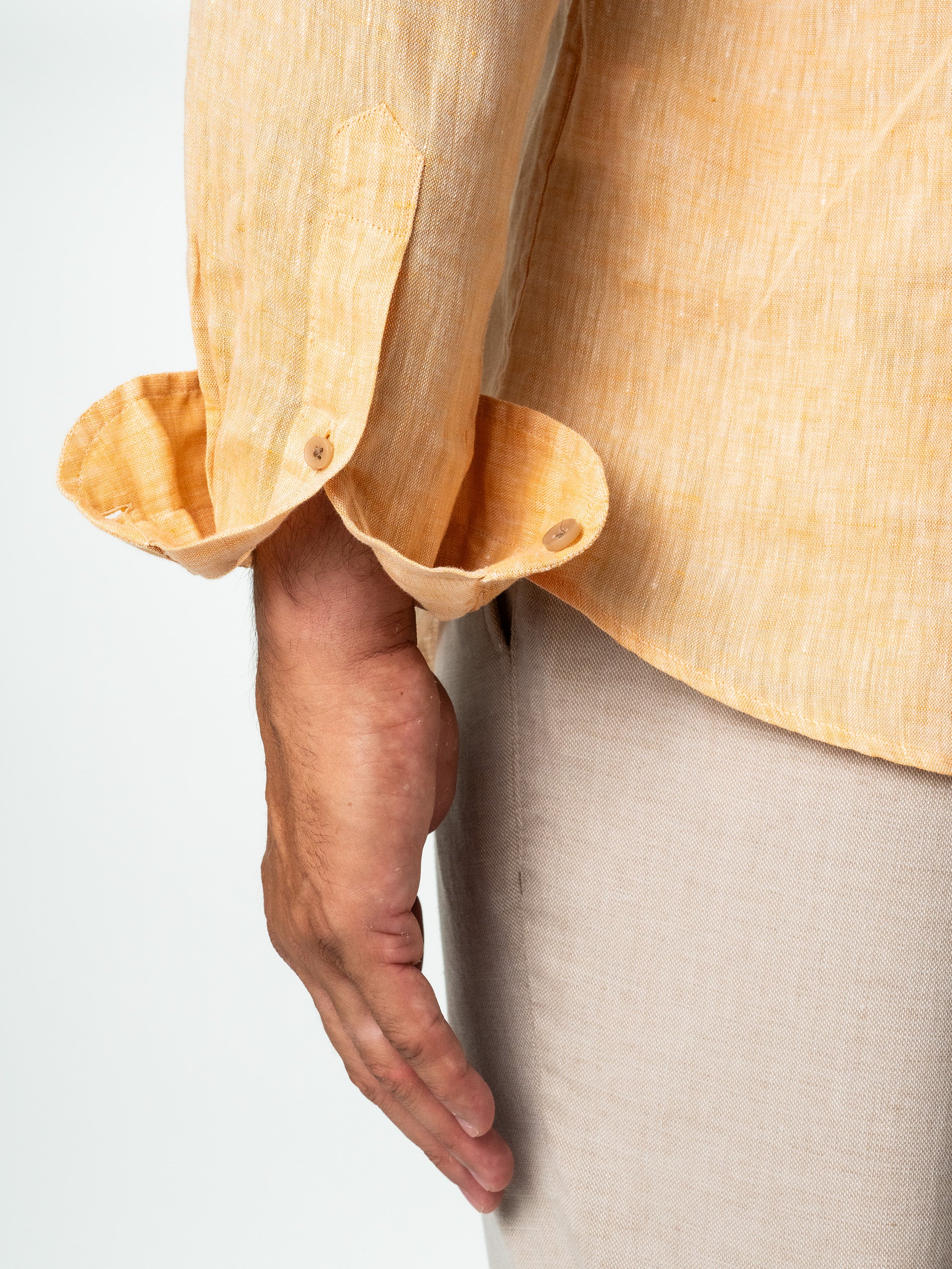 Cămașă Plaja Bărbați Din In Natural De Vara Portocalie din 100% țesătură Italiana Bianco Nero din in natural, este concepută pentru zilele de vară călduroase, când tot ce vrem este să purtăm ceva răcoros și să păstrăm un look sofisticat. Poate fi asortată cu pantaloni model Chinos sau Gurkha Design.