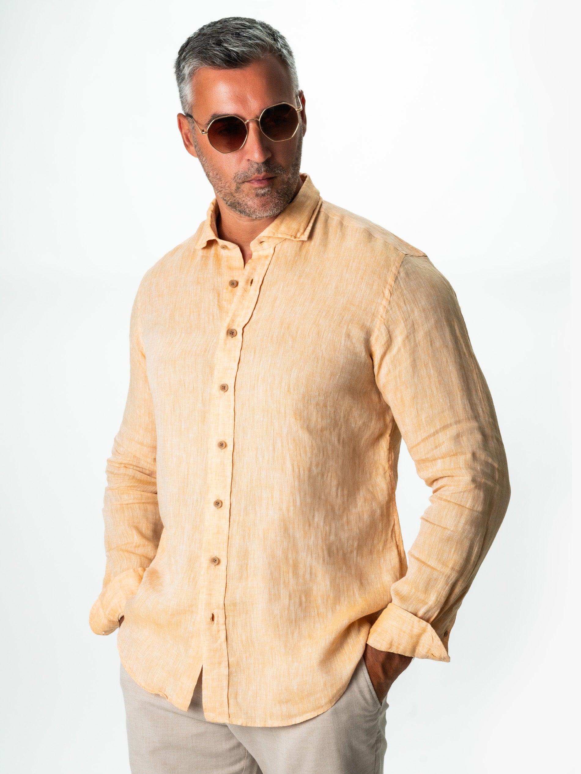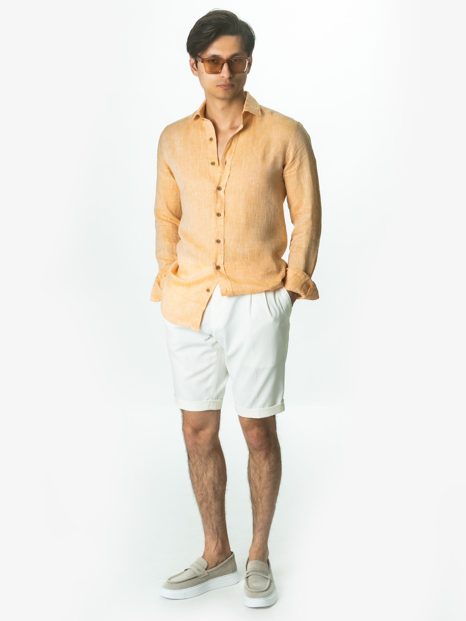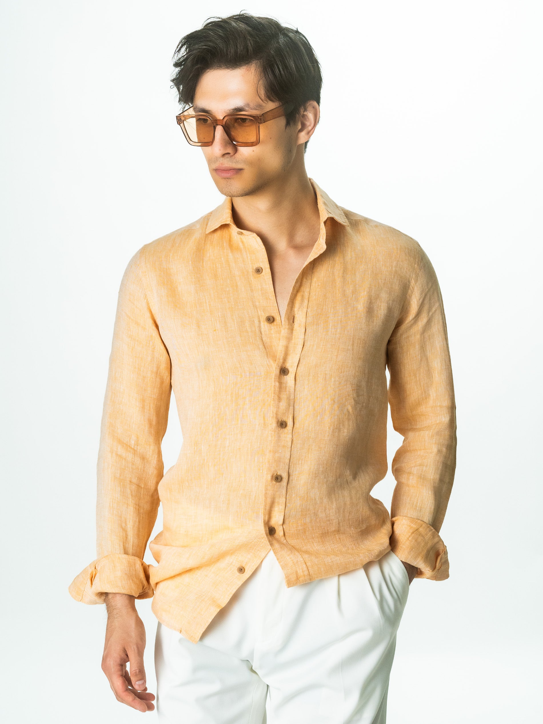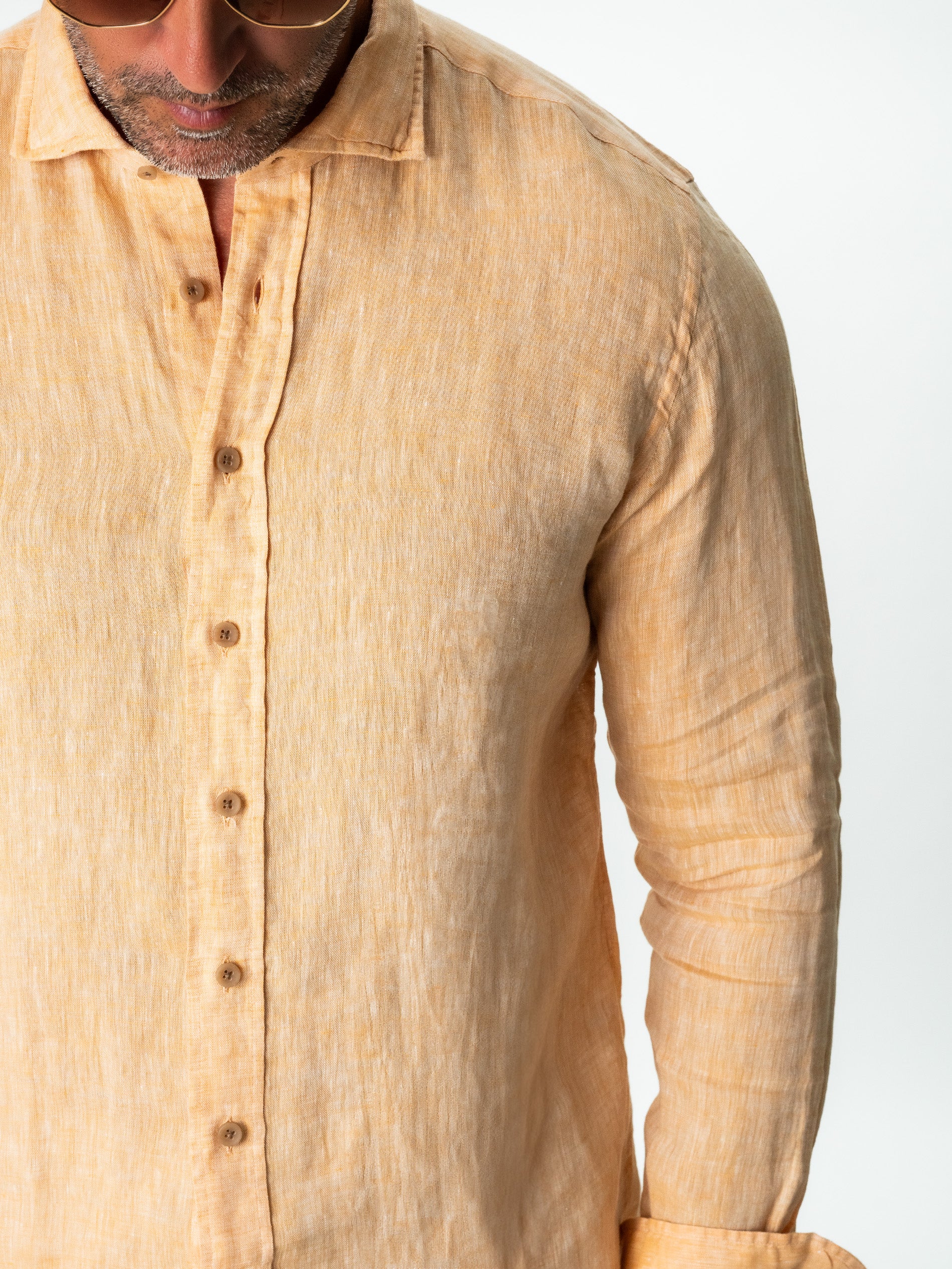 Cămașă Plaja Bărbați Din In Natural De Vara Portocalie din 100% țesătură Italiana Bianco Nero din in natural, este concepută pentru zilele de vară călduroase, când tot ce vrem este să purtăm ceva răcoros și să păstrăm un look sofisticat. Poate fi asortată cu pantaloni model Chinos sau Gurkha Design.