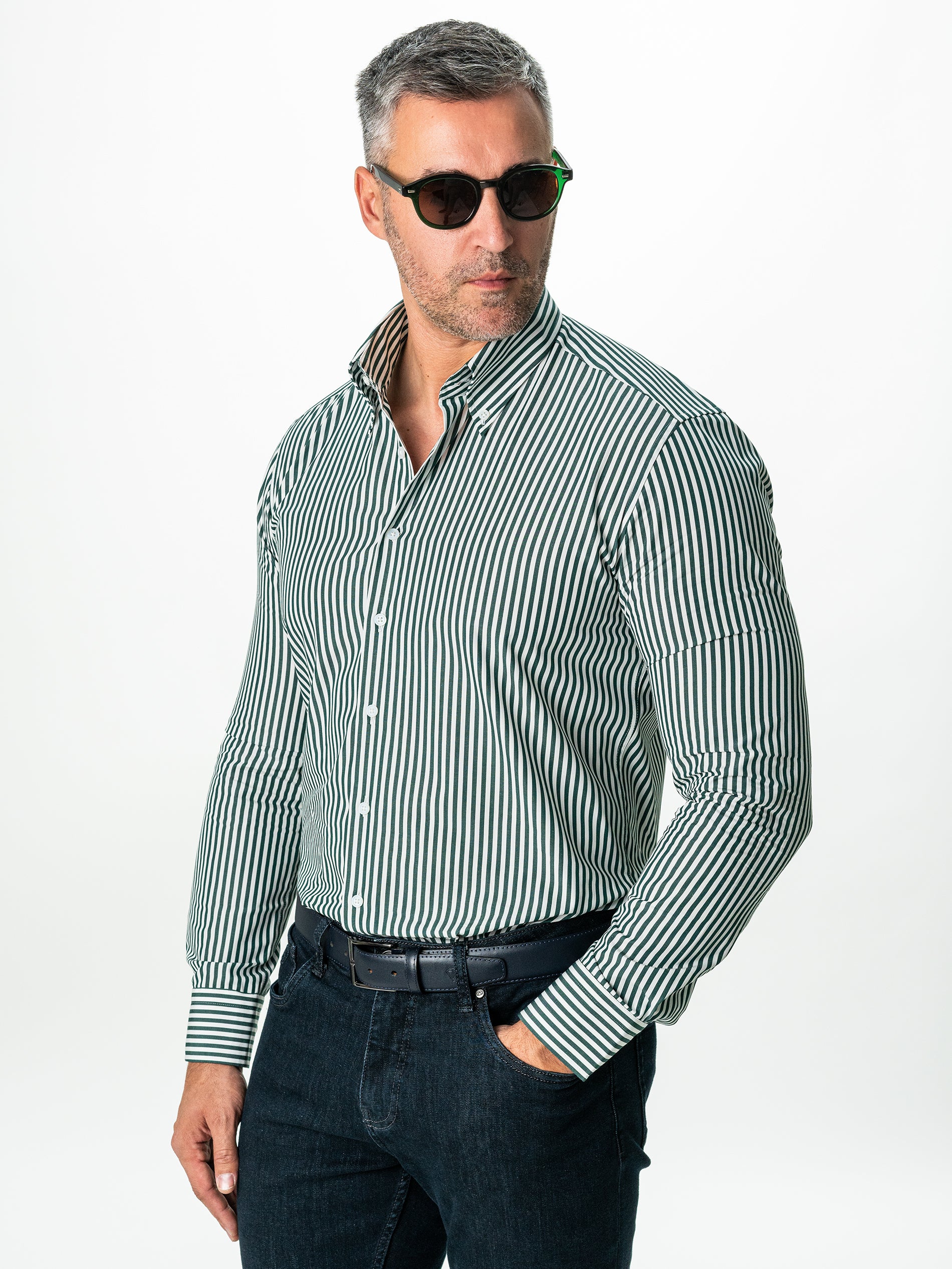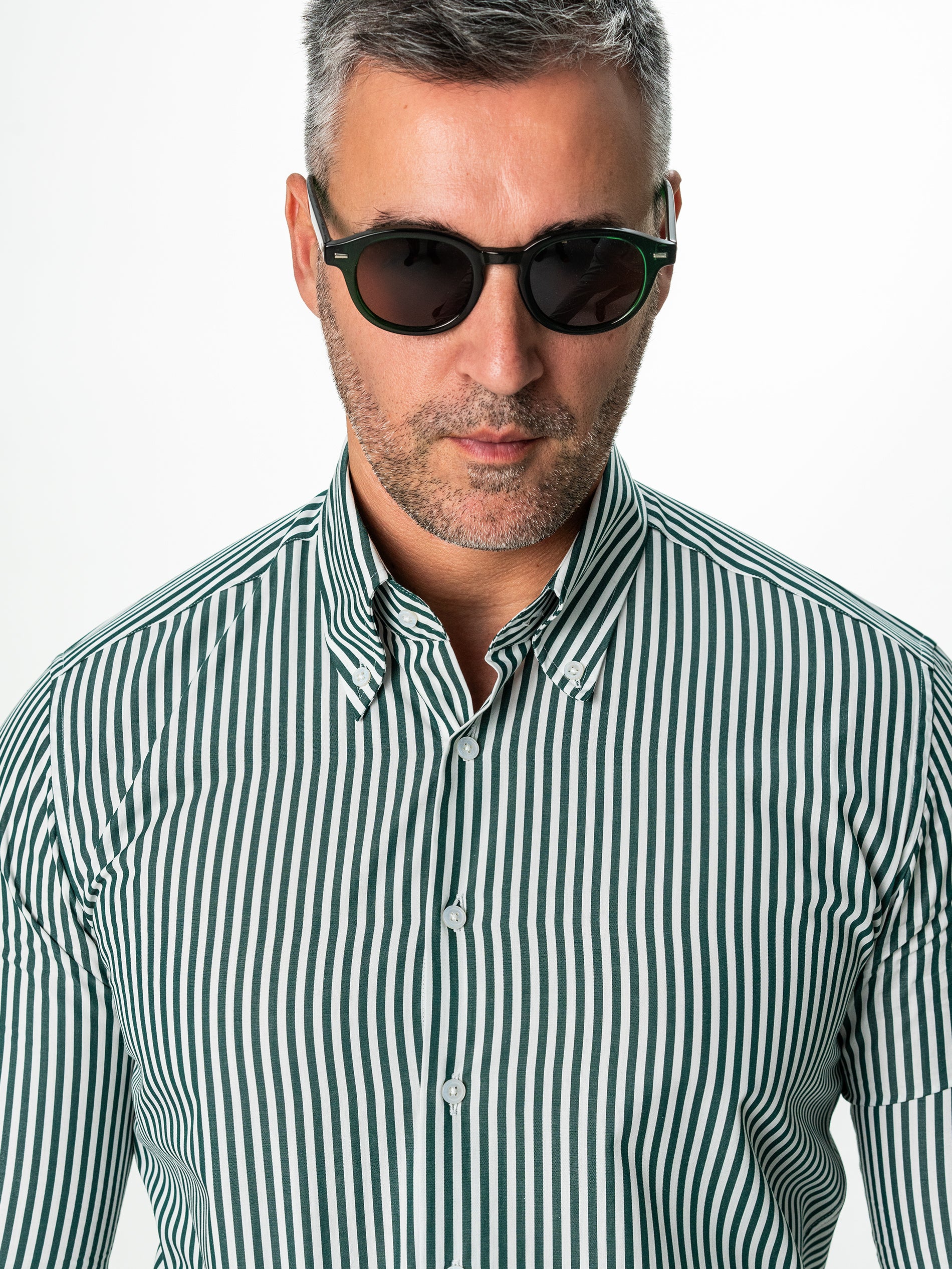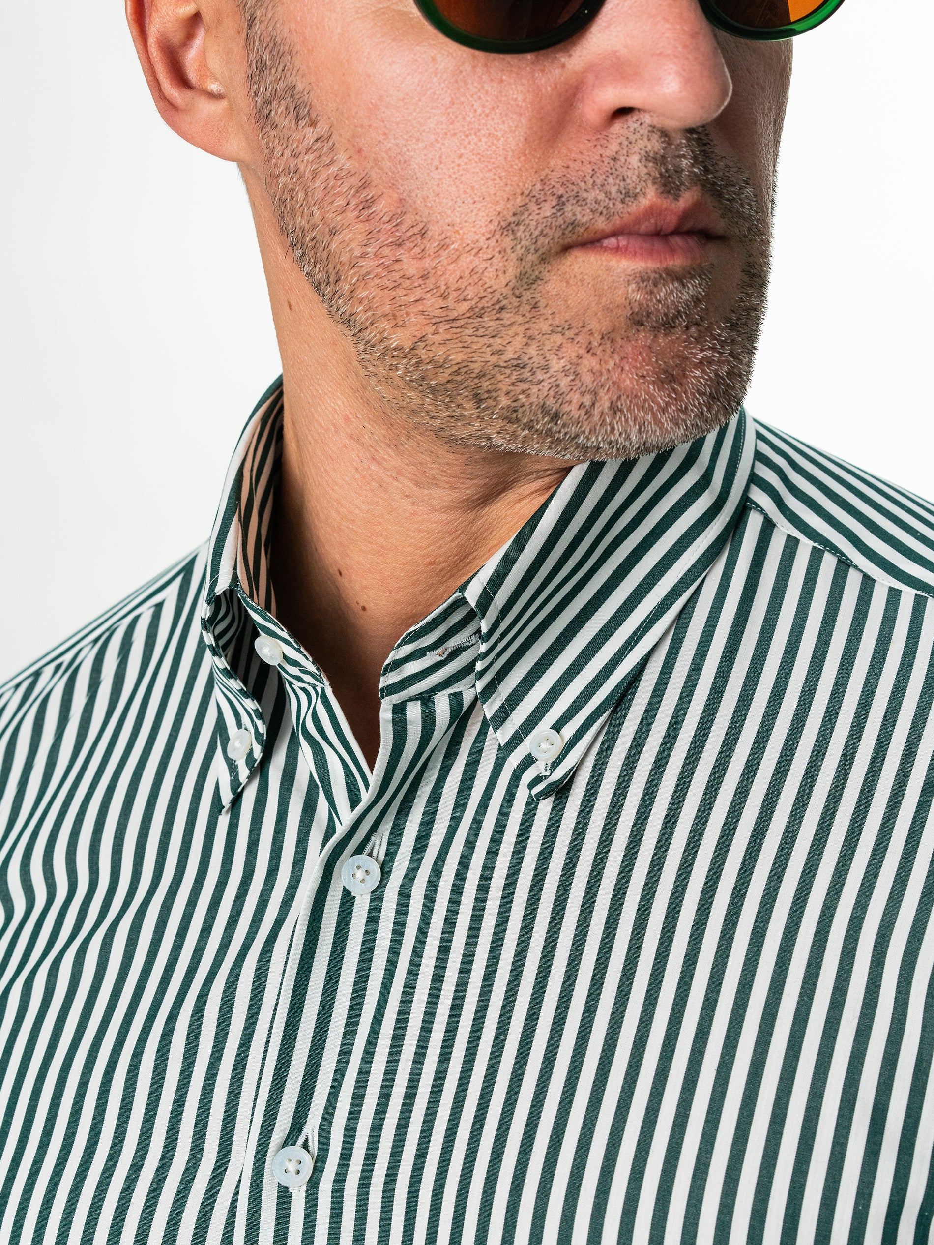 Camasa Barbati Bumbac Natural Verde In Dungi Guler Two Buttons BMan0055, într-un design esential cu dungi subtile, este confecționată din bumbac italian Monti de calitate superioară, fiind perfectă atât pentru ținutele de birou, cât și pentru un look smart-casual rafinat.