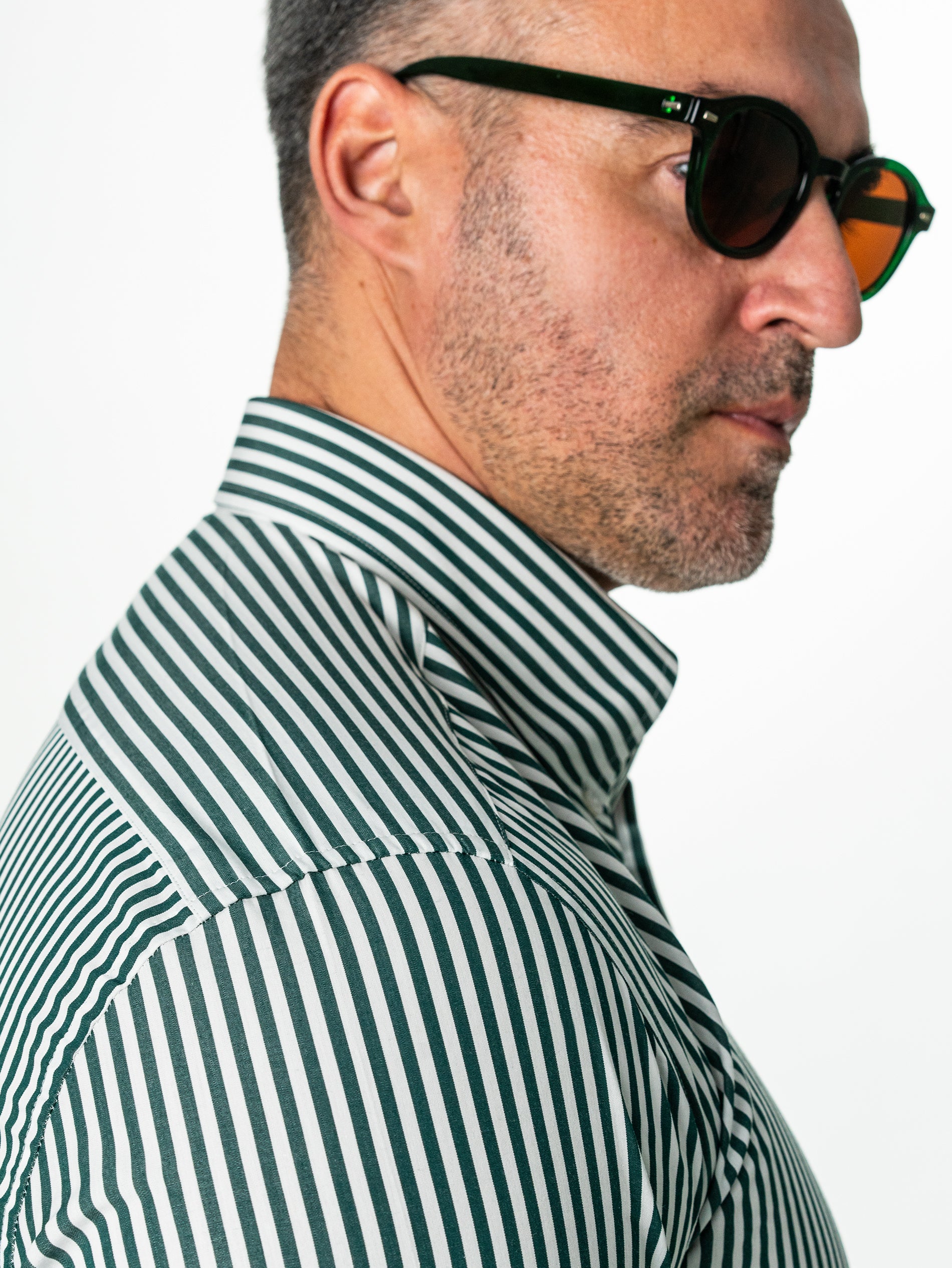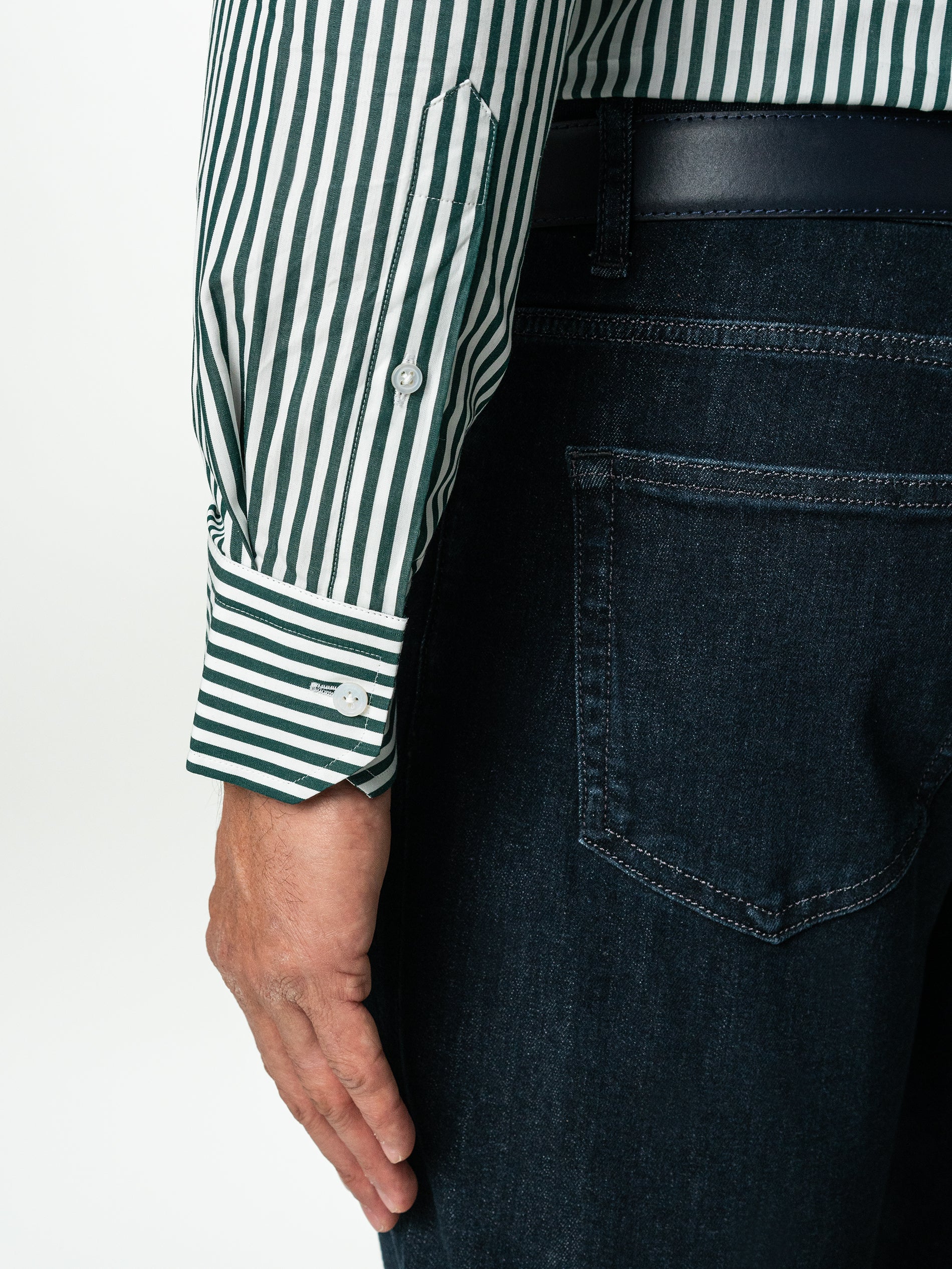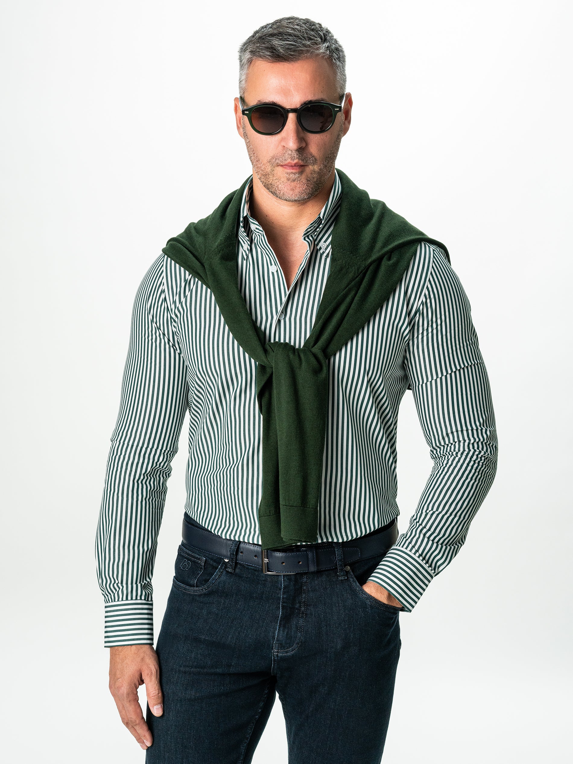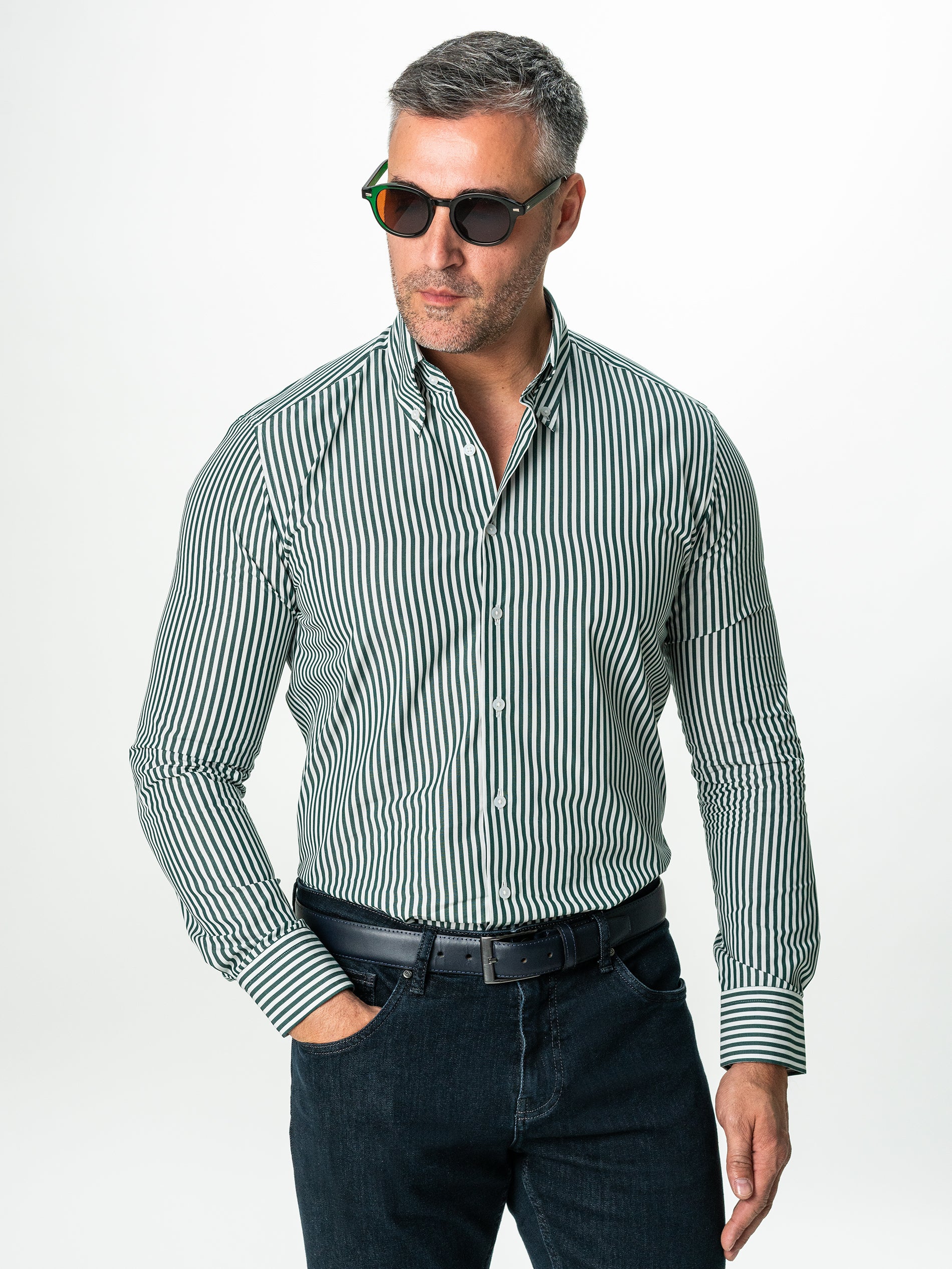 Camasa Barbati Bumbac Natural Verde In Dungi Guler Two Buttons BMan0055, într-un design esential cu dungi subtile, este confecționată din bumbac italian Monti de calitate superioară, fiind perfectă atât pentru ținutele de birou, cât și pentru un look smart-casual rafinat.