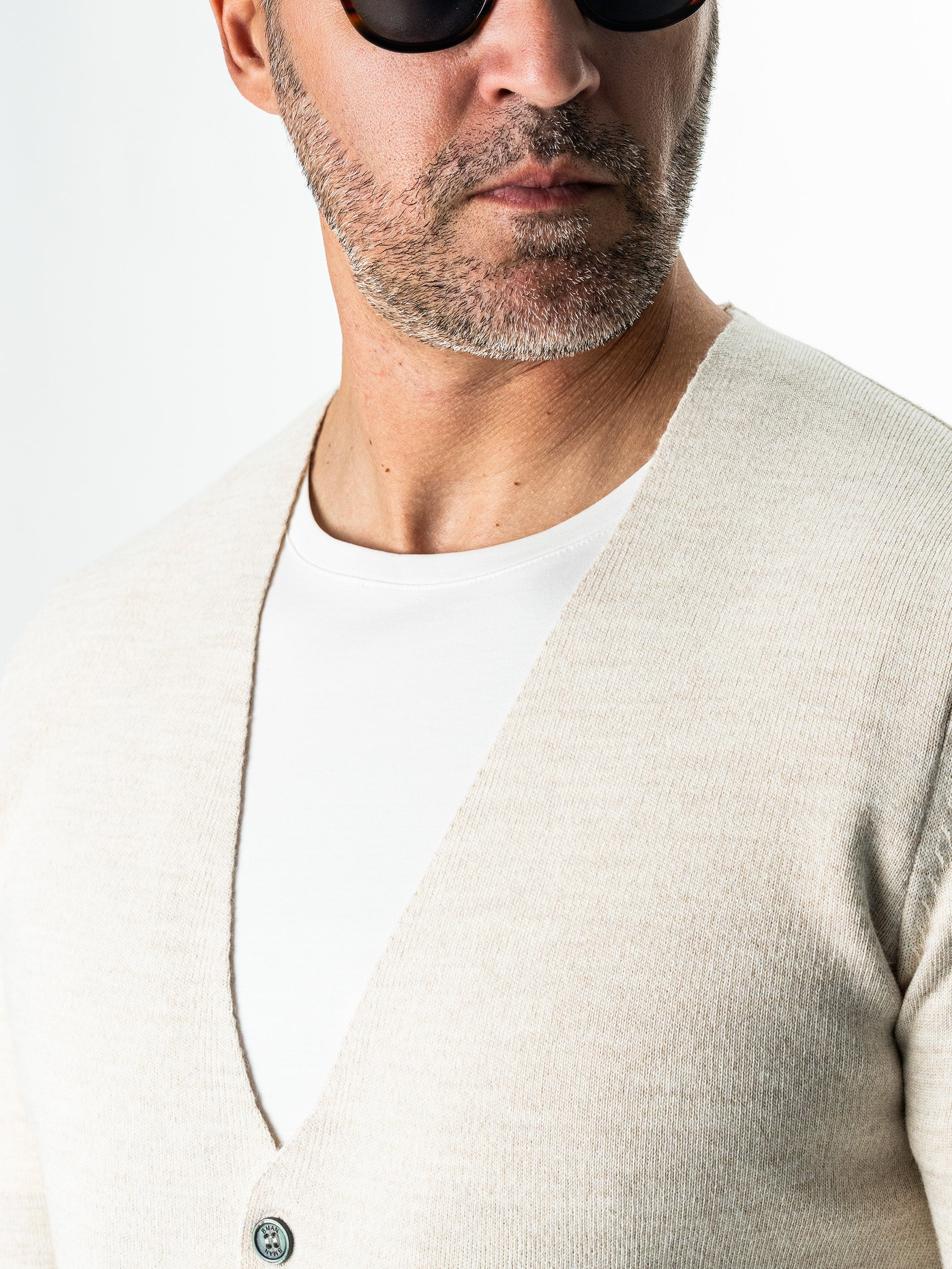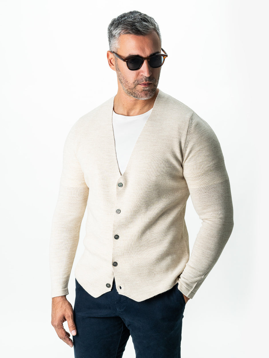 Pulover Crem Barbati Cu Inchidere In Cinci Nasturi Tip Cardigan Din Lana Merinos BMan0017 este o piesă versatilă, ideală pentru bărbații care apreciază eleganța clasică combinată cu confortul. Confecționat din lână Merinos de înaltă calitate, acest pulover oferă o senzație moale la atingere și o căldură excelentă, fiind perfect pentru sezonul rece. Designul minimalist, dar elegant, îl face ușor de asortat cu o cămașă sau un tricou, oferind un aspect modern și îngrijit.