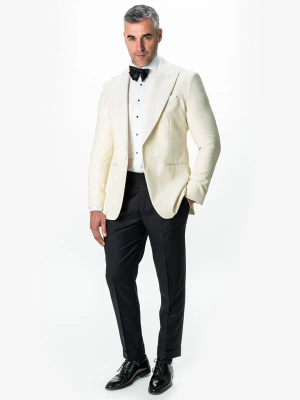 Costum Barbati Ceremonie Crem Perla , creat din 100% tesatura fina de lana Vitale Barberis Canonico Finete 110'S, material confortabil de o calitate ridicată. Costumul este format din doua piese, sacou alb si pantaloni negri, acest contrast facandu-l foarte apreciat pentru o tinuta de ceremonie. Interiorul sacoului este unul căptușit în totaliate pe interior. Acesta se remarcă prin calitatea si confortul ridicat oferit de croiala si tesătura naturala existenta. Modelul sacoului si reverul ascutit, la un singur nasture imbracat si pantalonii negrii fac acest costum o alegere inspirata pentru ceremonii si evenimente speciale de-a lungul intregului an, inspira o atentie la detalii deosebita si o atitudine sigura pe sine.