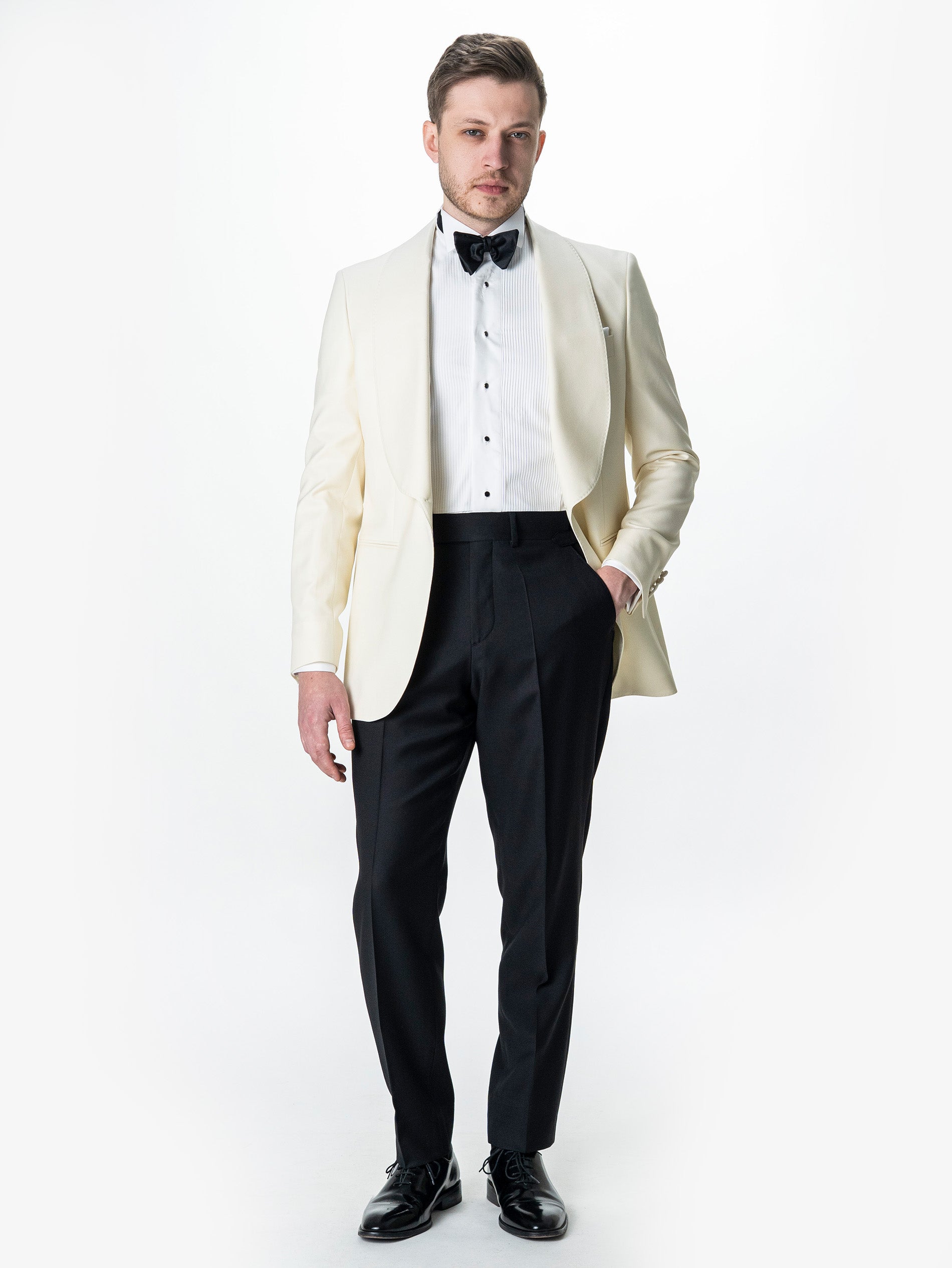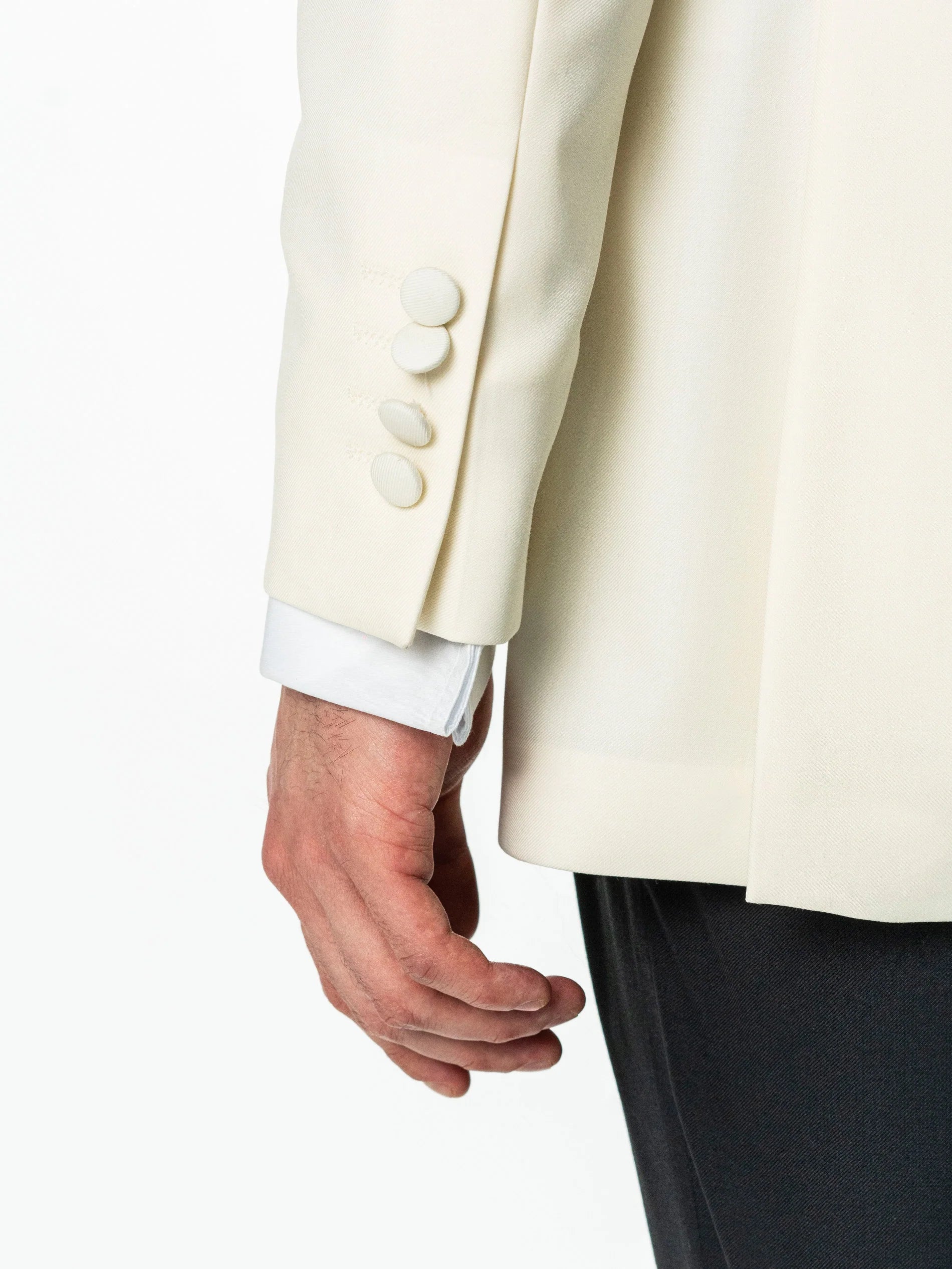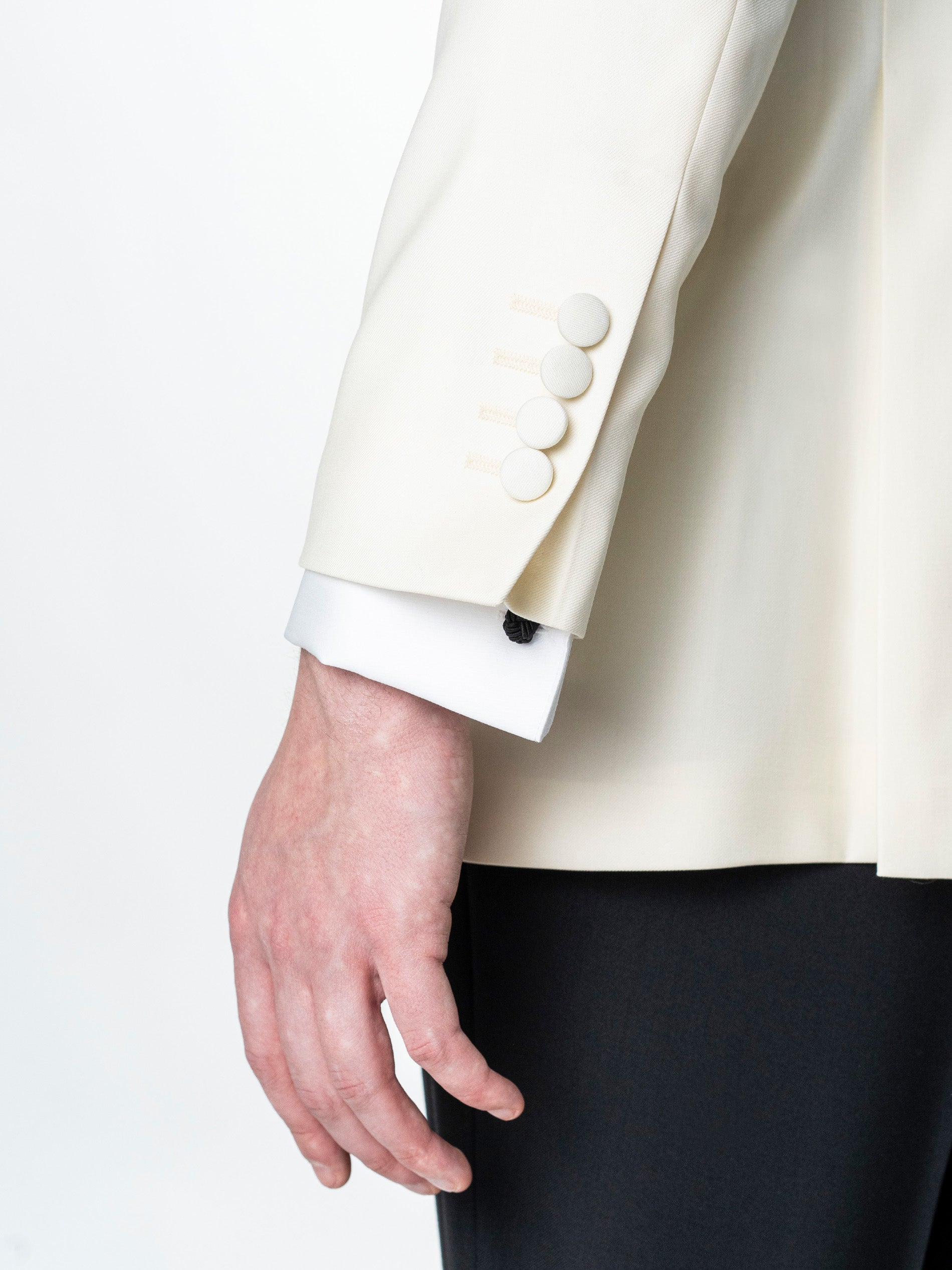 Costum Barbati Ceremonie Alb Pearl , creat din 100% tesatura fina de lana Vitalis Barberis, material confortabil de o calitate ridicată. Costumul este format din doua piese, sacou alb si pantaloni negri, acest contrast facandu-l foarte apreciat pentru o tinuta de ceremonie. Interiorul sacoului este unul căptușit în totaliate pe interior. Acesta se remarcă prin calitatea si confortul ridicat oferit de croiala si tesătura naturala existenta. Modelul sacoului si rever sal, la un singur nasture imbracat si pantalonii negrii fac acest costum o alegere inspirata pentru ceremonii si evenimente speciale de-a lungul intregului an, inspira o atentie la detalii deosebita si o atitudine sigura pe sine.