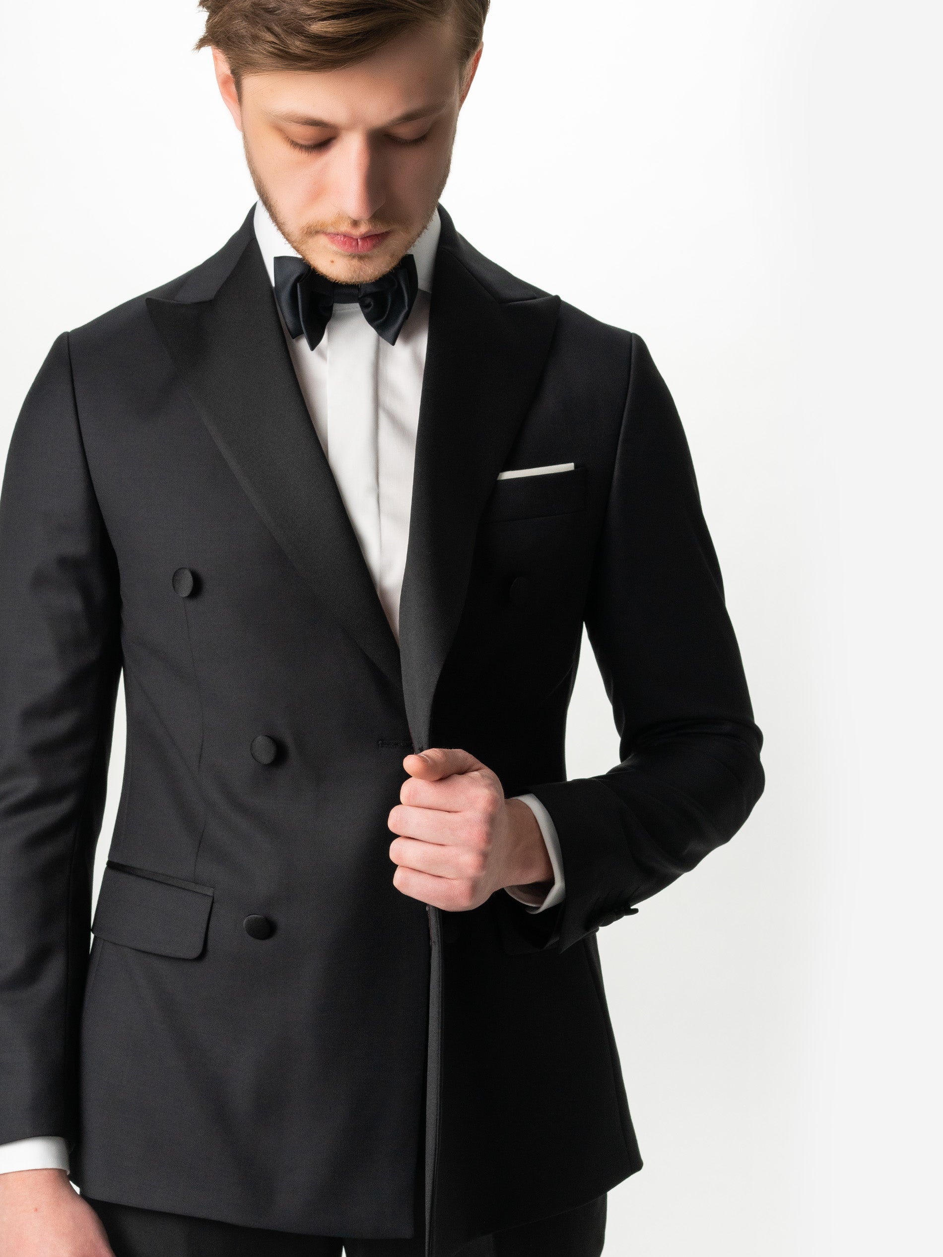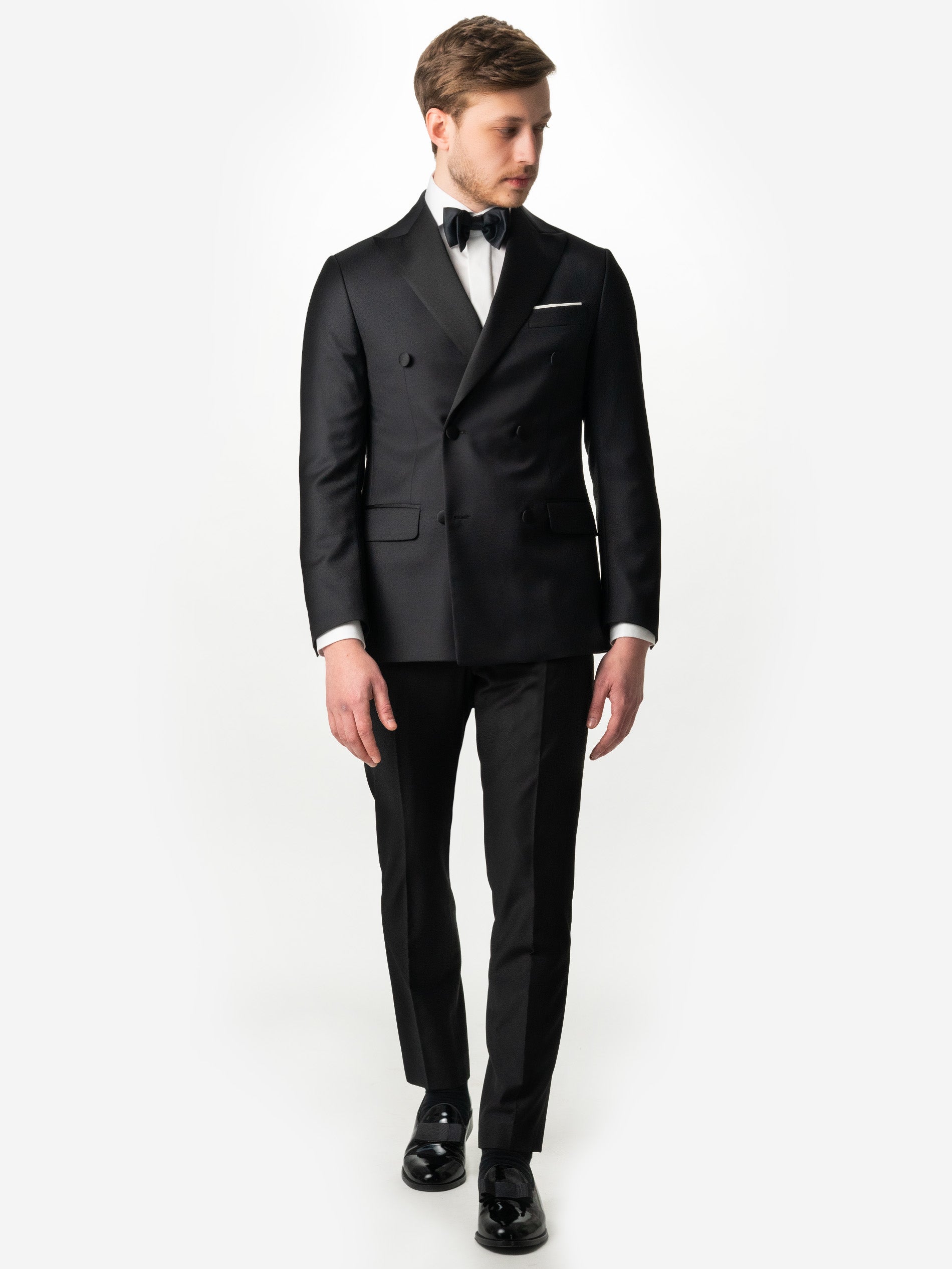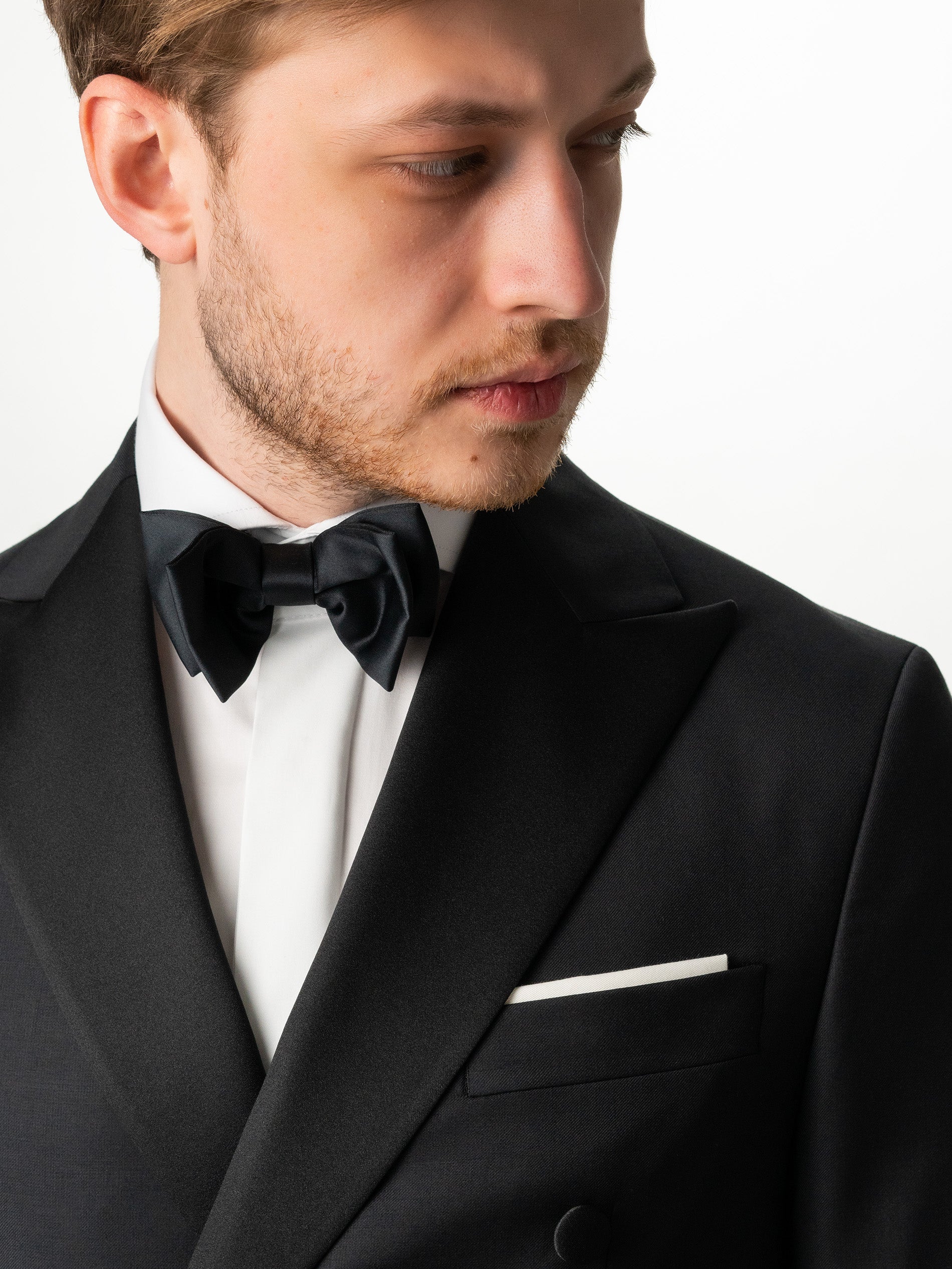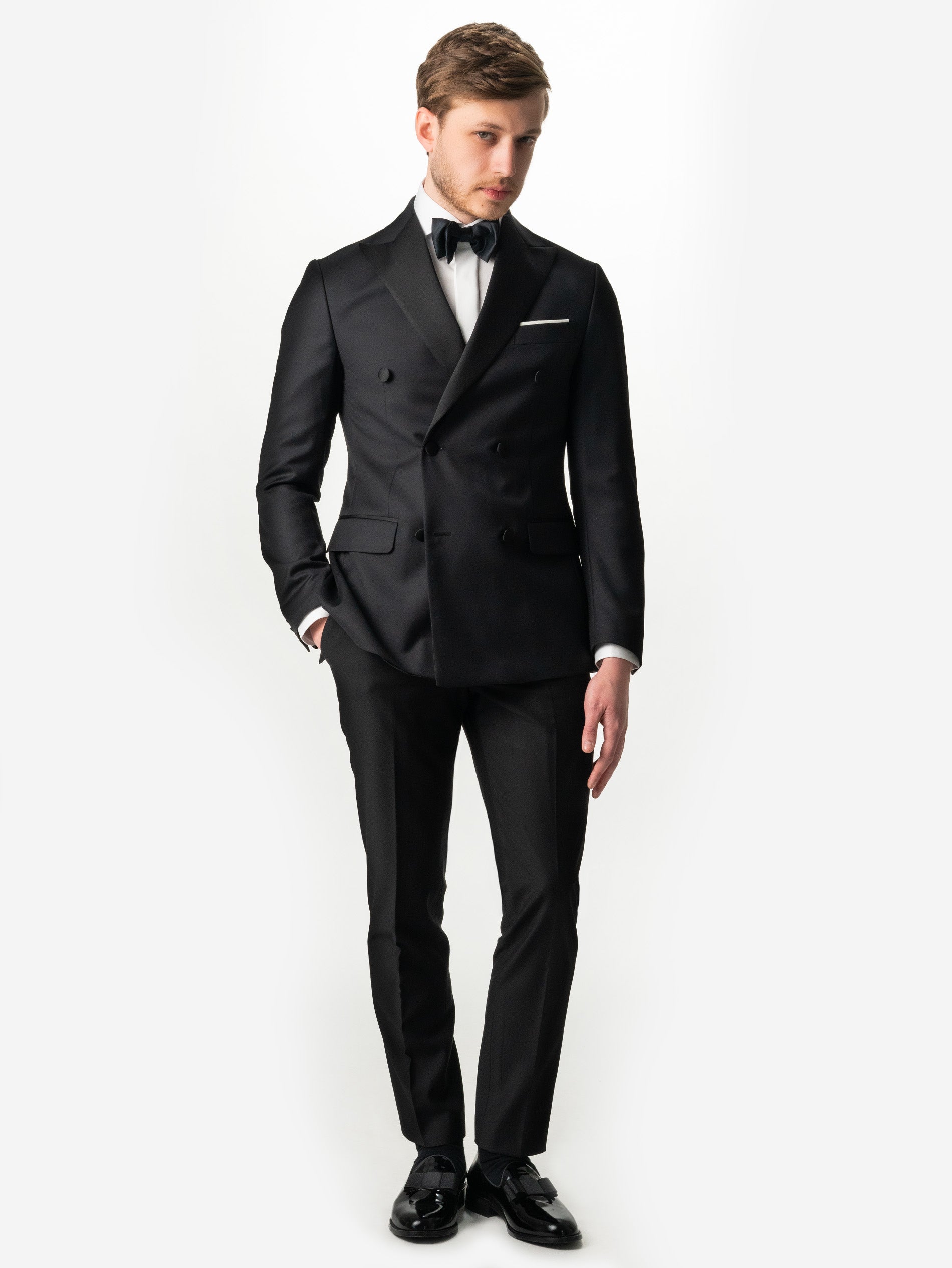 Costumul de mire negru formal tip smoking, la două rânduri, este un exemplu clasic de eleganță și rafinament. Este ideal pentru mirele care dorește un aspect elegant și rafinat în timpul ceremoniilor de vară. Acesta este fabricat din stofa italiana Sarto creata din amestec de 88% lana cu 10% Viscoza si 2%Ea. Sacoul are un croi modern și bine definit, cu umeri structurați, și este prevăzut cu rever clasic. Acesta se închide cu un singur rând de nasturi și are buzunare laterale, oferindu-ți spațiu pentru a păstra lucrurile personale necesare în timpul evenimentului. Pantaloni clasic formal, asortați sunt croiți într-un stil comfort fit, care conferă un aspect elegant și contemporan. Aceștia au buzunare laterale și buzunare false la spate. Talia conține găici decorative si nasture satinat iar în partea din față este prevăzută cu fermoar și nasture pentru o fixare sigură și confortabilă.
