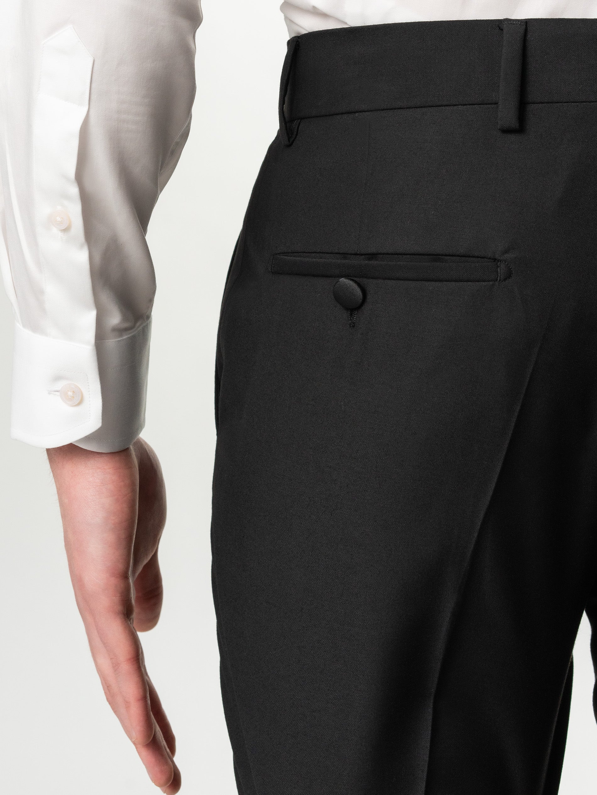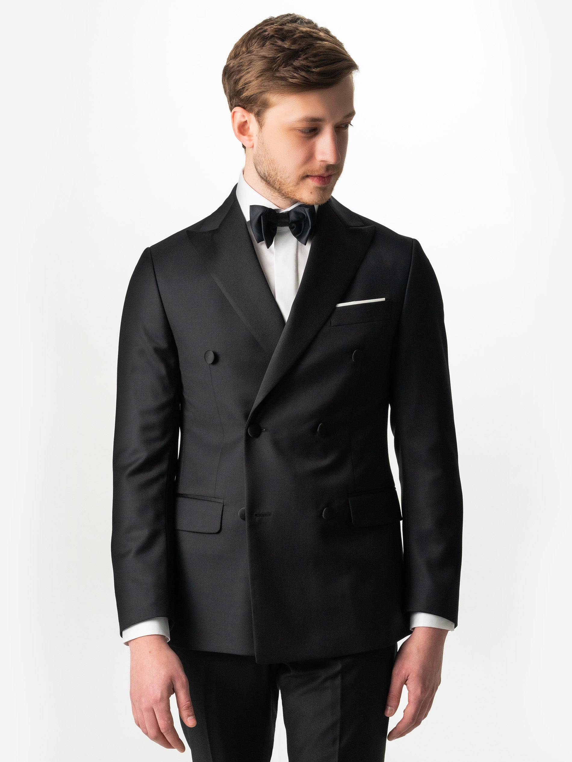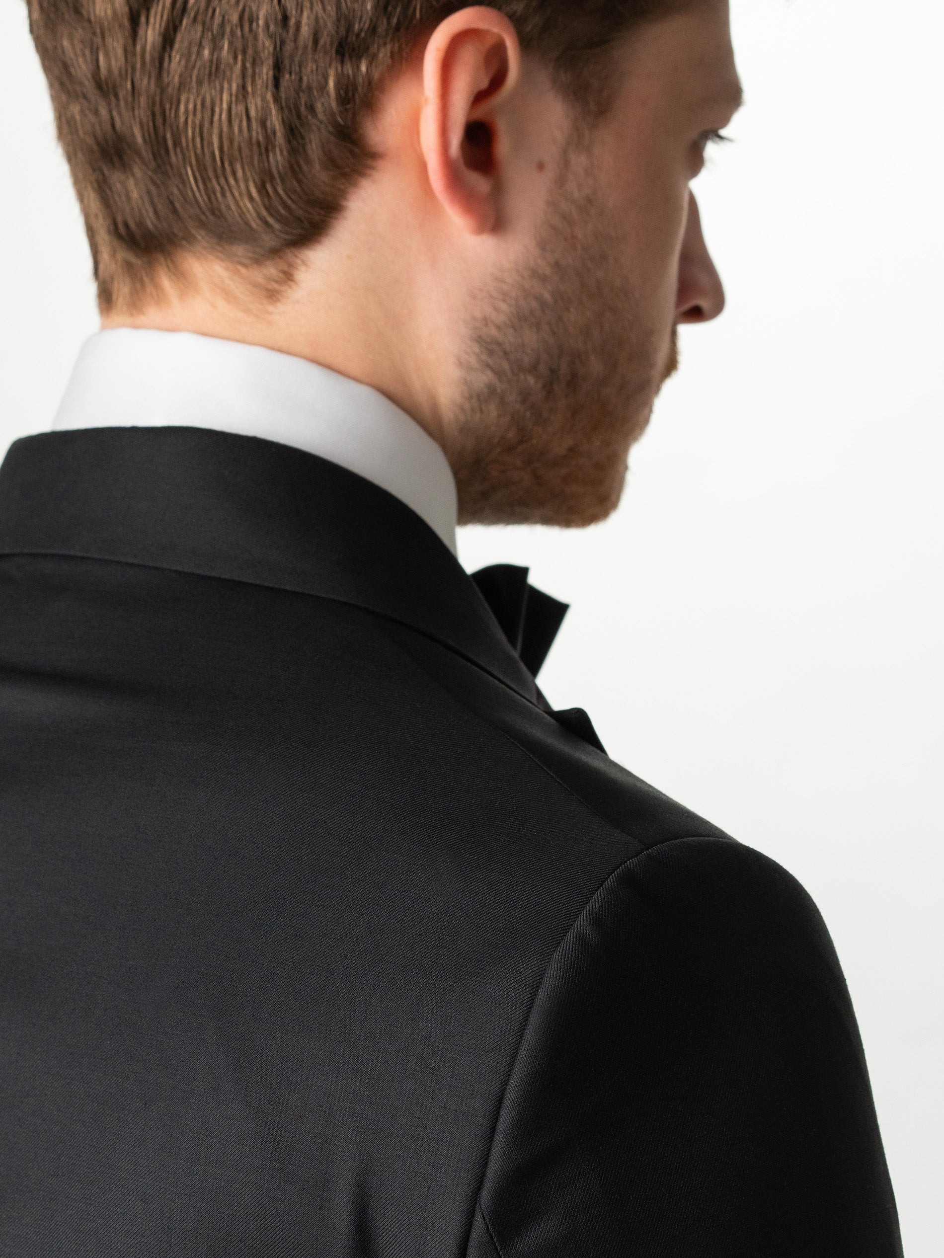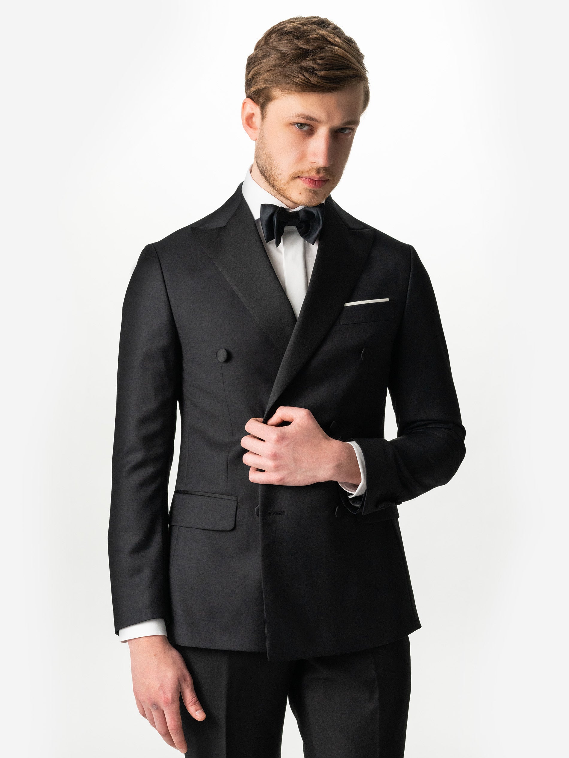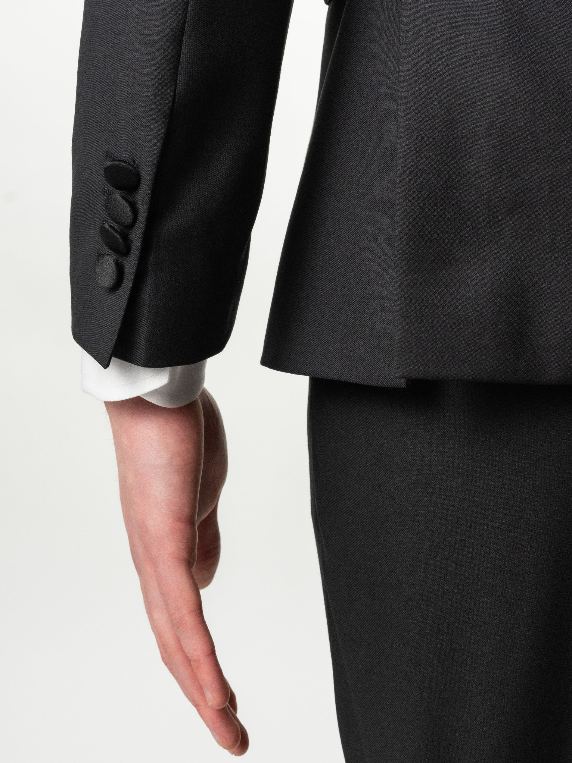 Costumul de mire negru formal tip smoking, la două rânduri, este un exemplu clasic de eleganță și rafinament. Este ideal pentru mirele care dorește un aspect elegant și rafinat în timpul ceremoniilor de vară. Acesta este fabricat din stofa italiana Sarto creata din amestec de 88% lana cu 10% Viscoza si 2%Ea. Sacoul are un croi modern și bine definit, cu umeri structurați, și este prevăzut cu rever clasic. Acesta se închide cu un singur rând de nasturi și are buzunare laterale, oferindu-ți spațiu pentru a păstra lucrurile personale necesare în timpul evenimentului. Pantaloni clasic formal, asortați sunt croiți într-un stil comfort fit, care conferă un aspect elegant și contemporan. Aceștia au buzunare laterale și buzunare false la spate. Talia conține găici decorative si nasture satinat iar în partea din față este prevăzută cu fermoar și nasture pentru o fixare sigură și confortabilă.
