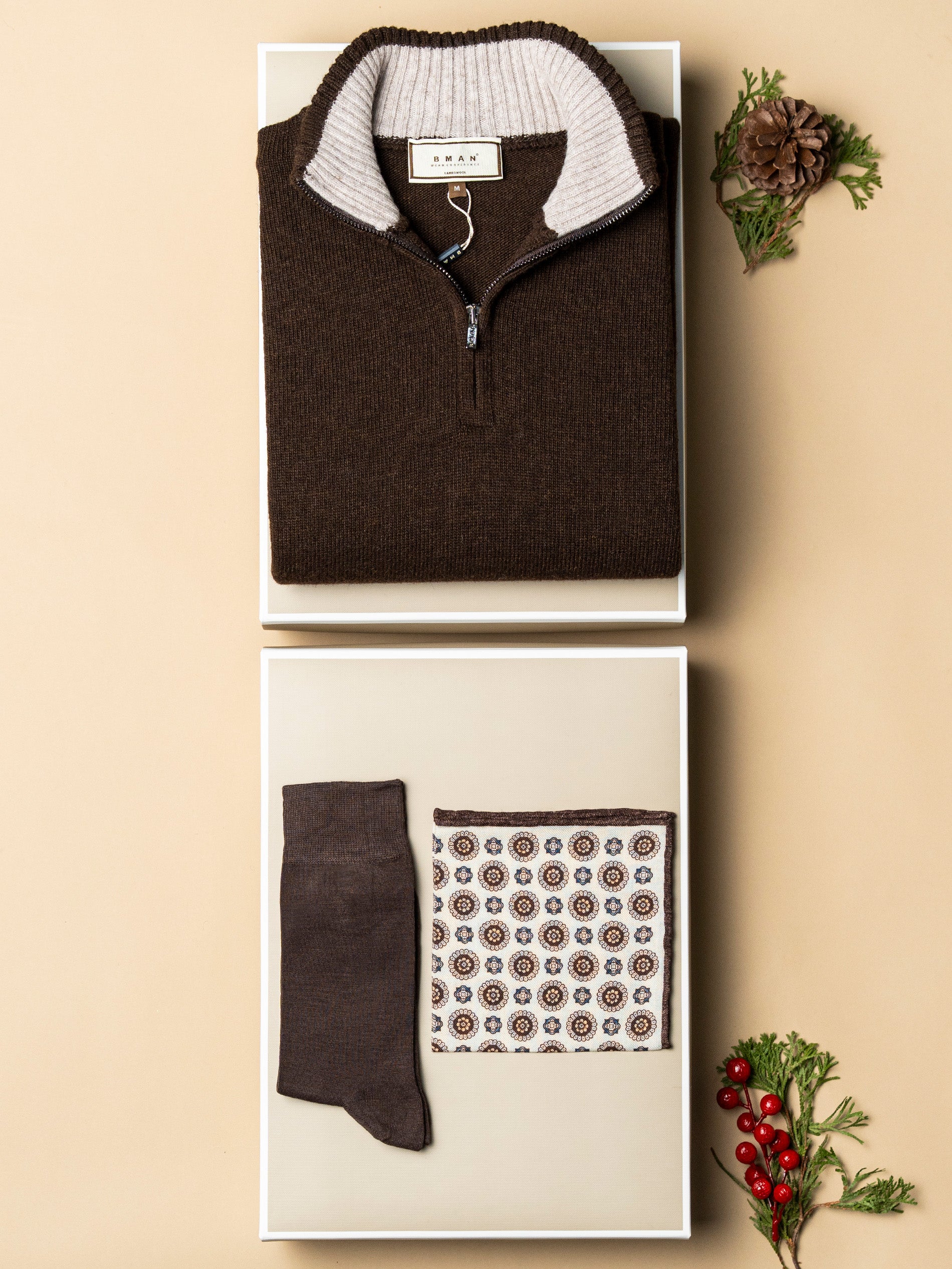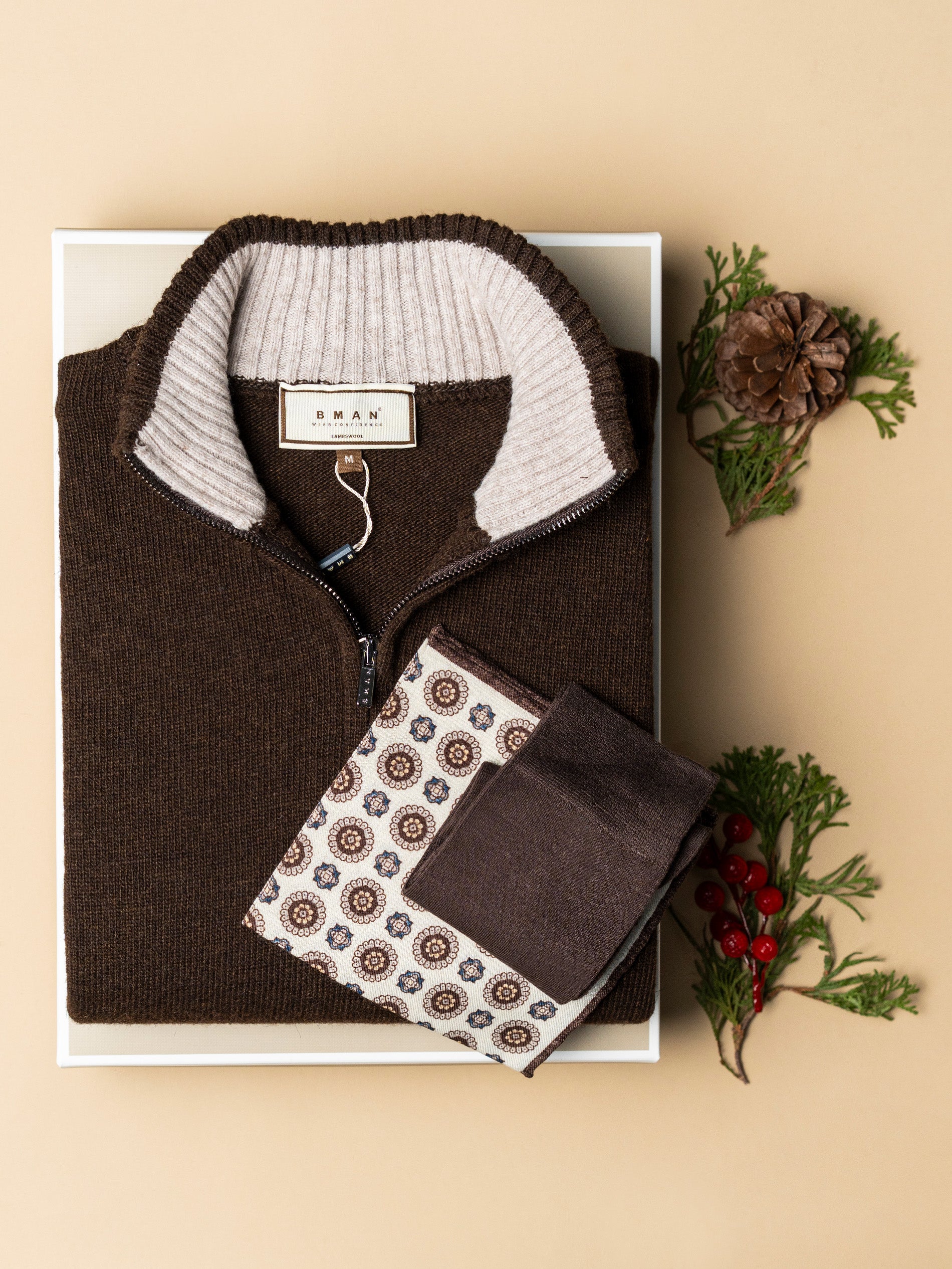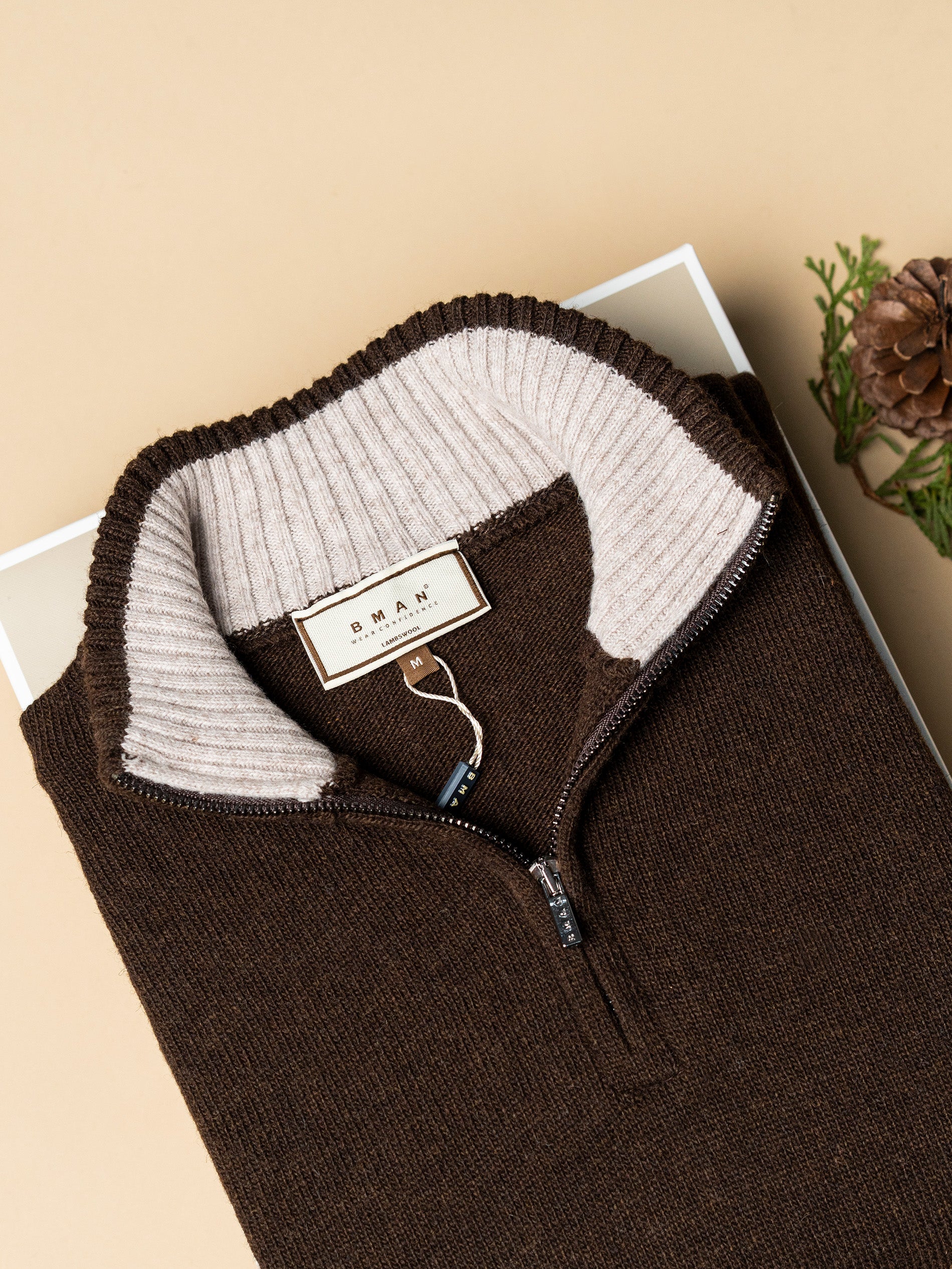 • 1. Pulover Barbati Cafeniu Cu Fermoar 100% Lana Lambswool BMan0035, gandit pentru confort autentic si un aspect curat, modern. Textura fina a tricotului creeaza o senzatie placuta la purtare, iar contrastul discret al mansetelor si al tivului aduce un plus de rafinament.