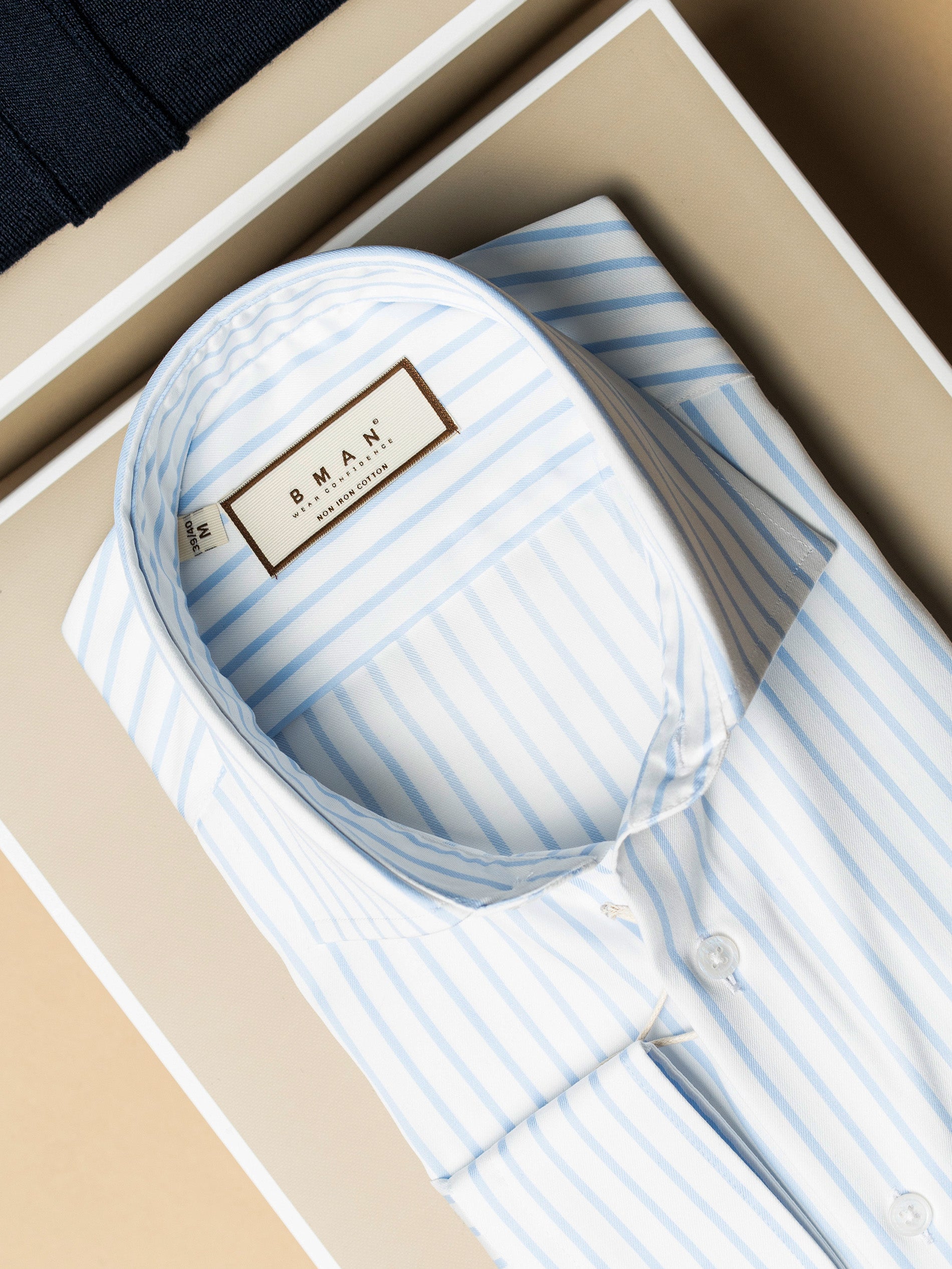 • 2. Camasa Barbati Premium Confort Fit Non Iron Alba Cu Dungi Bleu BMan0063 este confectionata din 100% bumbac natural de inalta calitate, ceea ce o face confortabila si respirabila, perfecta pentru o varietate de ocazii sau evenimente formale de seara.
