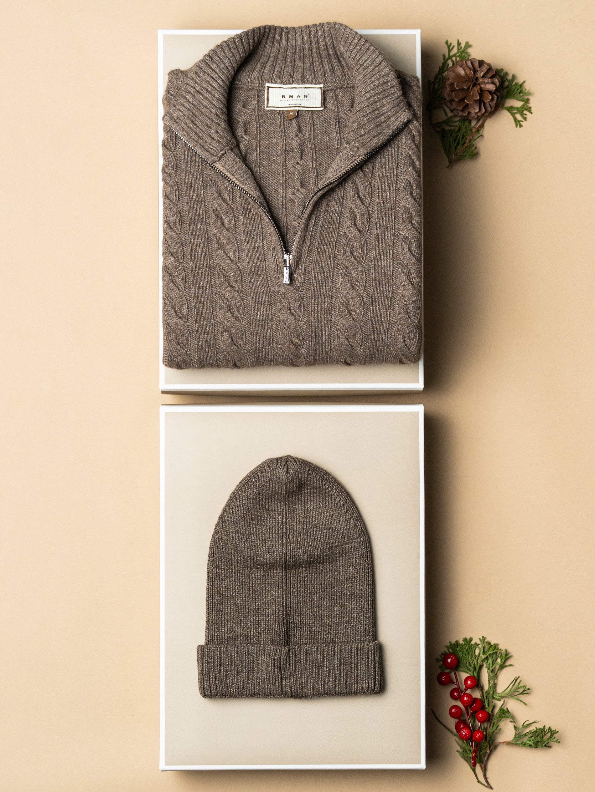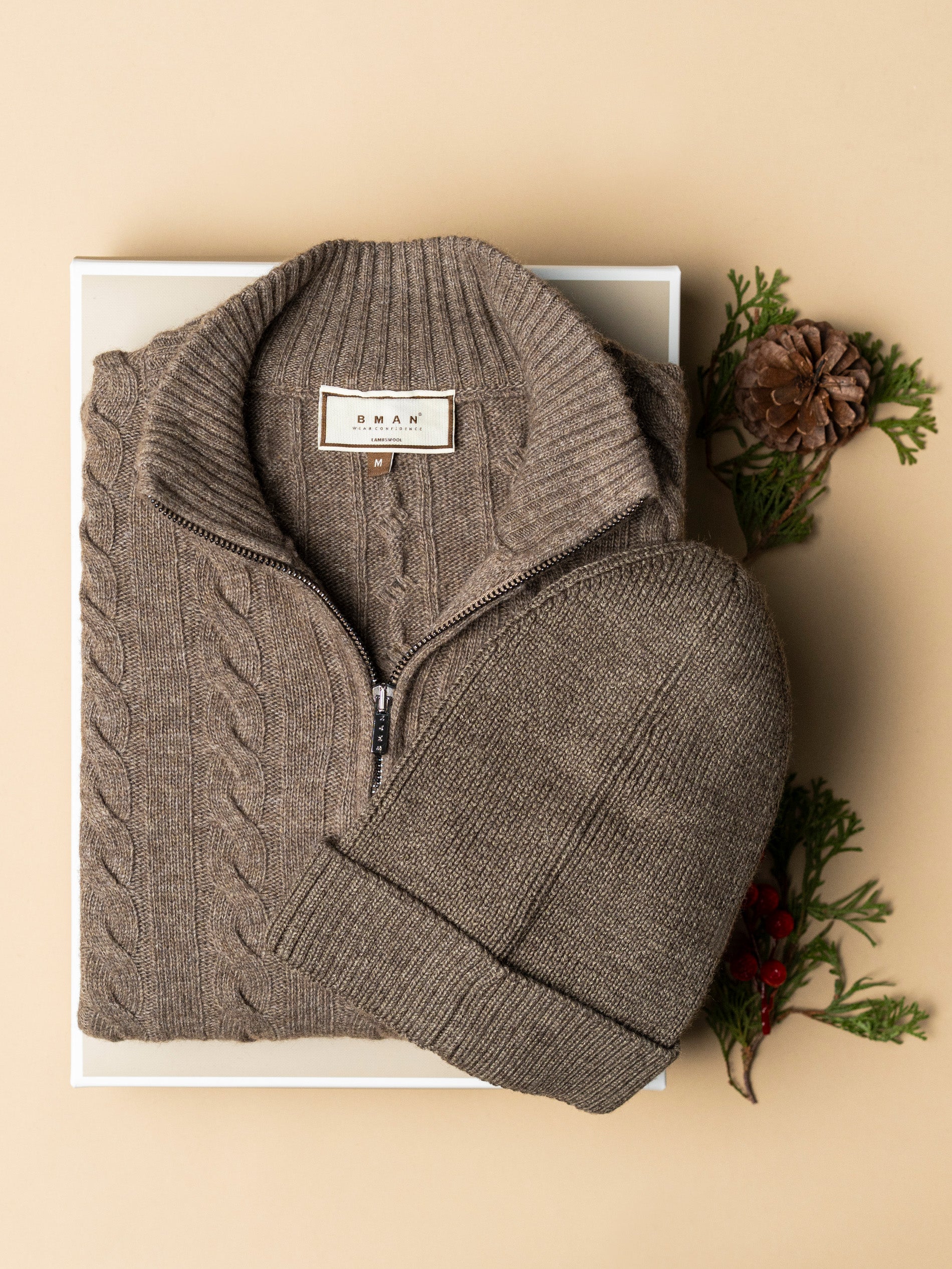 • 1. Pulover Barbati Torsade Maro Taupe Cu Fermoar 100% Lana Lambswool BMan0034, construit intr-o textura clasica cu torsade, care ofera o senzatie autentica de caldura si structura.