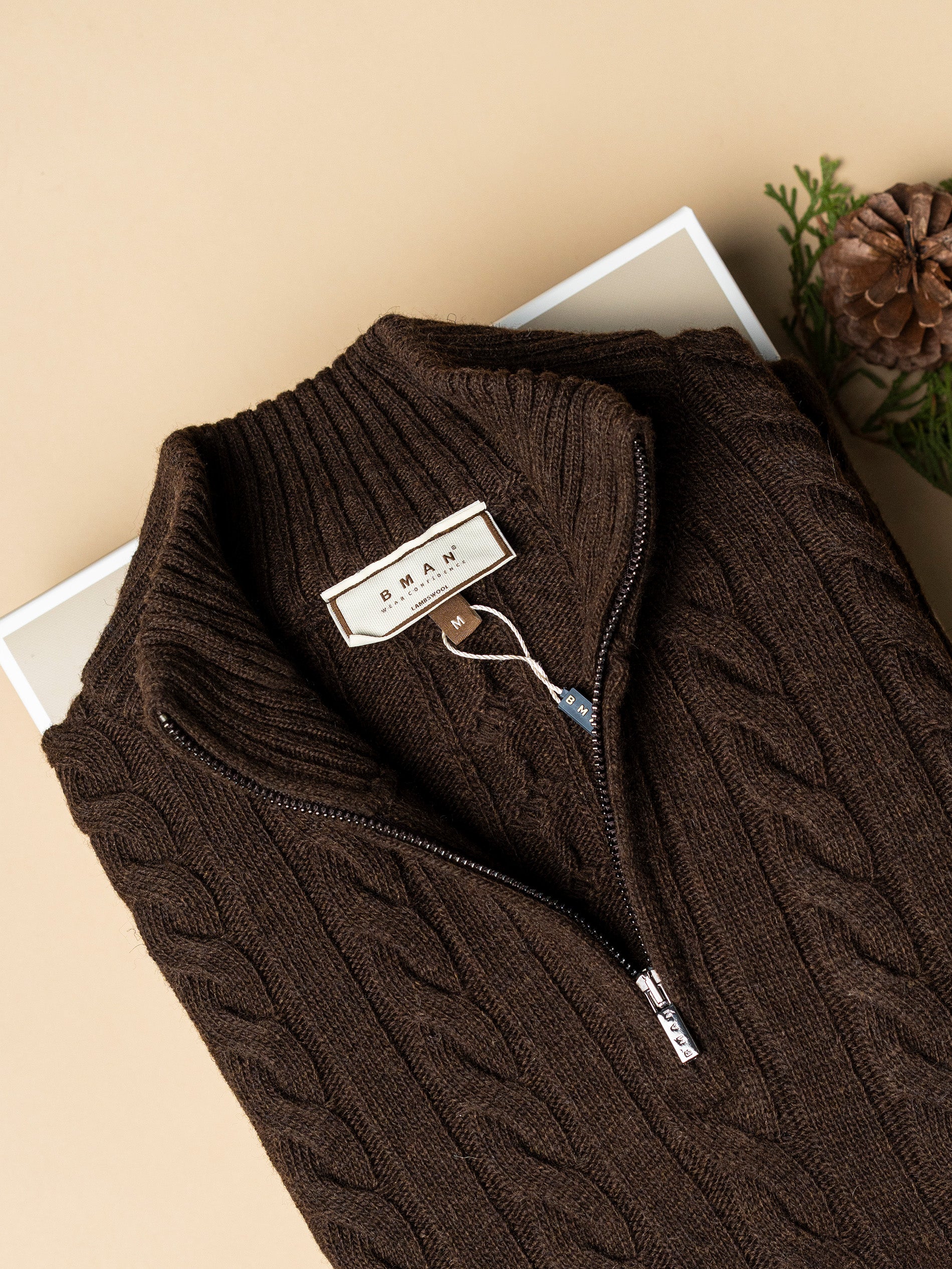• 1. Pulover Barbati Torsade Cafeniu Cu Fermoar 100% Lana Lambswool BMan0034, construit intr-o textura clasica cu torsade, care ofera o senzatie autentica de caldura si structura.