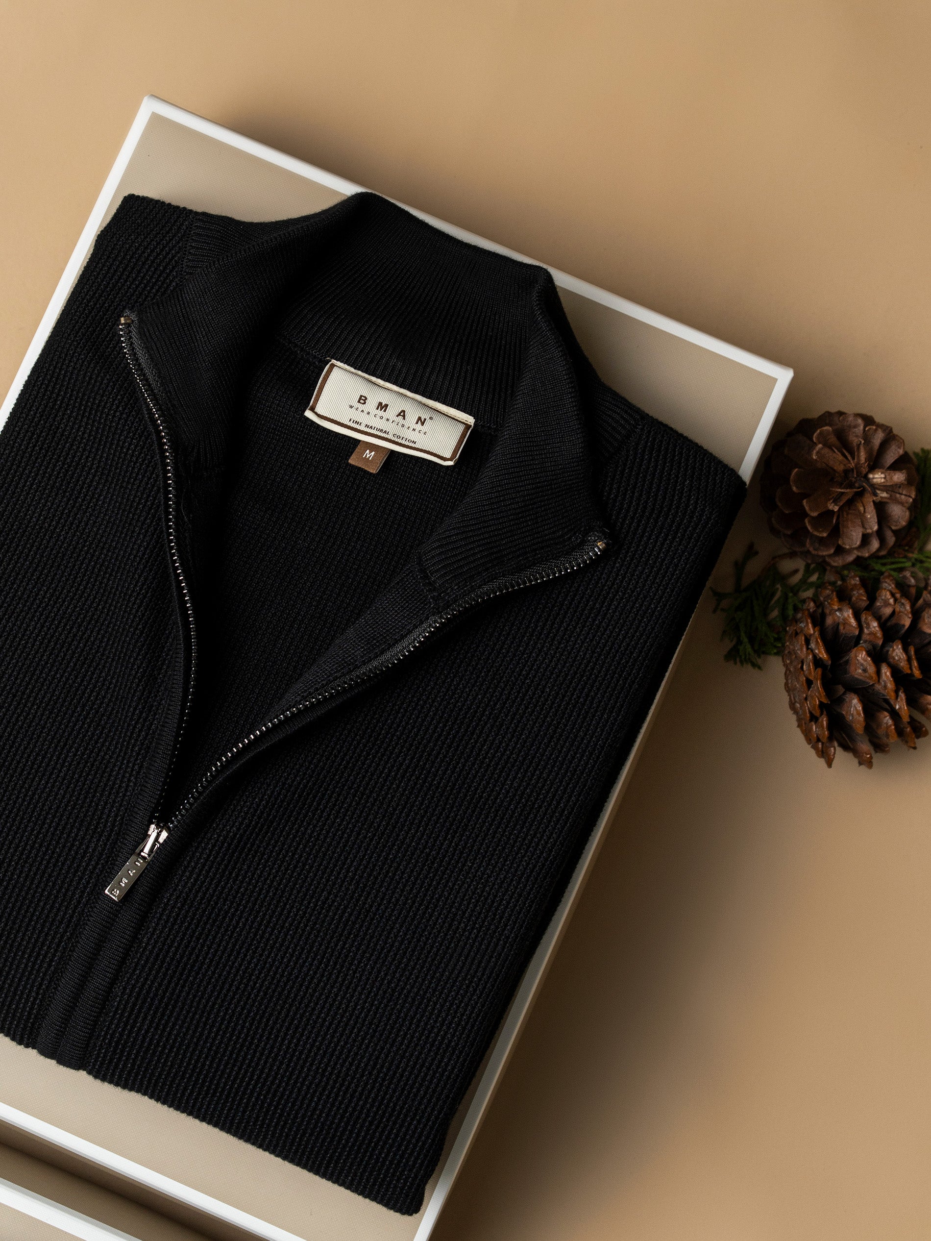 • 1. Pulover Barbati Negru Cu Fermoar 100% Bumbac BMan0029 este definitia confortului rafinat: tricotajul fin din bumbac 100% are o textura discreta, cu nervuri subtile care contureaza o silueta eleganta si moderna.