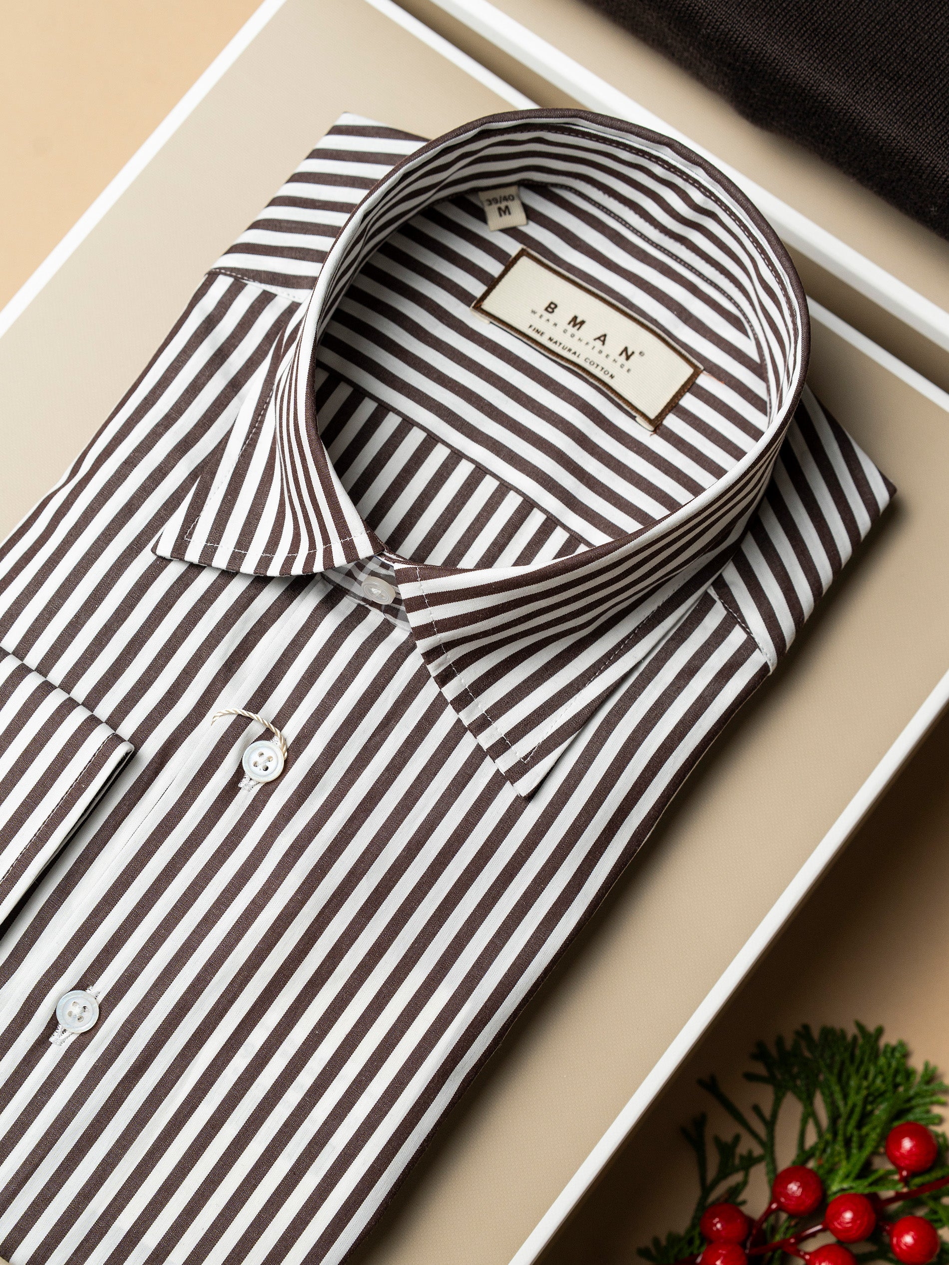• 2. Camasa Barbati Alba cu Dungi Cafenii Smart Casual BMan0002 este confectionata dintr-o tesatura de bumbac, material usor de calcat ce nu se sifoneaza in timpul purtarii. Un alt avantaj o reprezinta faptul ca-si pastrezeaza o atingere fina si o elasticitate minima pentru un confort sporit.