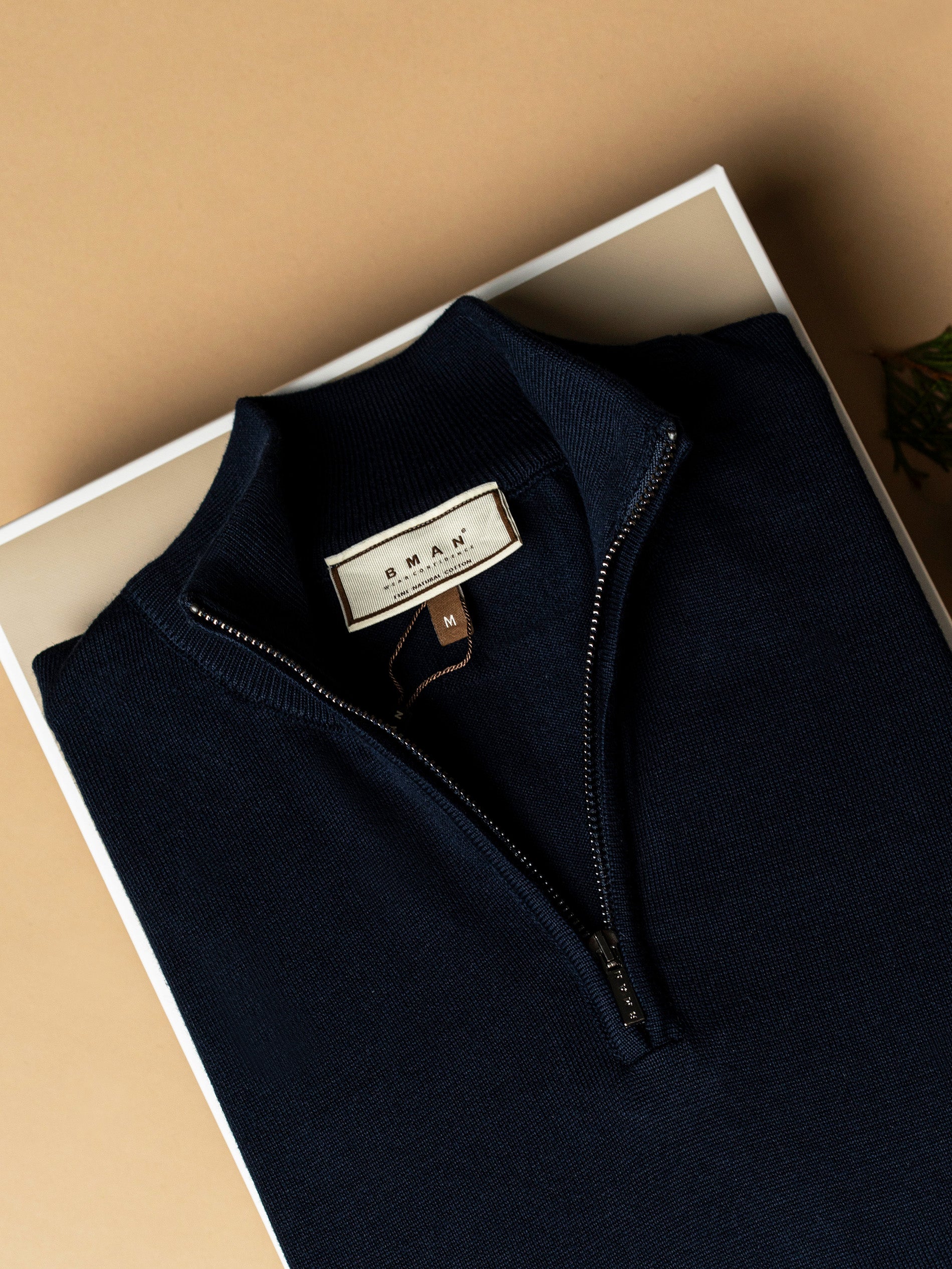 • 1. Pulover Cu Fermoar Barbati Bleumarin Bumbac Parma Cottone BMan0001 redefinește confortul și stilul în modul cel mai sofisticat. Fabricat din 100% Bumbac tricotat natural, marca Levent Cottone (tricot spaniol) acest pulover cu fermoar  îmbină calitatea spaniolă cu rafinamentul tradiției.