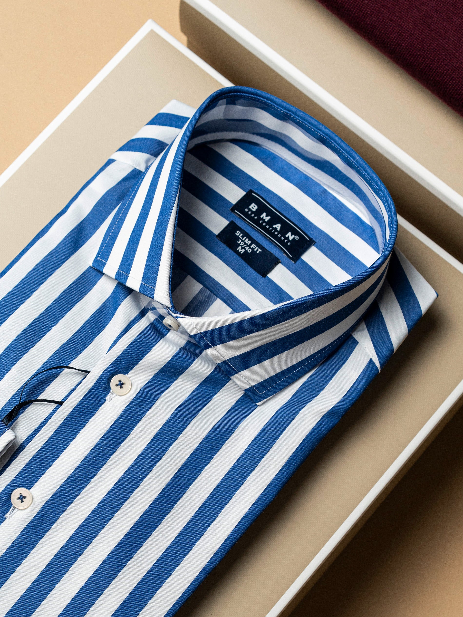 • 2. Camasa Barbati Albastru În Dungi Guler Deschis ( Semi-Spread) Bman0016, este confectionata din 100% bumbac, ceea ce o face confortabila si respirabila, perfecta pentru o varietate de ocazii sau evenimente de de zi sau non-formale de seara.