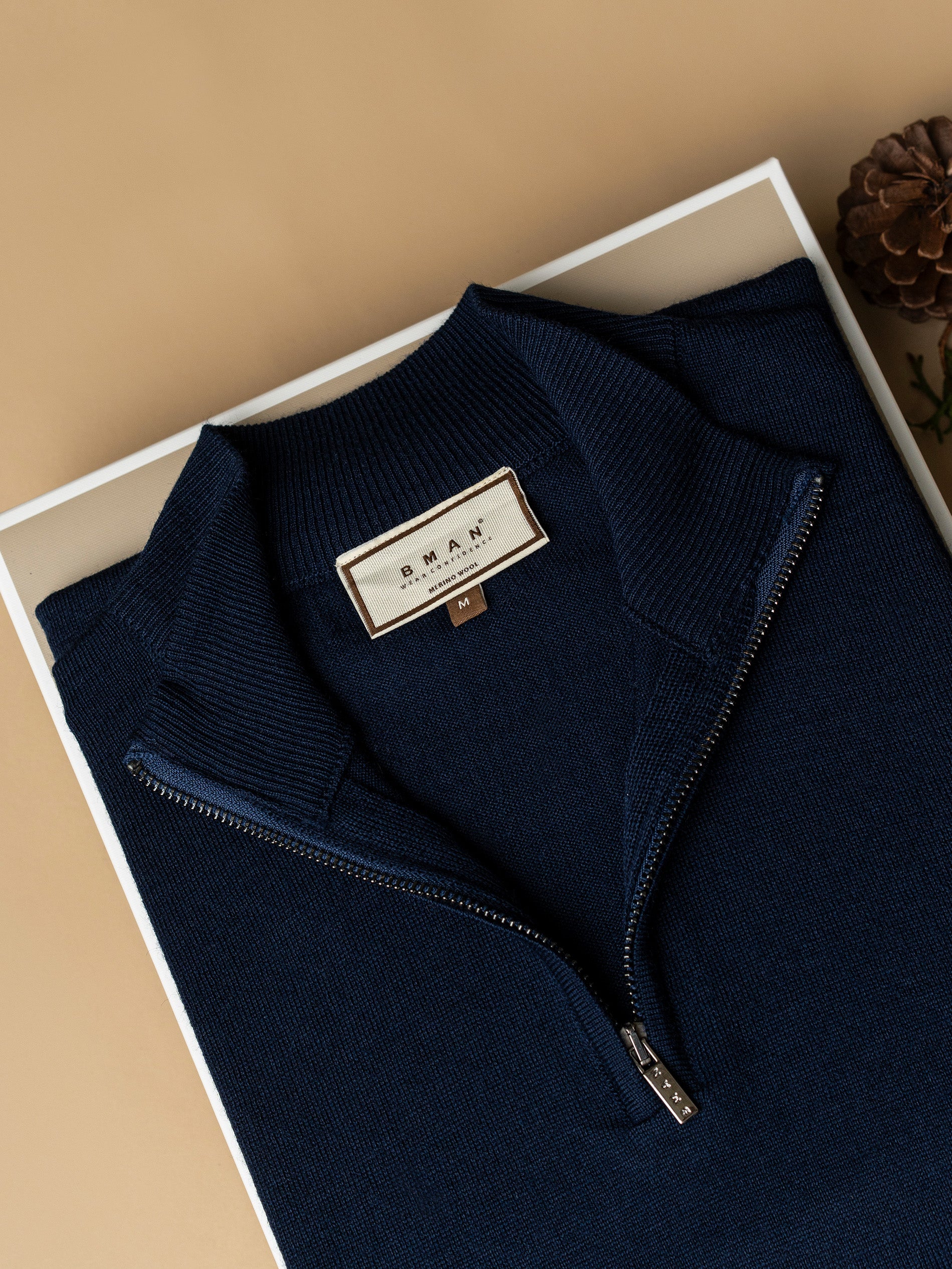 • 1. Pulover Cu Fermoar Office Barbati Bleumarin Din Lana Merinos Falco BMan0003, un esențial pentru sezonul racoros de toamnă și iarnă, perfect adaptat pentru mediul de birou, business, și nu numai.