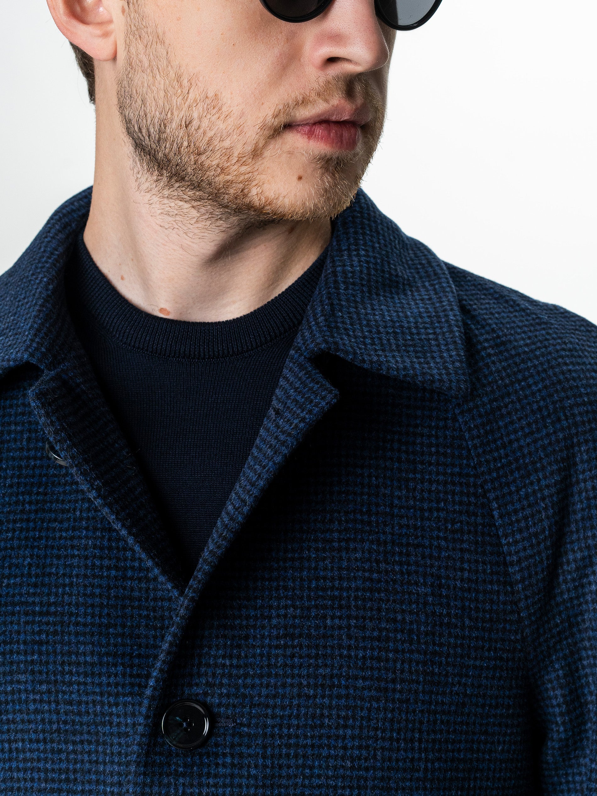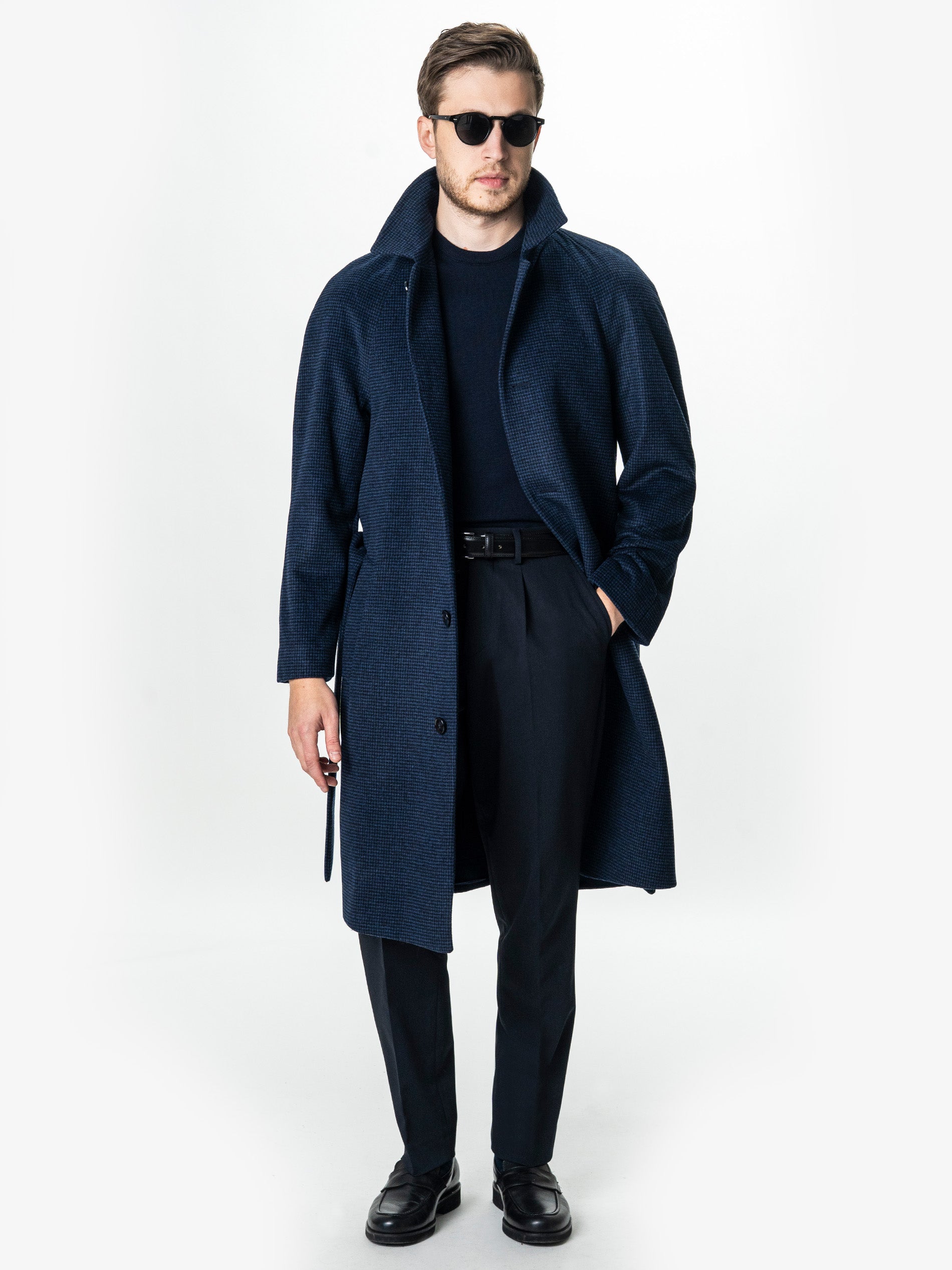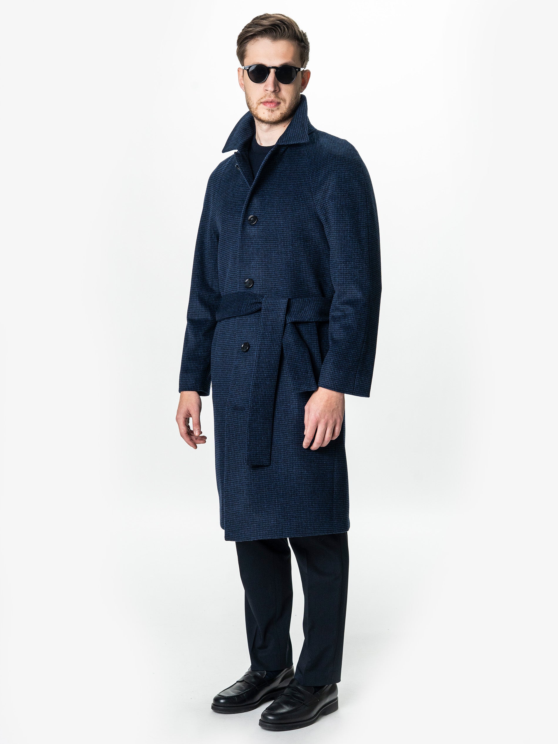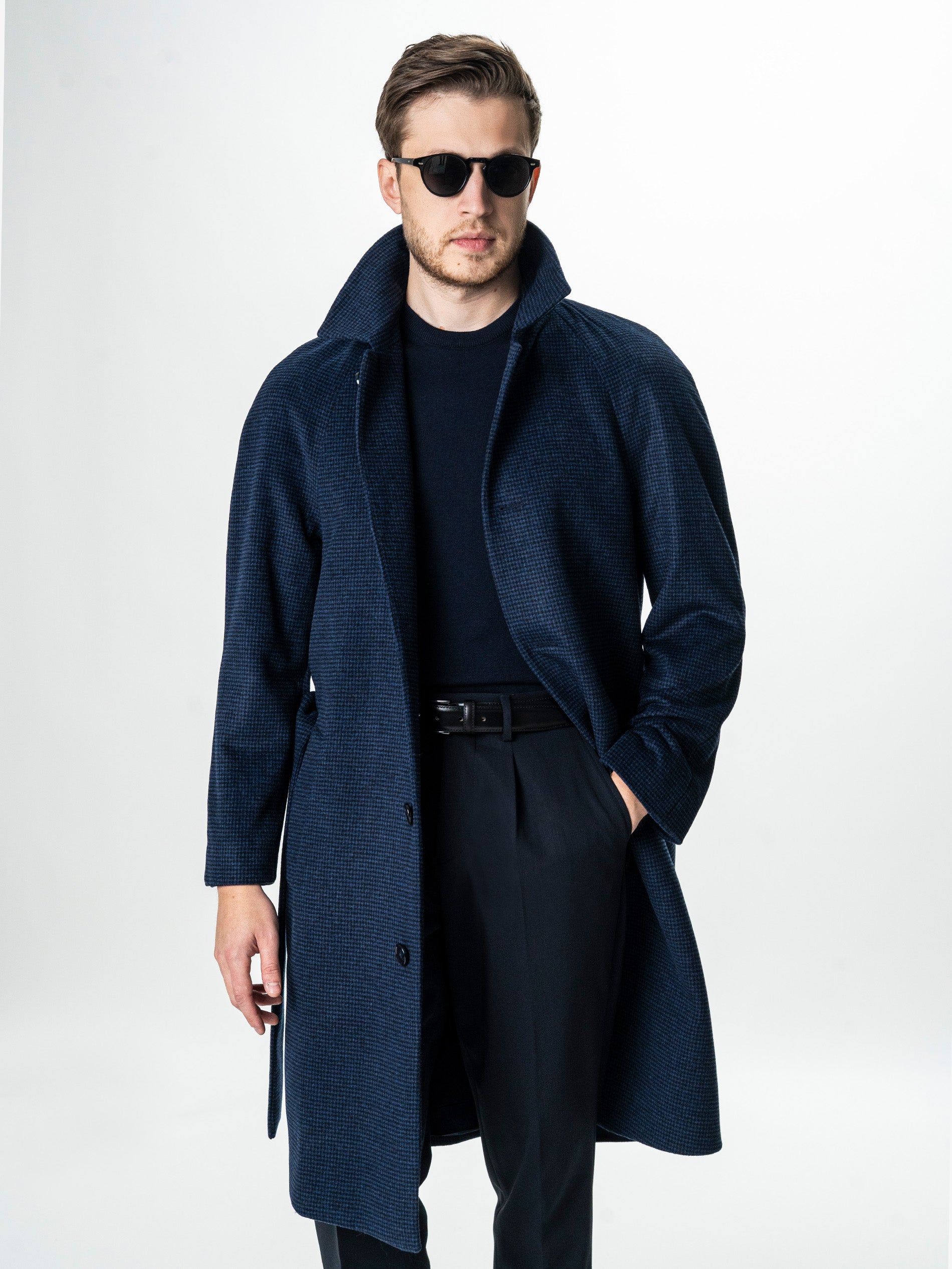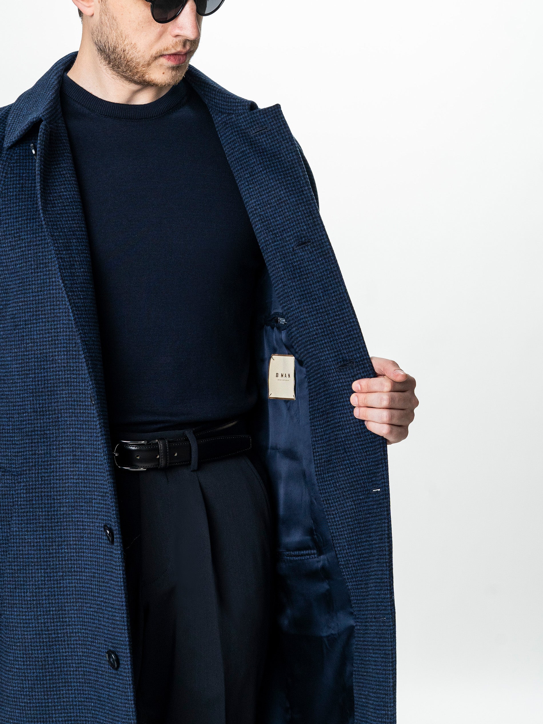 Eleganta functionala defineste acest palton din lana 100%, realizat intr-un rafinat model houndstooth in nuante de bleumarin si negru. Croiala dreapta, completata de umeri raglan fara cusaturi, ofera libertate naturala de miscare si o linie fluida, specifica paltoanelor de inspiratie sartoriala italiana. Inchiderea frontala cu nasturi este insotita de un cordon detasabil, ce permite reglarea taliei in functie de preferinta – fie intr-o purtare structurata, fie intr-una relaxata. Lungimea peste genunchi asigura protectie in sezonul rece, mentinand in acelasi timp un aspect echilibrat si rafinat. Un palton conceput pentru barbatul care apreciaza calitatea materialului si precizia detaliilor.