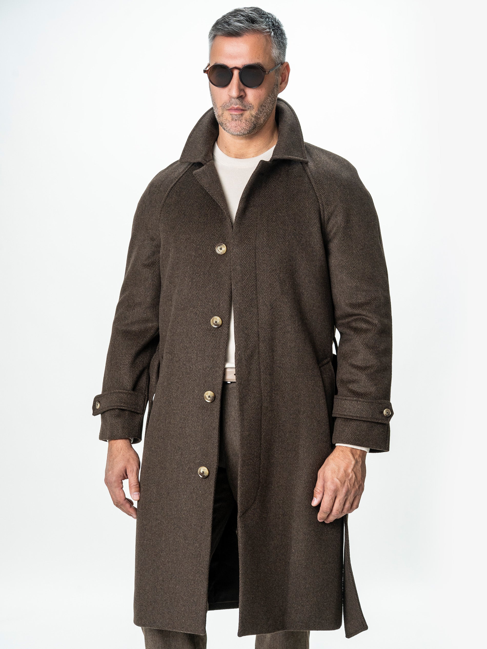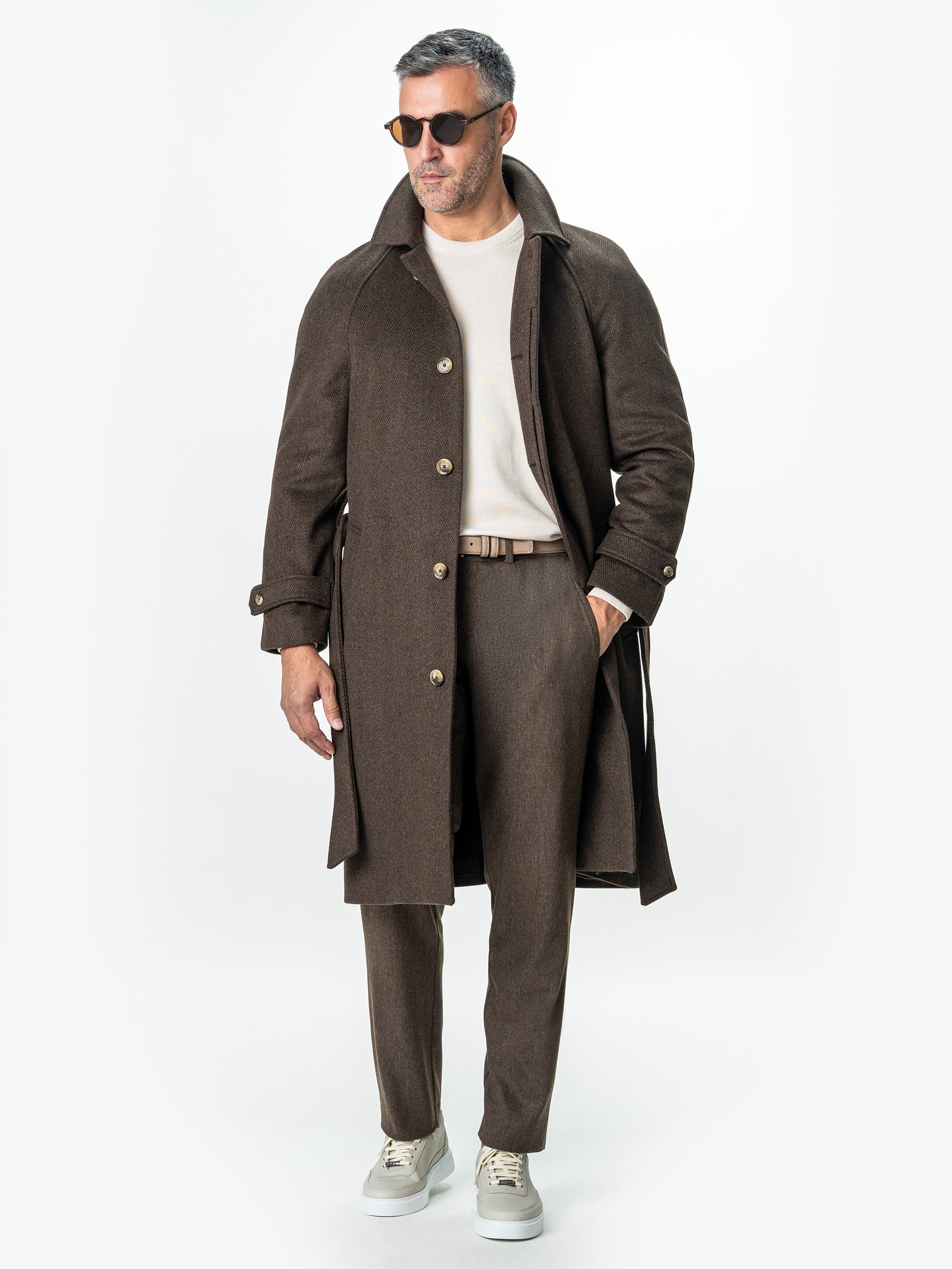 Acest palton din lana 100%, realizat dintr-o tesatura twill cu diagonale fine vizibile, imbina durabilitatea materialului cu o estetica rafinata. Linia dreapta este echilibrata de umerii raglan fara cusaturi, care confera o pozitie naturala si eleganta a corpului. Inchiderea ascunsa in fata mentine un aspect curat, iar cordonul din acelasi material ofera posibilitatea de ajustare a taliei in functie de stilul dorit – strans pentru o tinuta structurata sau lejer pentru un look casual. Mansetele sunt finisate cu bride si nasturi functionali, adaugand un plus de caracter utilitar discret. Lungimea sub genunchi asigura protectie termica si proportii impecabile pentru orice tip de incaltaminte, de la pantofi clasici la sneakers premium.