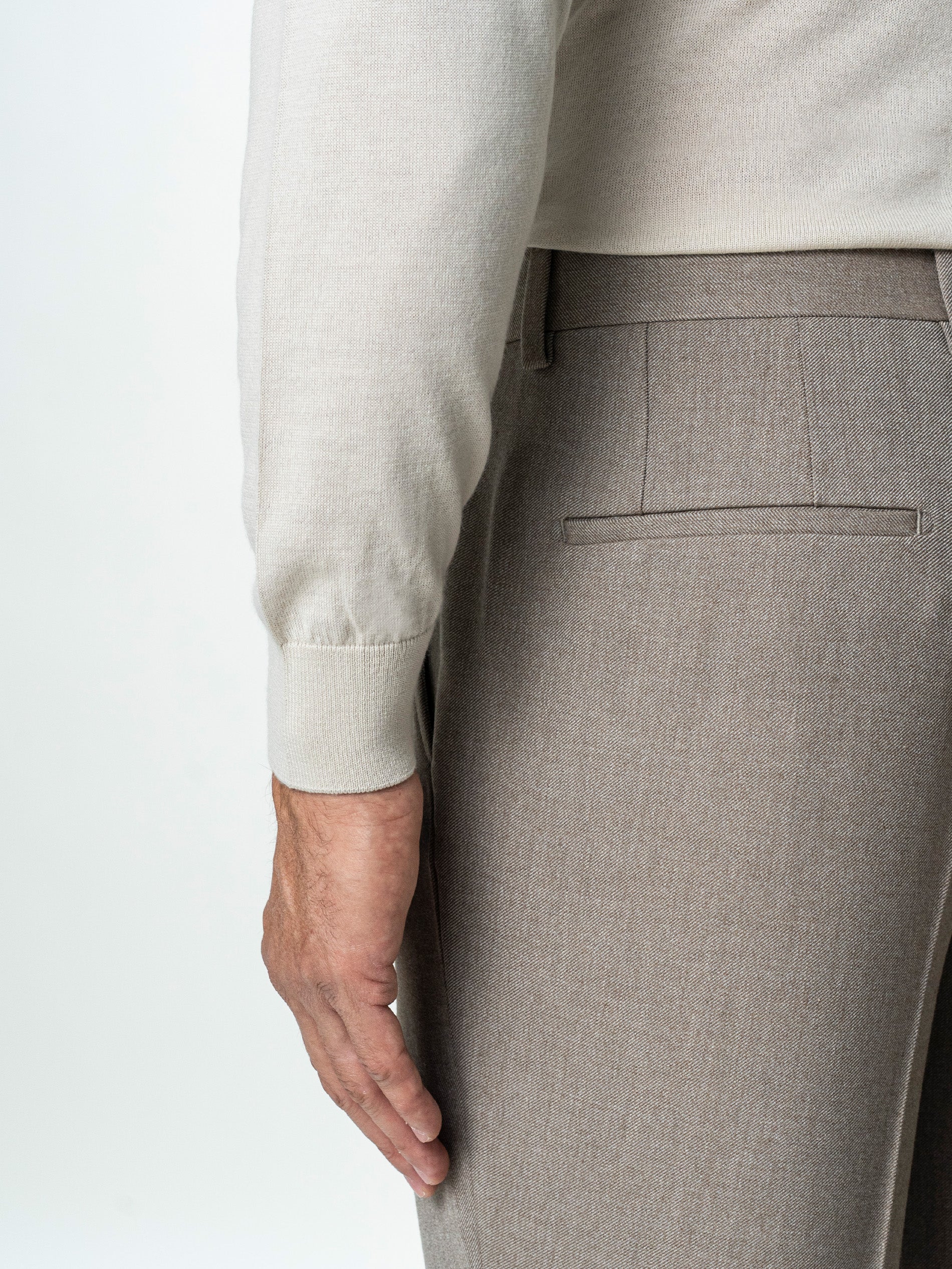 Pantalonii Eleganti Barbati Bej Din Lana Pentru Toamna BMan0103 cu o compozitie echilibrata pentru confort si structura sunt conceputi pentru tinute smart casual sau business relaxat. Materialul plin, potrivit pentru sezonul rece, pastreaza un aspect elegant datorita dungii frontale bine definite si croielii lejere cu pense. Talia permite purtarea atat cu curea, cat si fara, in functie de stil.