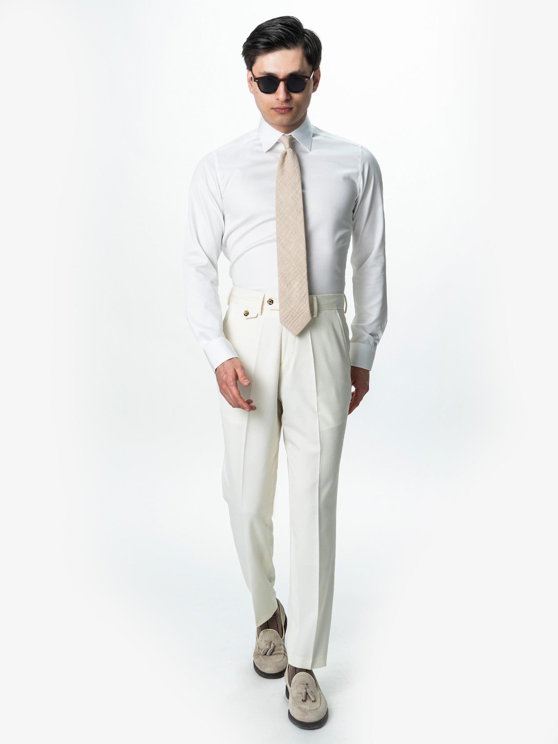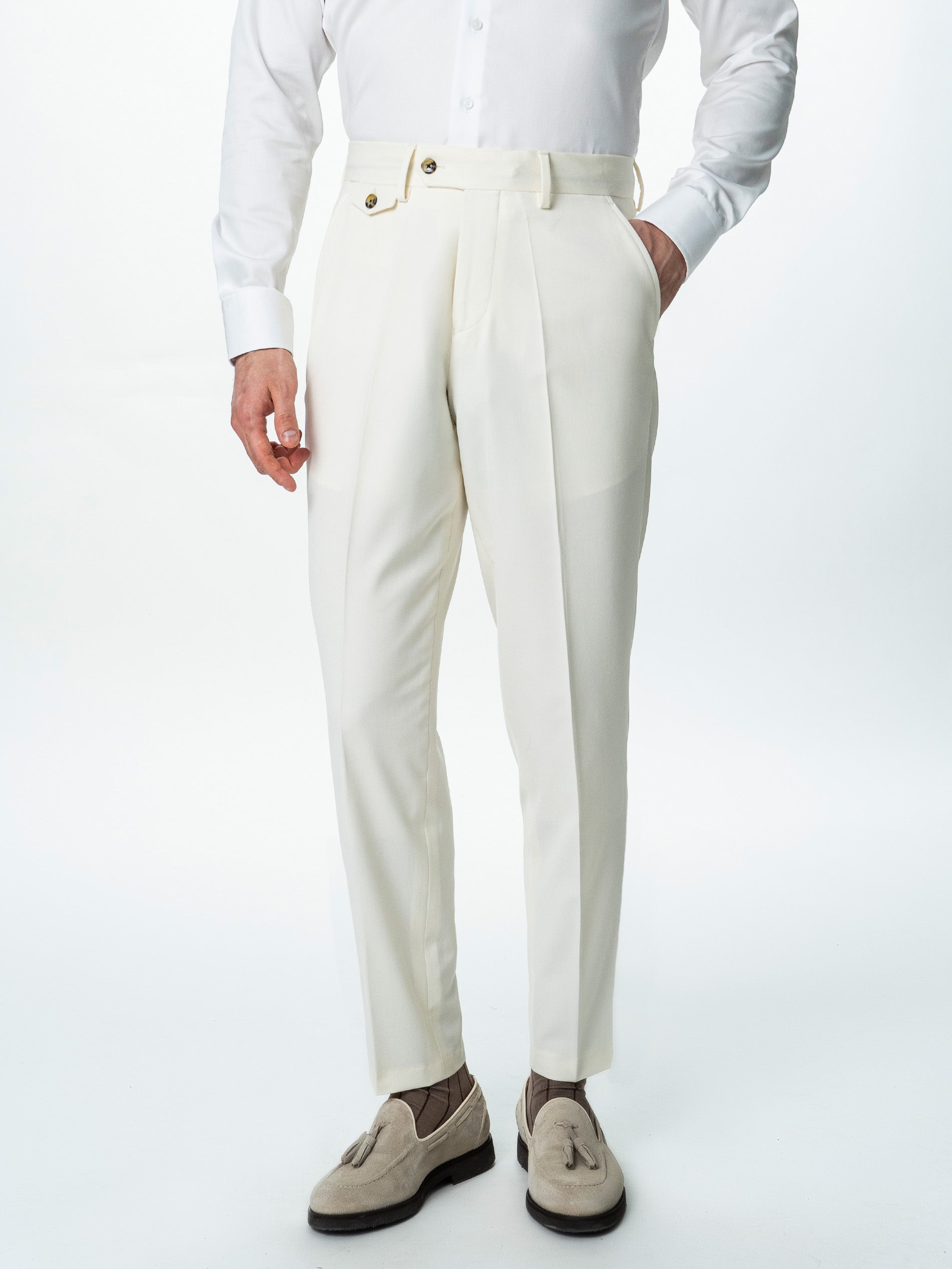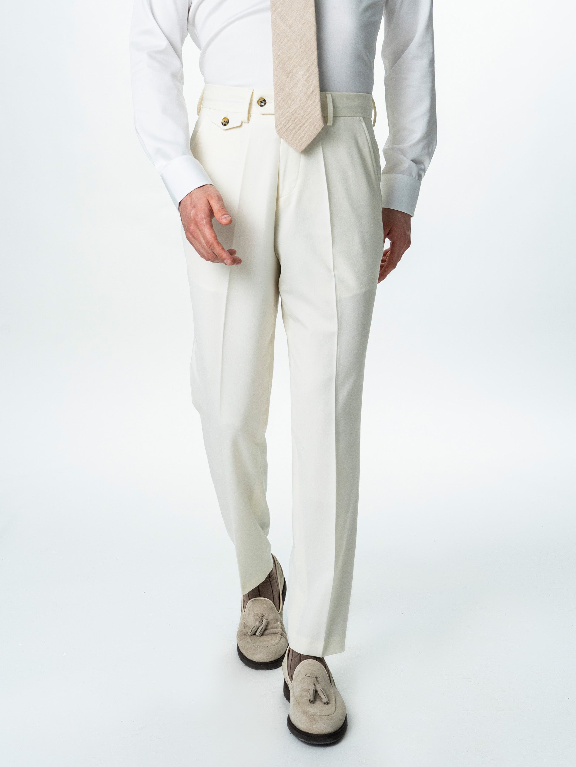 Pantaloni Barbati Crem Cu Talie Inalta Din Lana BMan0002 sunt definiti de lejeritate, rafinament si atentie la detalii. Talia inalta si sistemul de inchidere laterala ofera o linie curata in partea frontala, evidentiind pliul si alungind vizual silueta. Croiala este gandita pentru confort, dar pastreaza o linie eleganta, potrivita atat pentru tinute smart-elegant, cat si pentru combinatii de vara cu sacou sau camasa. Compozitia din 86% lana, 10% poliester si 4% licra ofera echilibrul ideal intre aspectul natural al lanii, rezistenta materialului si elasticitatea necesara pentru confort in miscare. Materialul are o cadere fluida, iar constructia cu talie inalta si pliuri frontale ofera o estetica clasica reinterpretata intr-o maniera moderna.