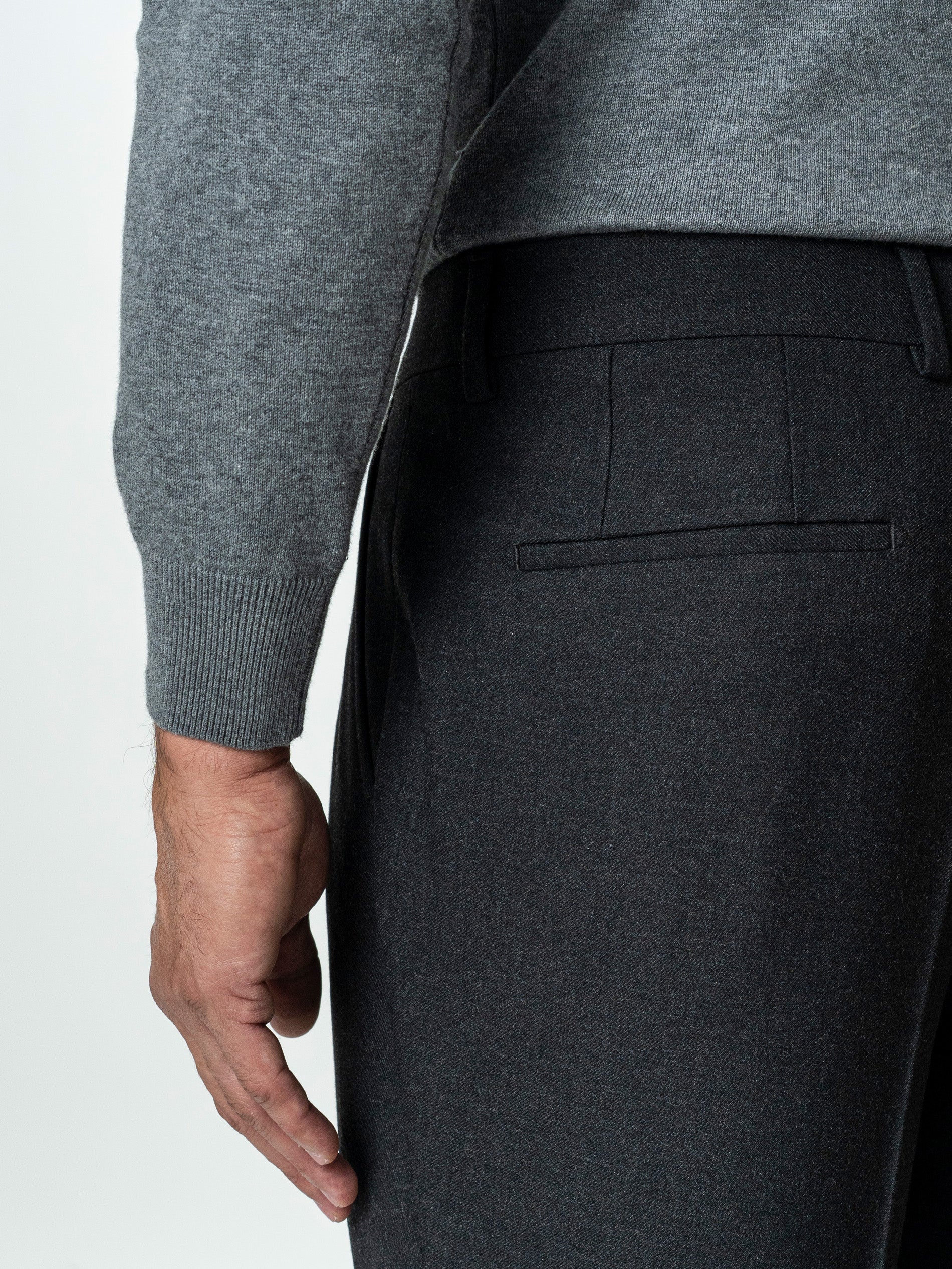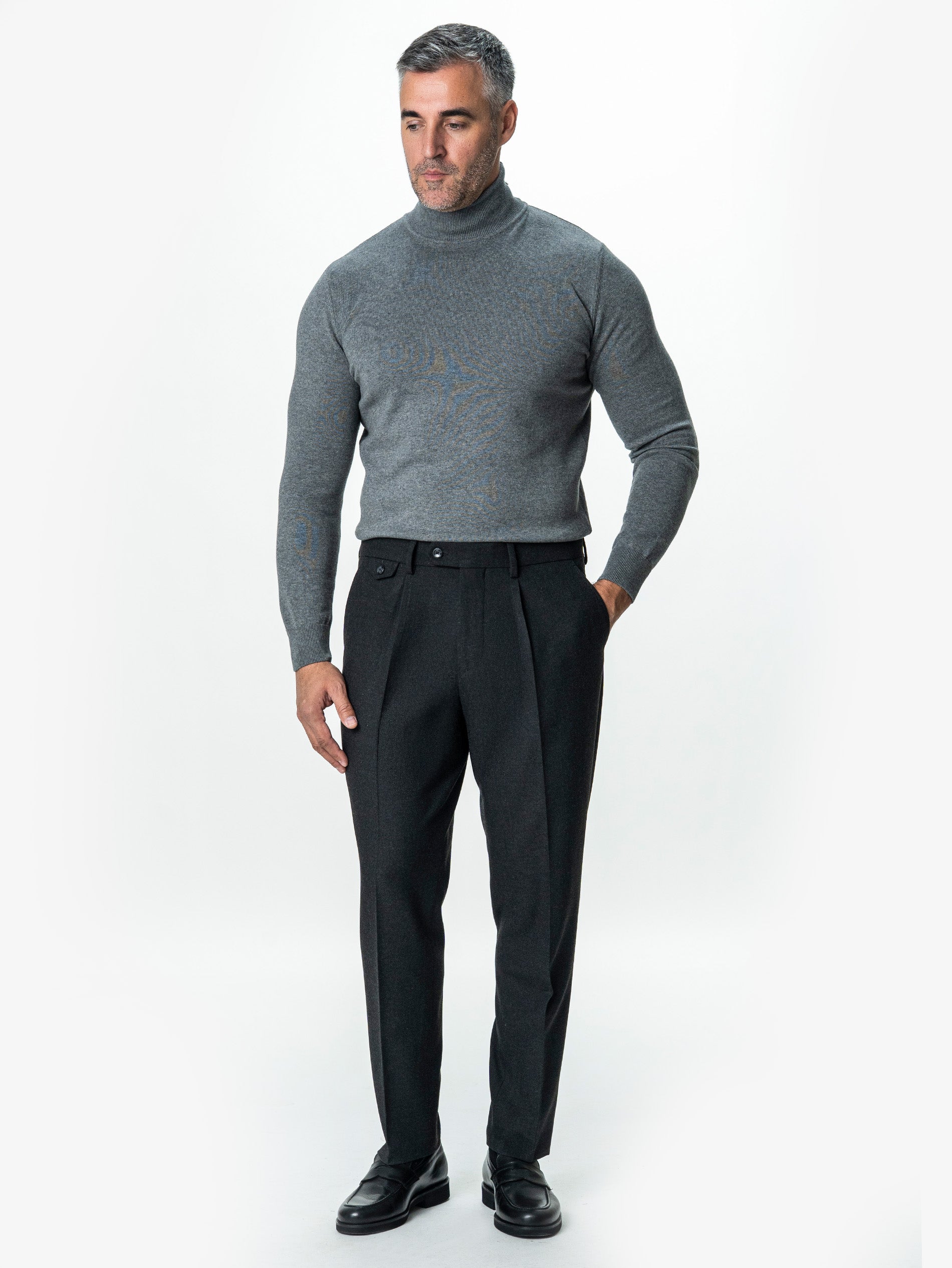 Pantalonii Eleganti Barbati Gri Inchis Din Lana Pentru Toamna BMan0103 cu o compozitie echilibrata pentru confort si structura sunt conceputi pentru tinute smart casual sau business relaxat. Materialul plin, potrivit pentru sezonul rece, pastreaza un aspect elegant datorita dungii frontale bine definite si croielii lejere cu pense. Talia permite purtarea atat cu curea, cat si fara, in functie de stil.