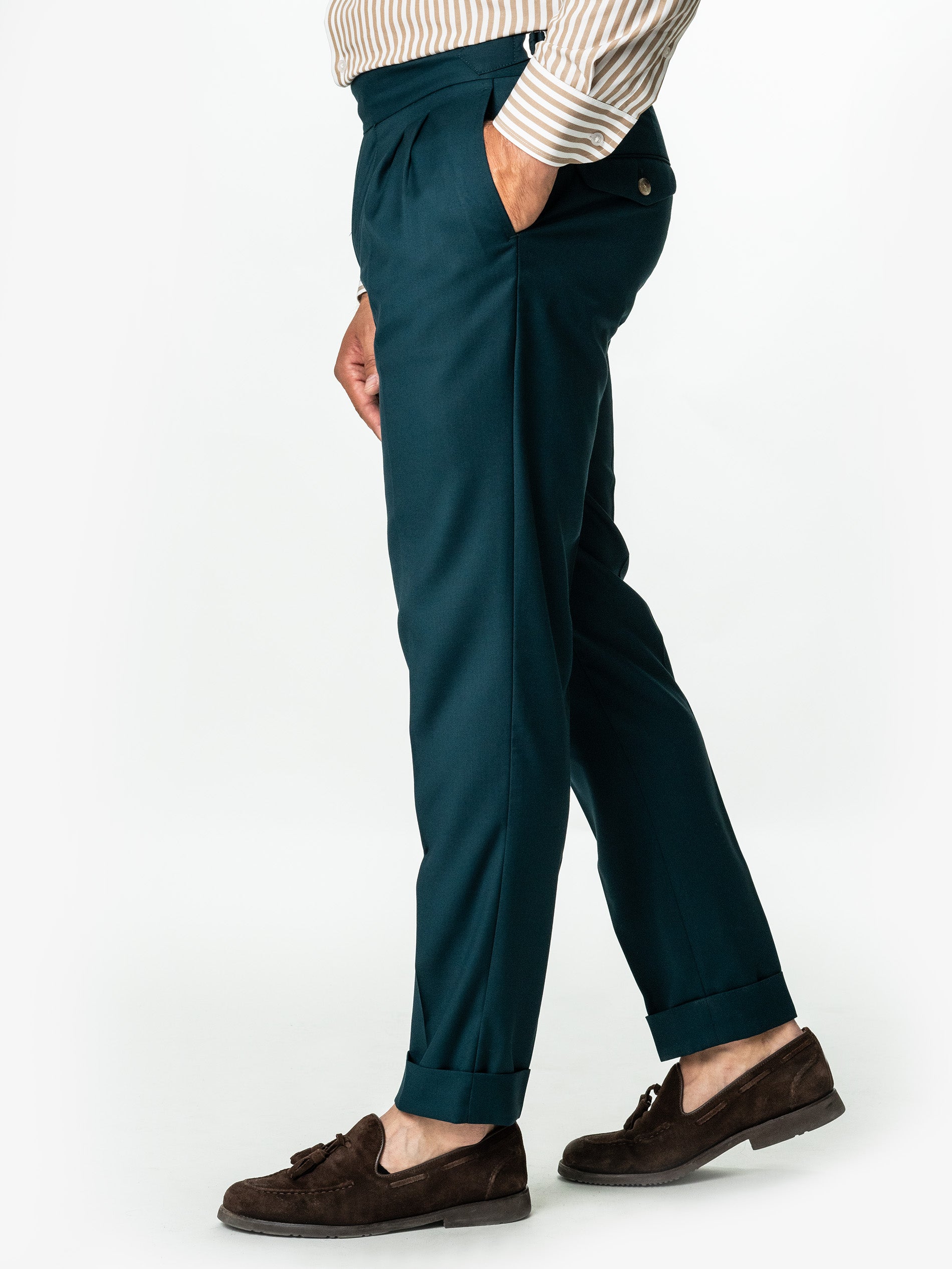 Pantaloni Gurkha Cu Pense Barbati Verde Petrol Din Stofa Lana Sarto BMan0009, sunt confectionați din amestec din stofa Sarto creata din 88% lana si 10% Viscoza si 2% EA (Stress Resistant Fabric), se evidentiază prin look-ul cool, in trend si confortabil îndeosebi.De asemenea, pantalonii sunt deosebit de versatili, putand fi asortati tinutelor elegante cat si cele smart casual. Constructia este pentru purtare cu dunga dreapta, avand o linie centrala, eleganta, inspirand atentie la detalii. Modalitatea de inchidere este foarte practica dar si eleganta datorita accesorizarii ce nu mai necesita o curea clasica.