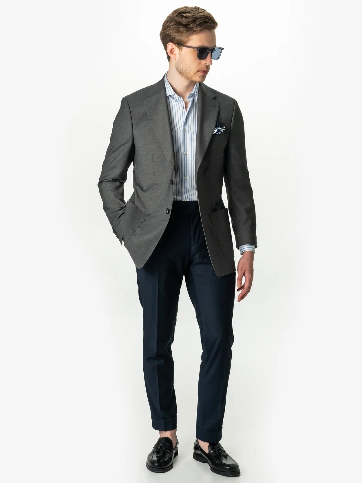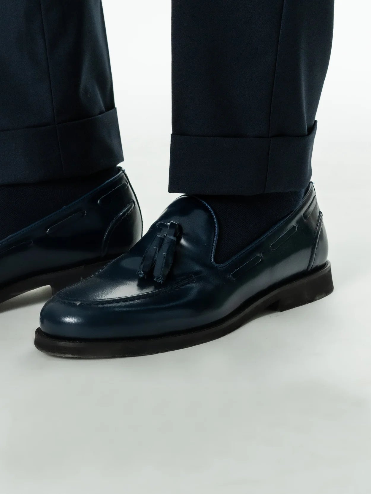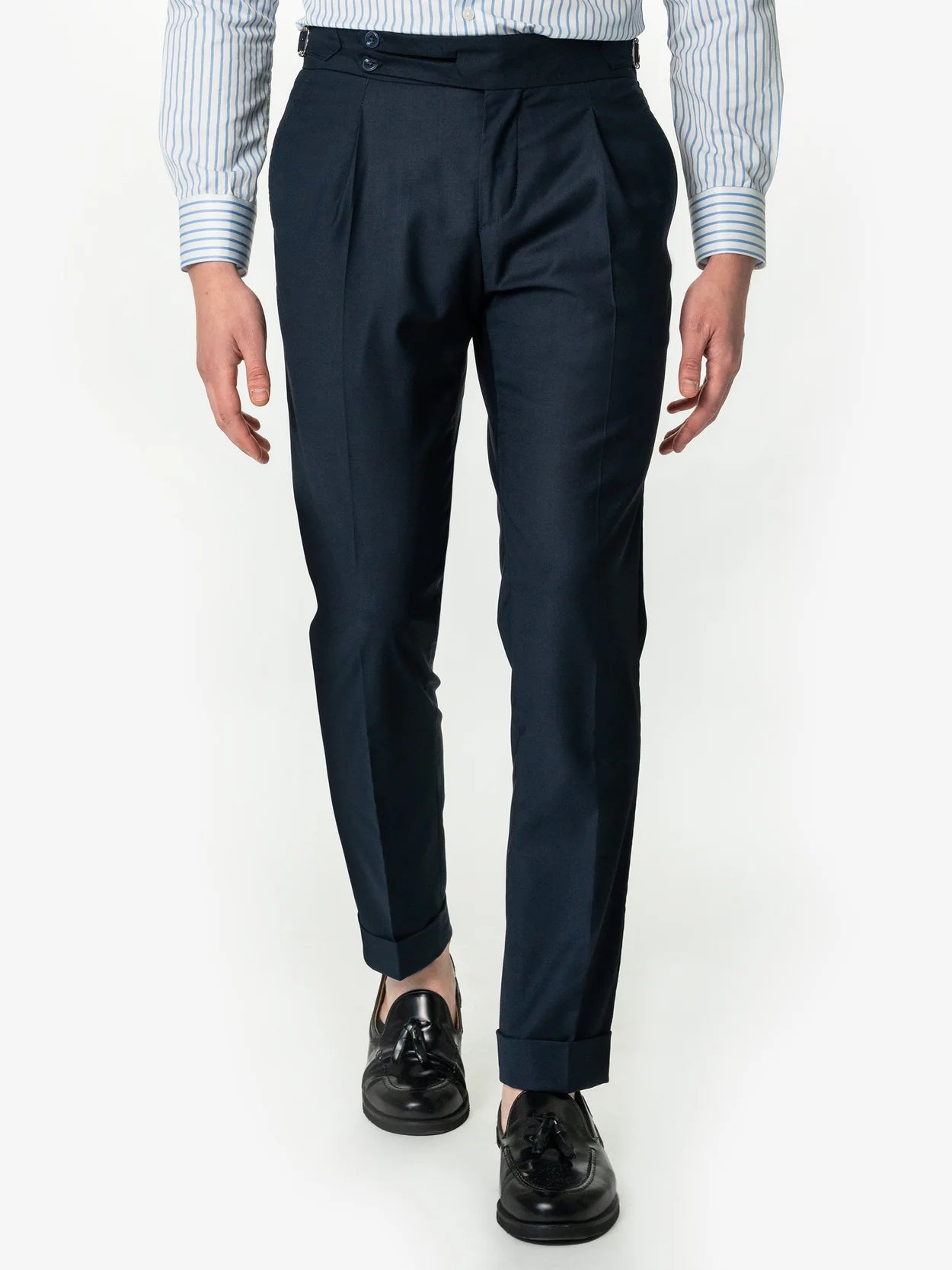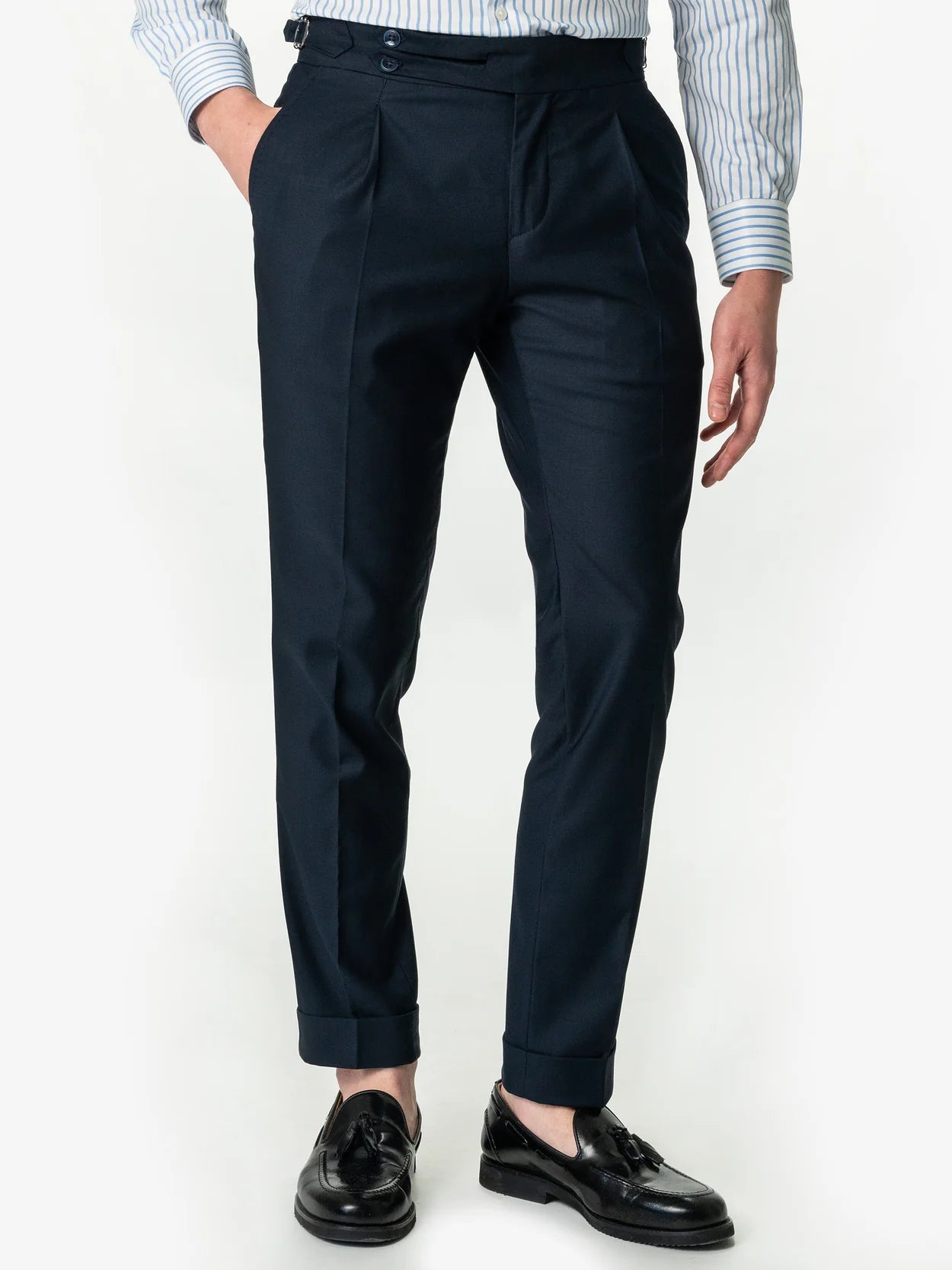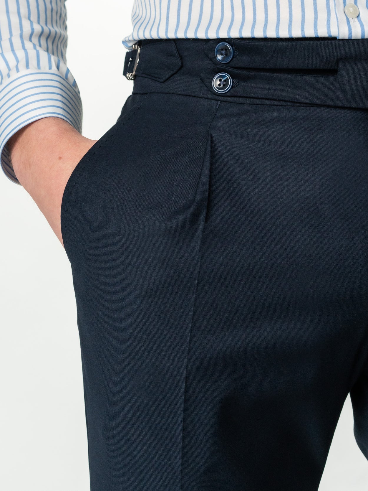 Pantaloni Barbati Albastru Indigo Marine Model Gurkha Bman702, sunt confectionați din amestec din stofa elastica si fina creata din 88% lana si 10% Viscoza si 2% EA (Stress Resistant Fabric), se evidentiază prin look-ul cool, in trend si confortabil îndeosebi.De asemenea, pantalonii sunt deosebit de versatili, putand fi asortati tinutelor elegante cat si cele smart casual. Constructia este pentru purtare cu dunga dreapta, avand o linie centrala, eleganta, inspirand atentie la detalii. Modalitatea de inchidere este foarte practica dar si eleganta datorita accesorizarii ce nu mai necesita o curea clasica.