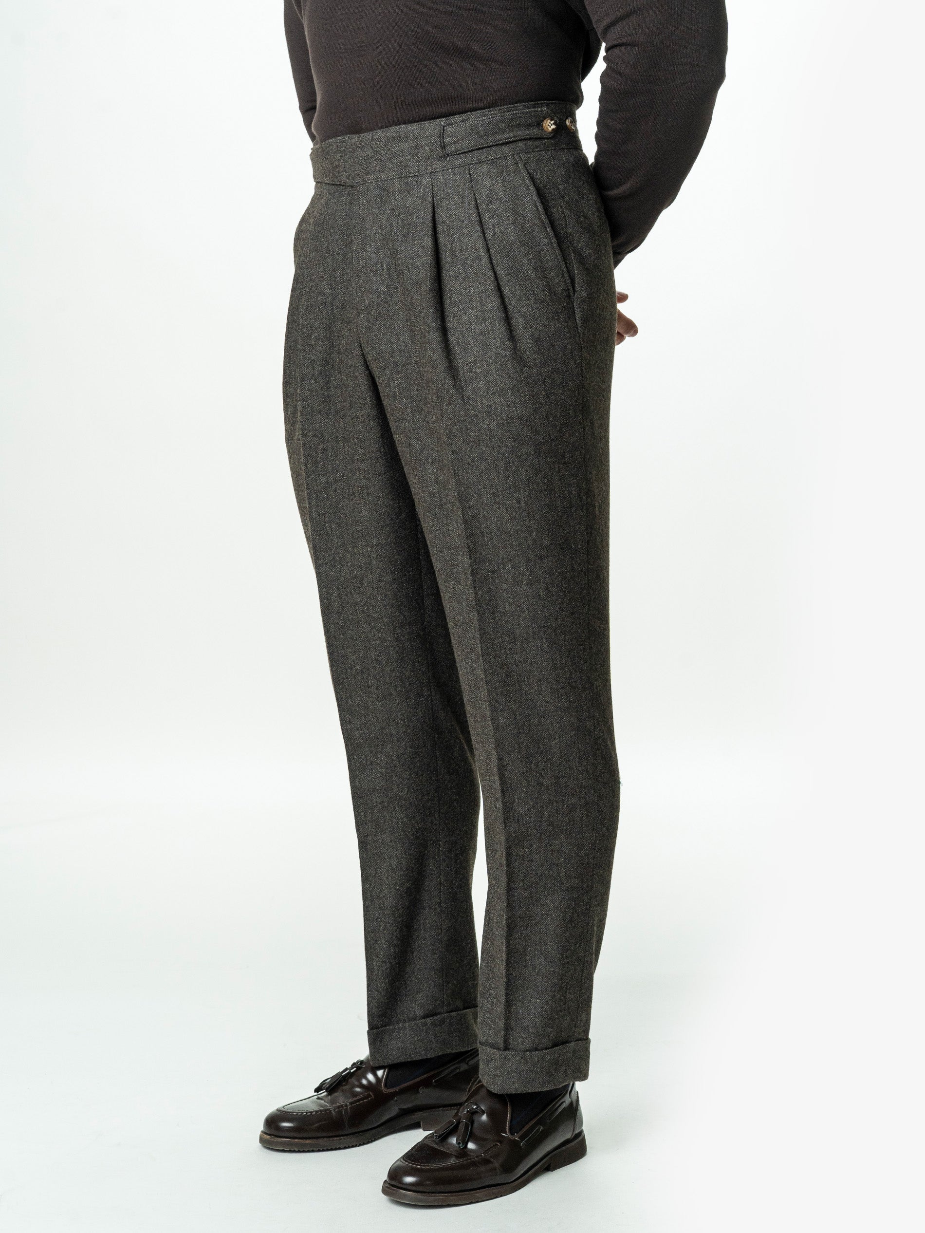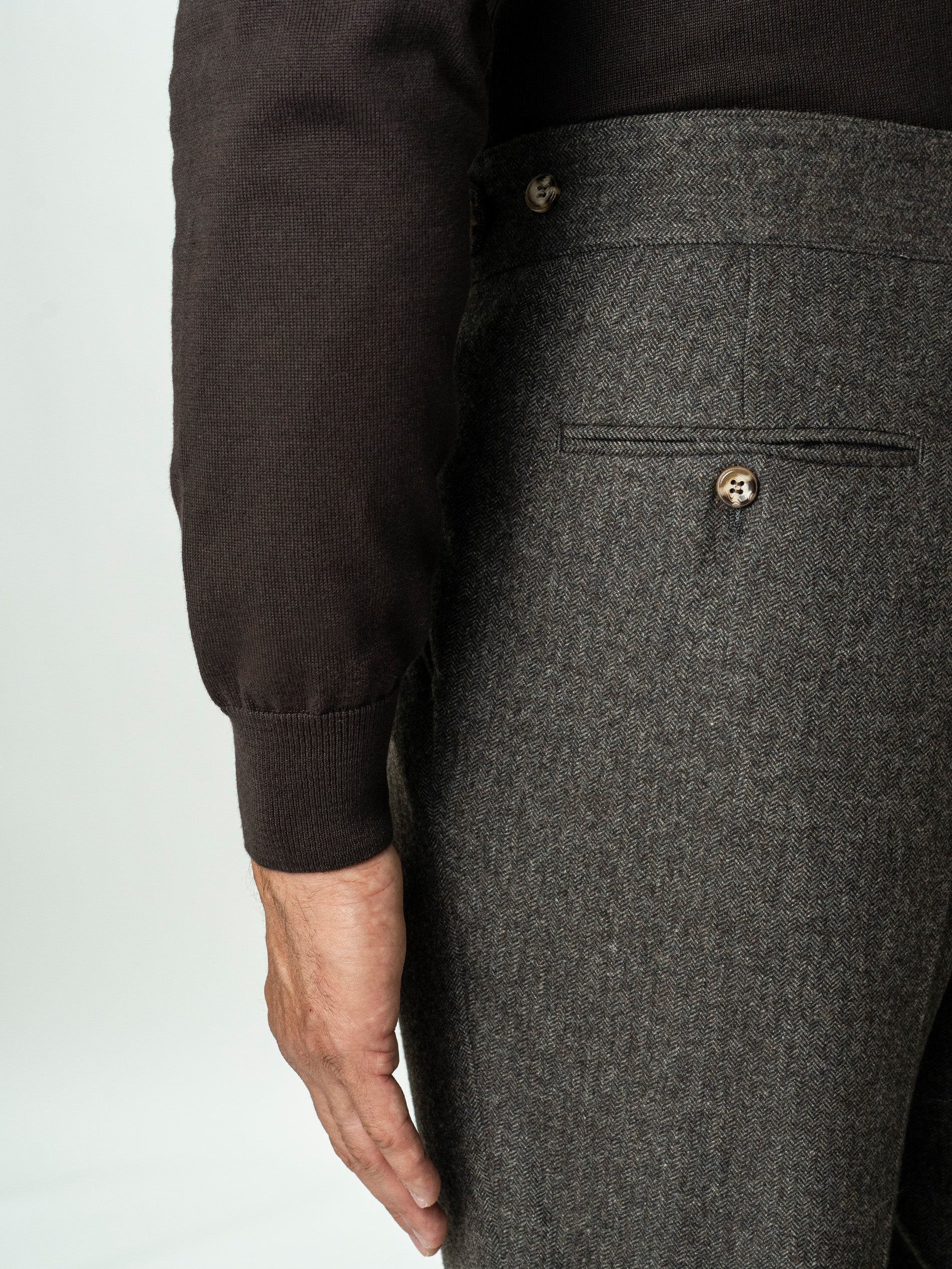 Pantalonii din lana herringbone sunt o declaratie de stil pentru barbatii care apreciaza croitoria autentica. Talia inalta si pensele adanci ofera volum controlat si o linie impecabila, iar lipsa gaicilor de curea accentueaza estetica sartoriala britanica veritabila. In locul curelei, ajustarea se face printr-un sistem lateral cu nasturi, inspirat din traditia britanica de tailoring, pentru un aspect curat si sofisticat. O piesa perfecta pentru tinute formale de sezon sau combinatii smart casual cu pulovere fine si incaltaminte din piele.