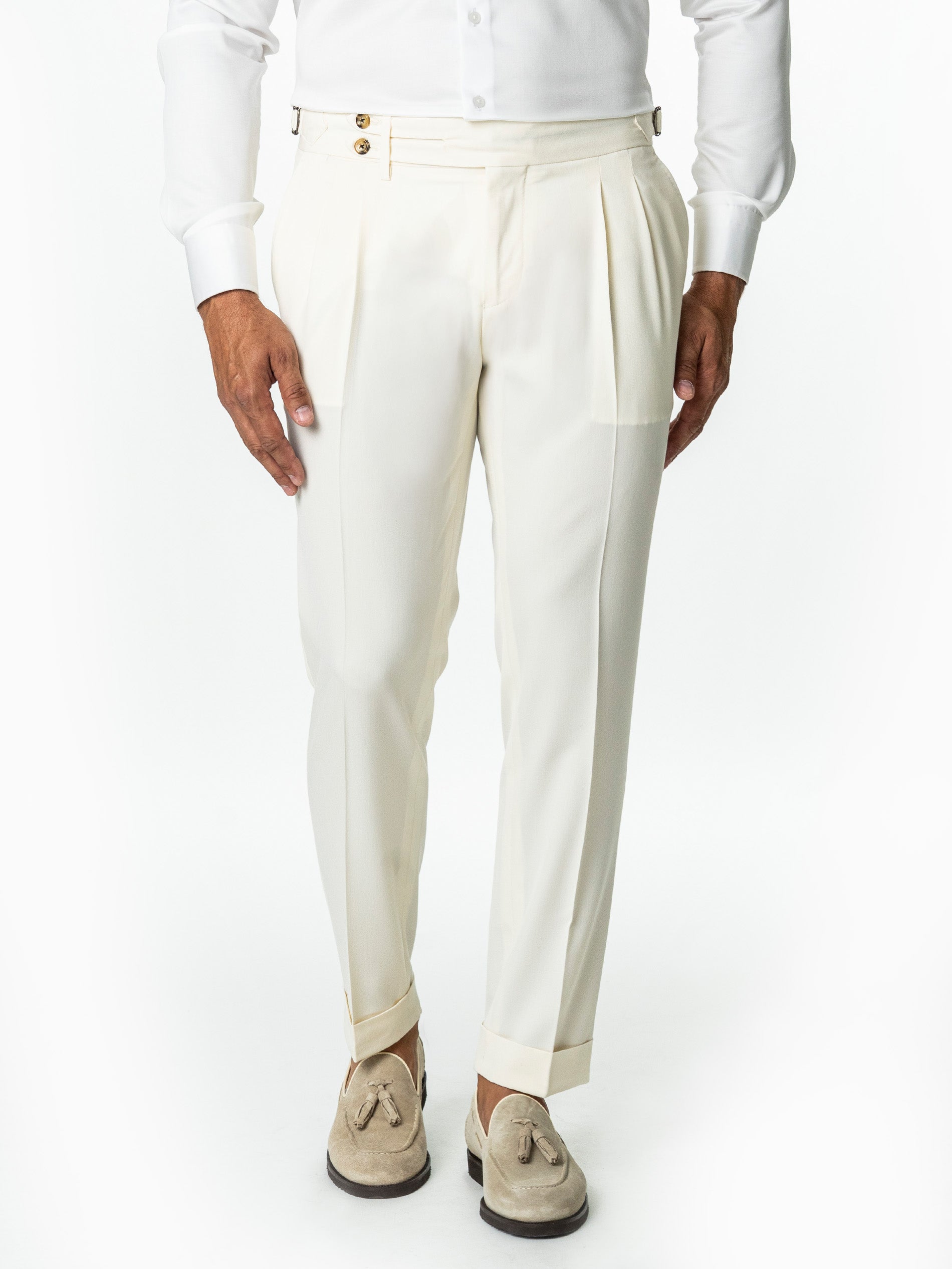 Pantaloni Barbati Crem Model Gurkha Bman702, sunt confectionați din amestec din stofa elastica si fina creata din 88% lana si 10% Viscoza si 2% EA (Stress Resistant Fabric), se evidentiază prin look-ul cool, in trend si confortabil îndeosebi.De asemenea, pantalonii sunt deosebit de versatili, putand fi asortati tinutelor elegante cat si cele smart casual. Constructia este pentru purtare cu dunga dreapta, avand o linie centrala, eleganta, inspirand atentie la detalii. Modalitatea de inchidere este foarte practica dar si eleganta datorita accesorizarii ce nu mai necesita o curea clasica.