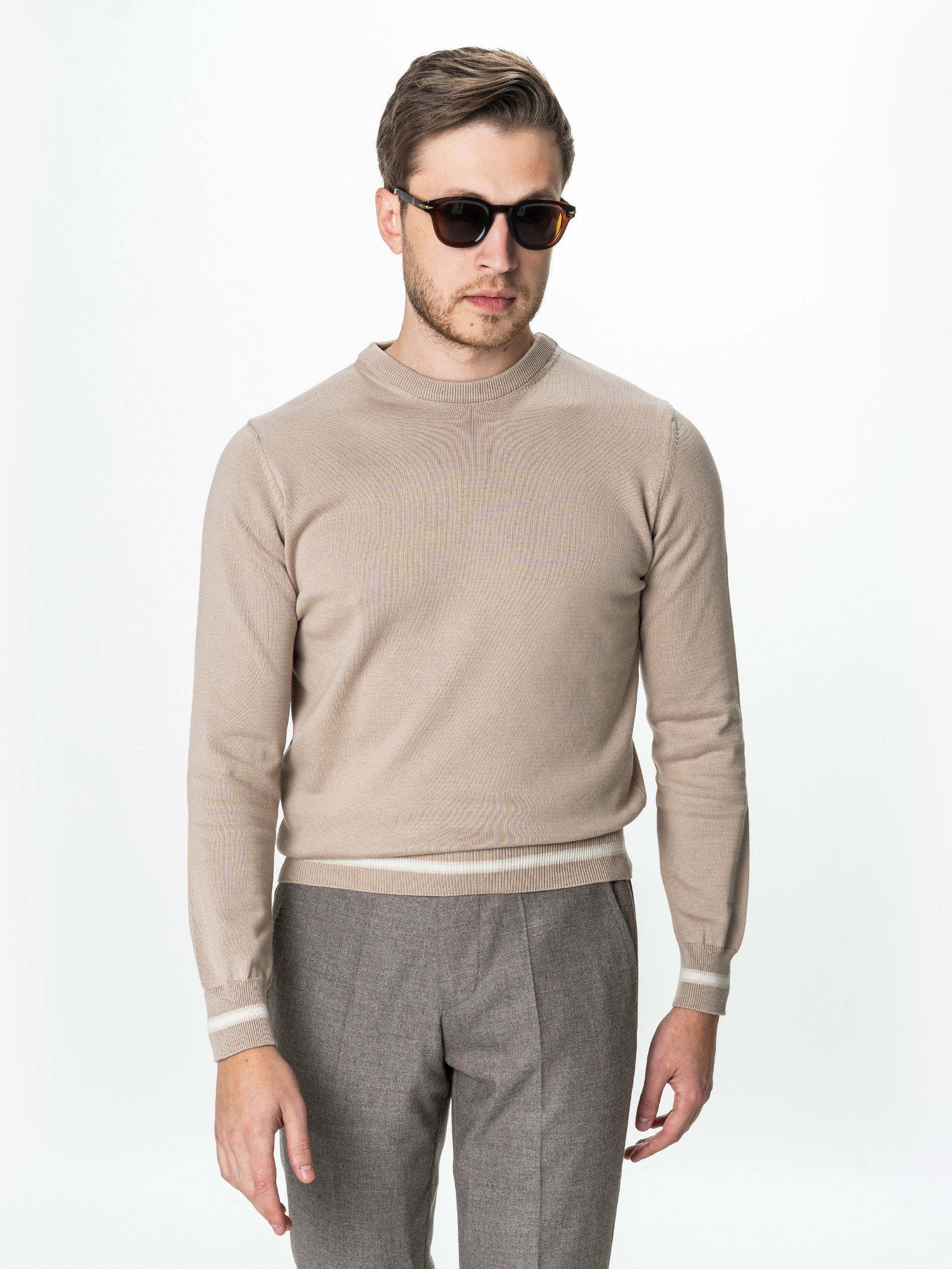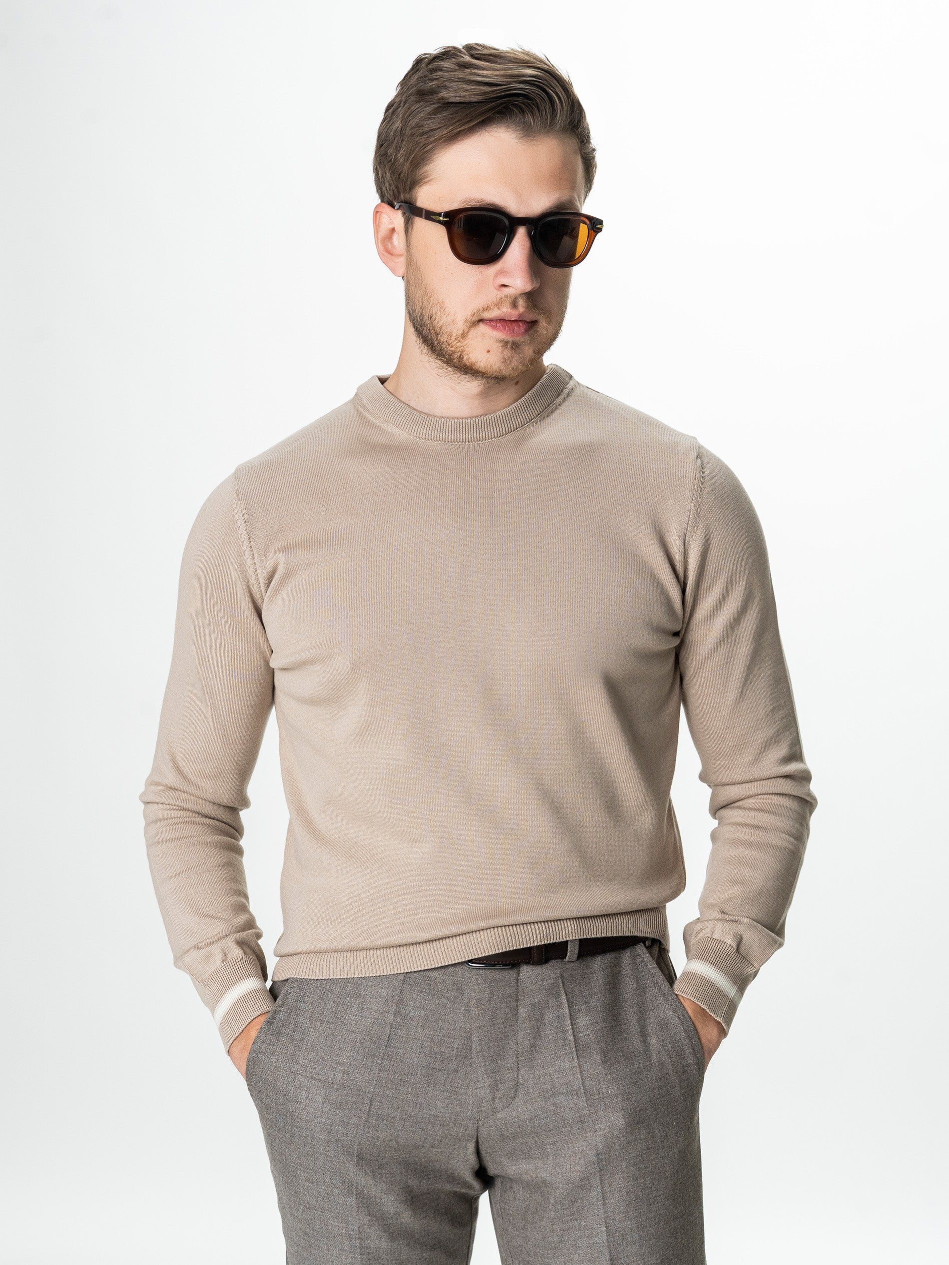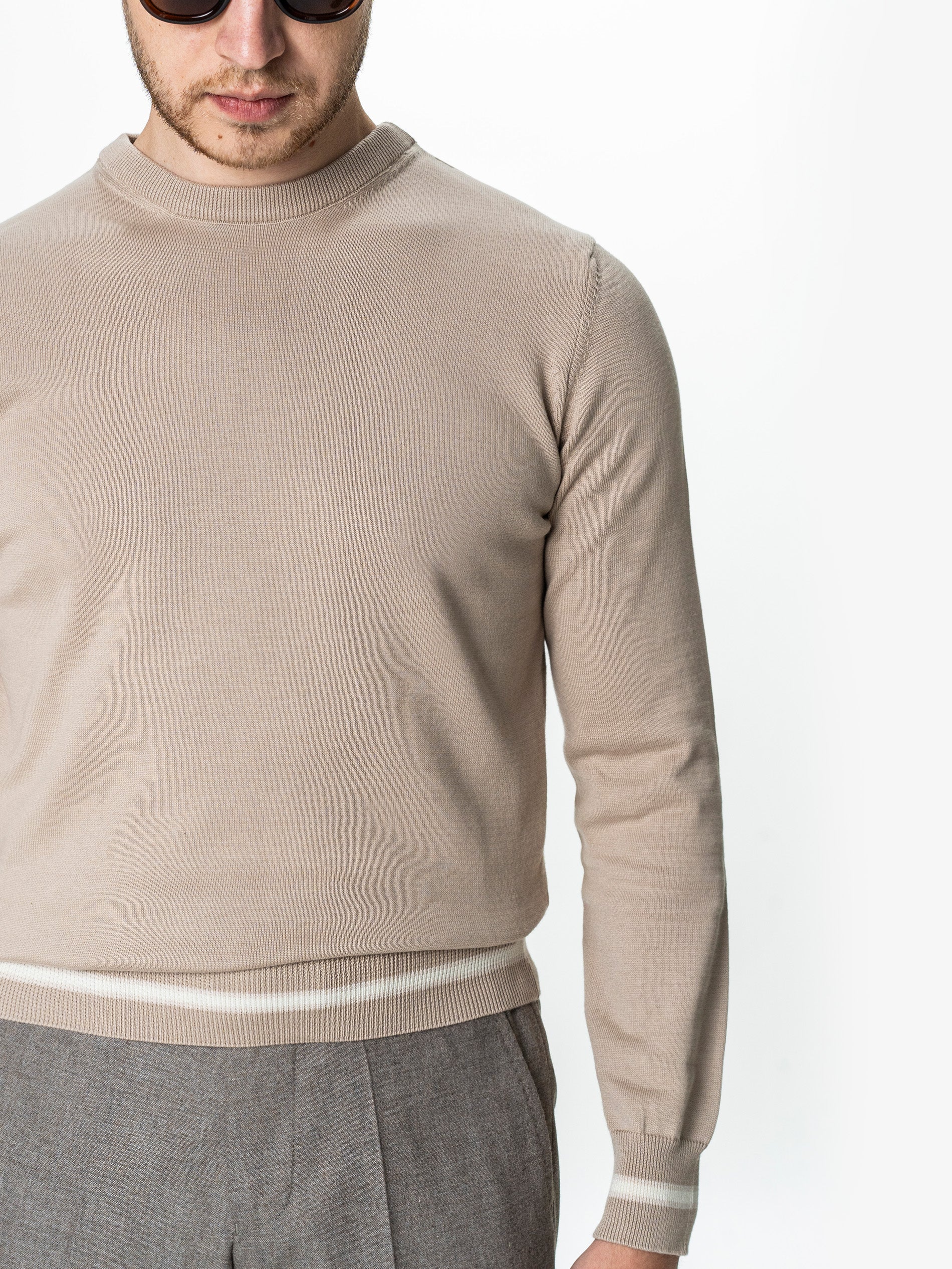 Pulover Barbati Guler Rotund Bej 100% Bumbac BMan0028 ofera o senzatie naturala la purtare si un aspect rafinat, ideal pentru tinutele de zi cu zi sau combinatii smart-casual. Croiul lejer urmareste linia corpului fara sa stranga, iar textura fina tricotata asigura confort termic optim in sezonul rece. Linie contrastanta subtila la mansete si la baza pentru un accent discret, dar modern.
