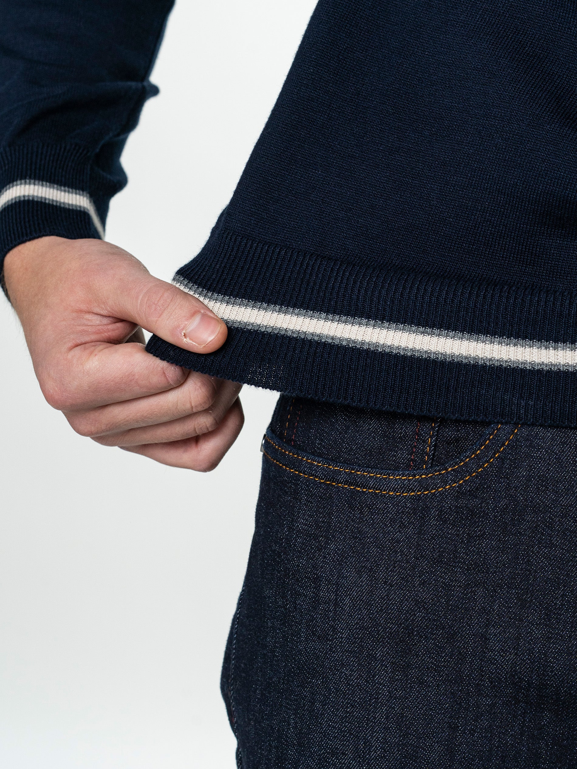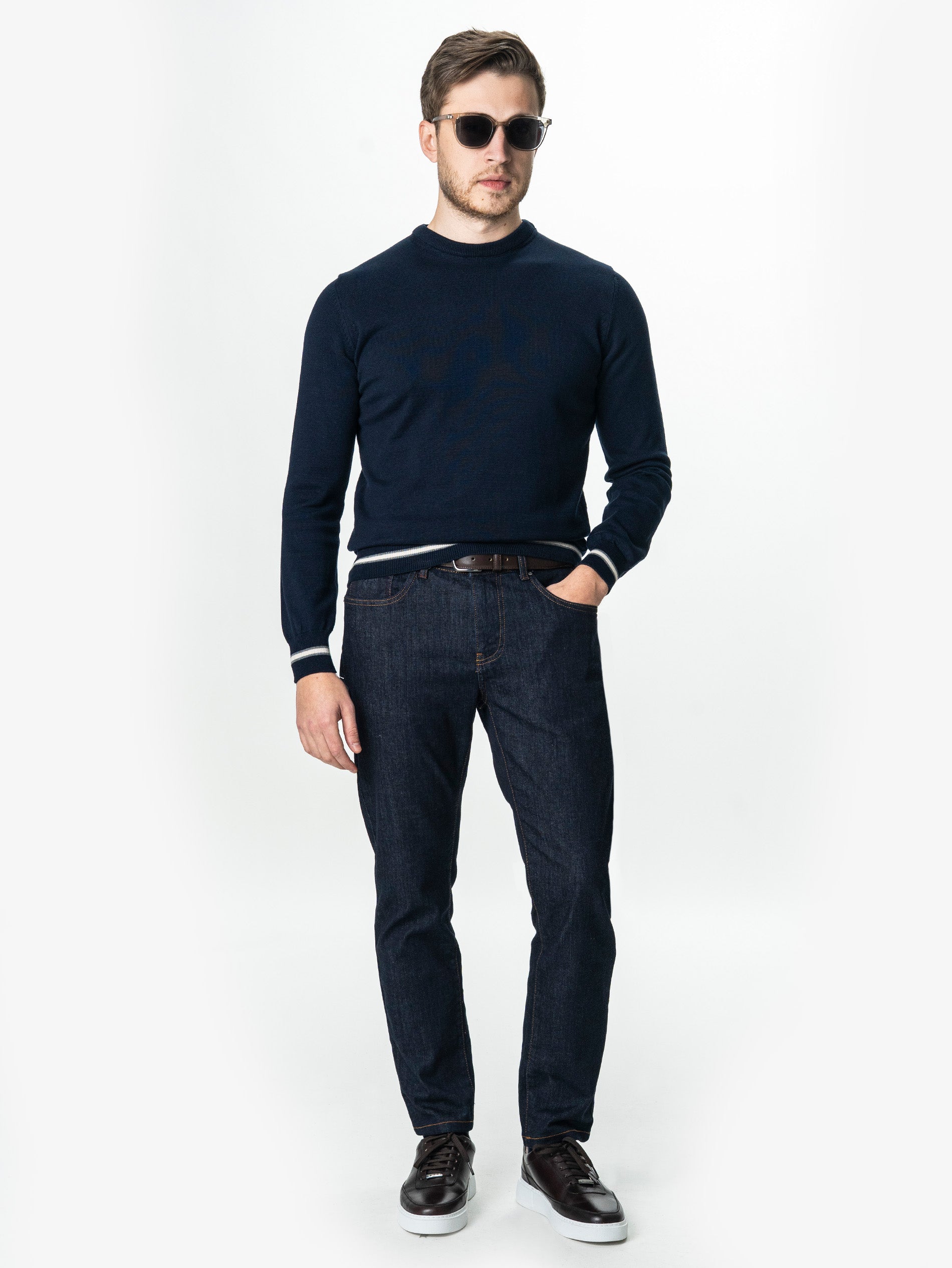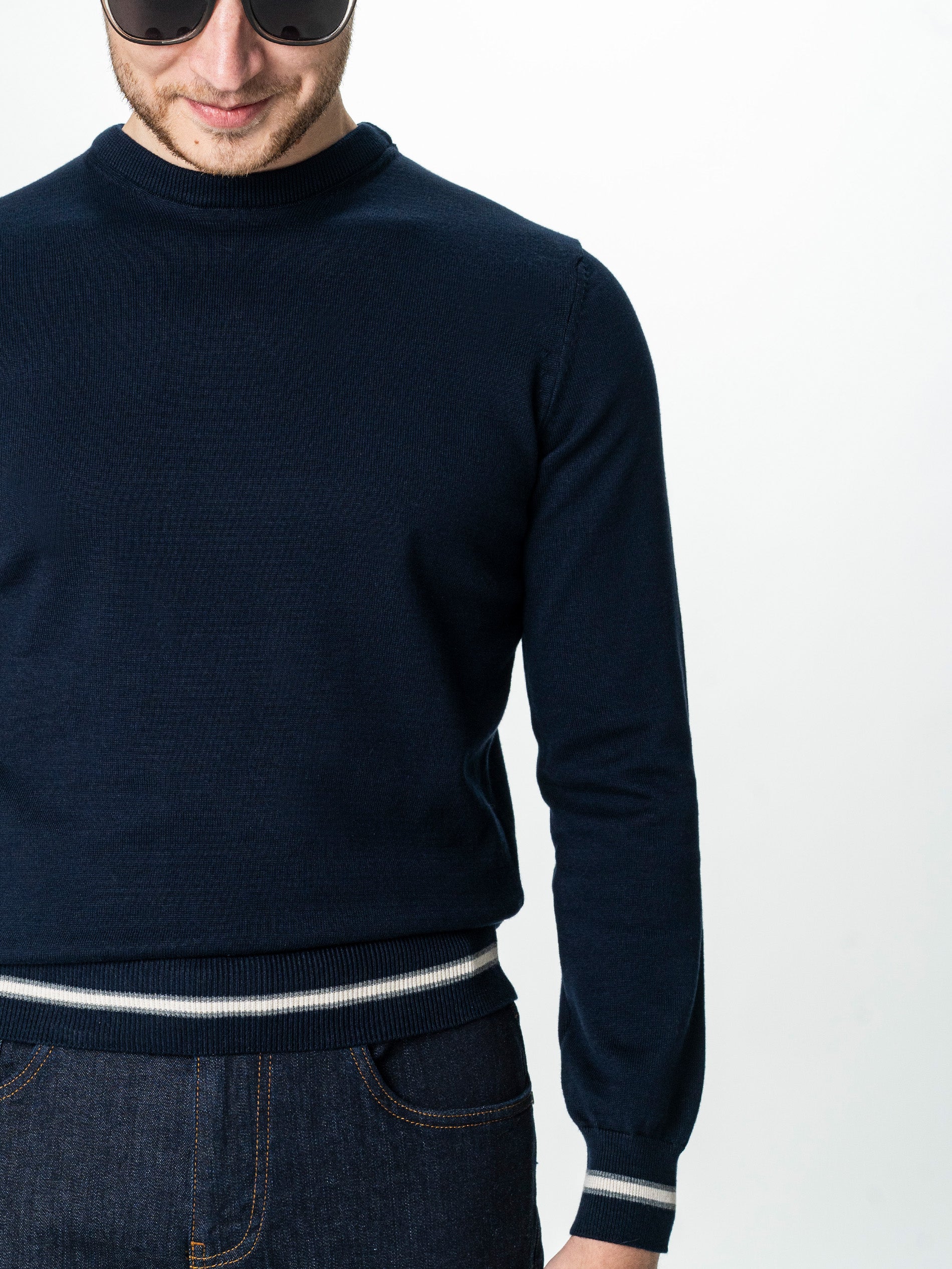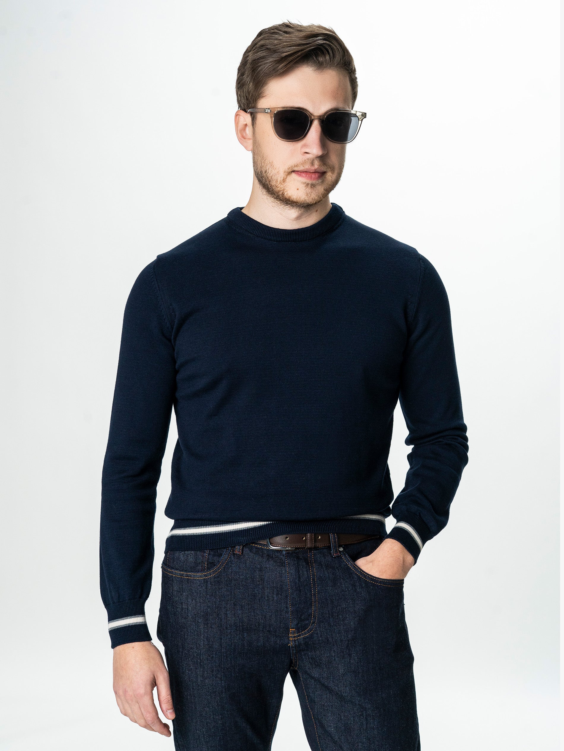 Pulover Barbati Guler Rotund Bleumarin 100% Bumbac BMan0028 ofera o senzatie naturala la purtare si un aspect rafinat, ideal pentru tinutele de zi cu zi sau combinatii smart-casual. Croiul lejer urmareste linia corpului fara sa stranga, iar textura fina tricotata asigura confort termic optim in sezonul rece. Linie contrastanta subtila la mansete si la baza pentru un accent discret, dar modern.