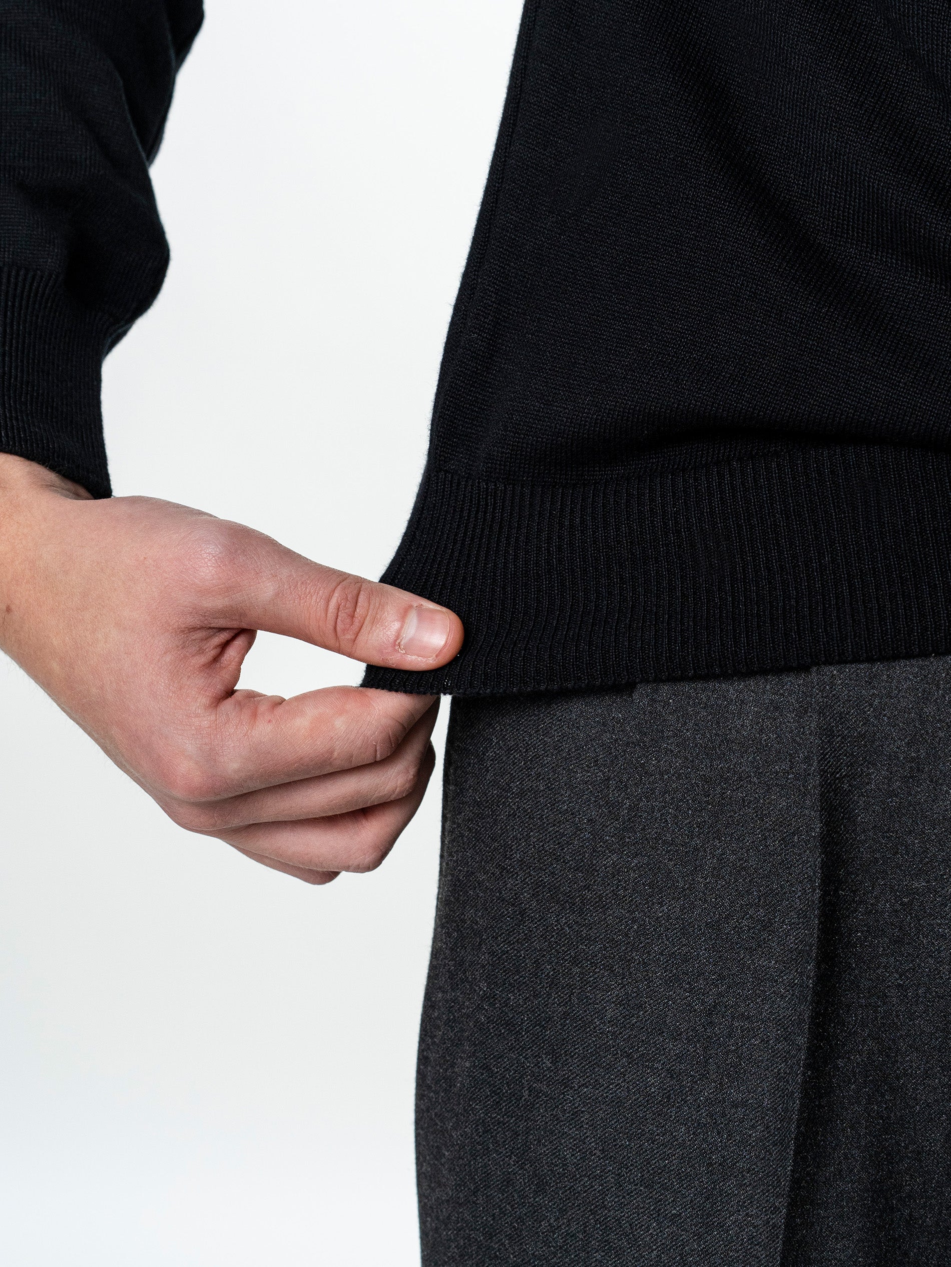 Terminare maneci și bata cu mansete: Manecile și bata puloverului sunt dotate cu mansete din același tricot, fin și confortabil. Tehnologia avansată permite închiderea fără niciun retuș, asigurând un aspect impecabil.