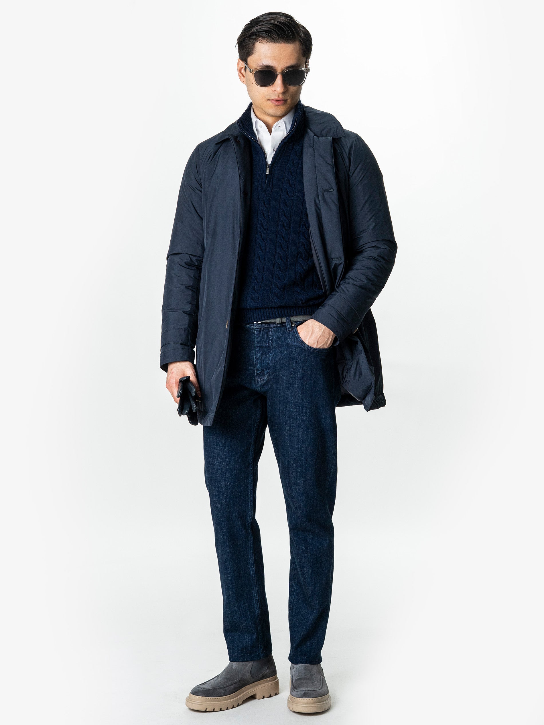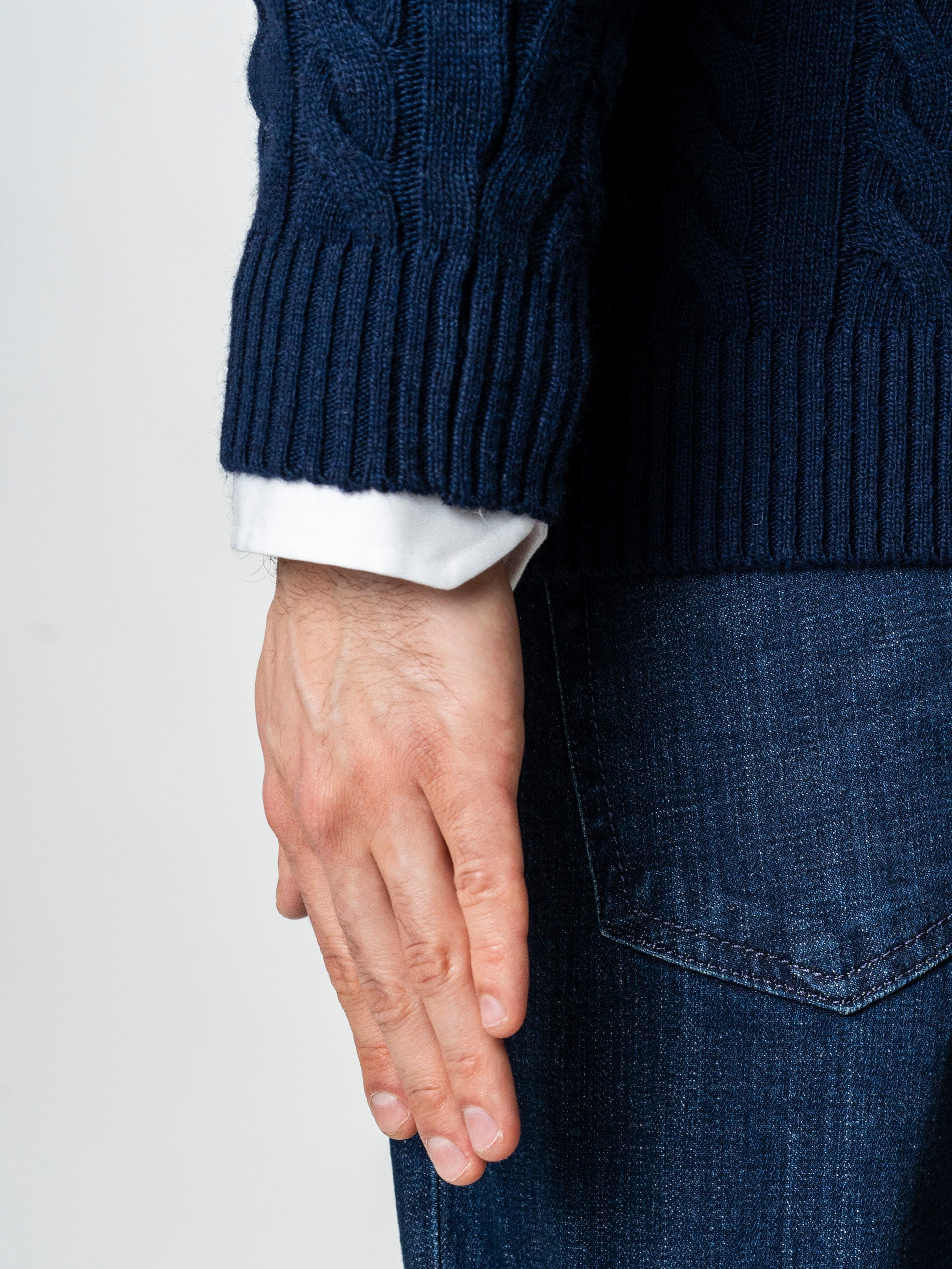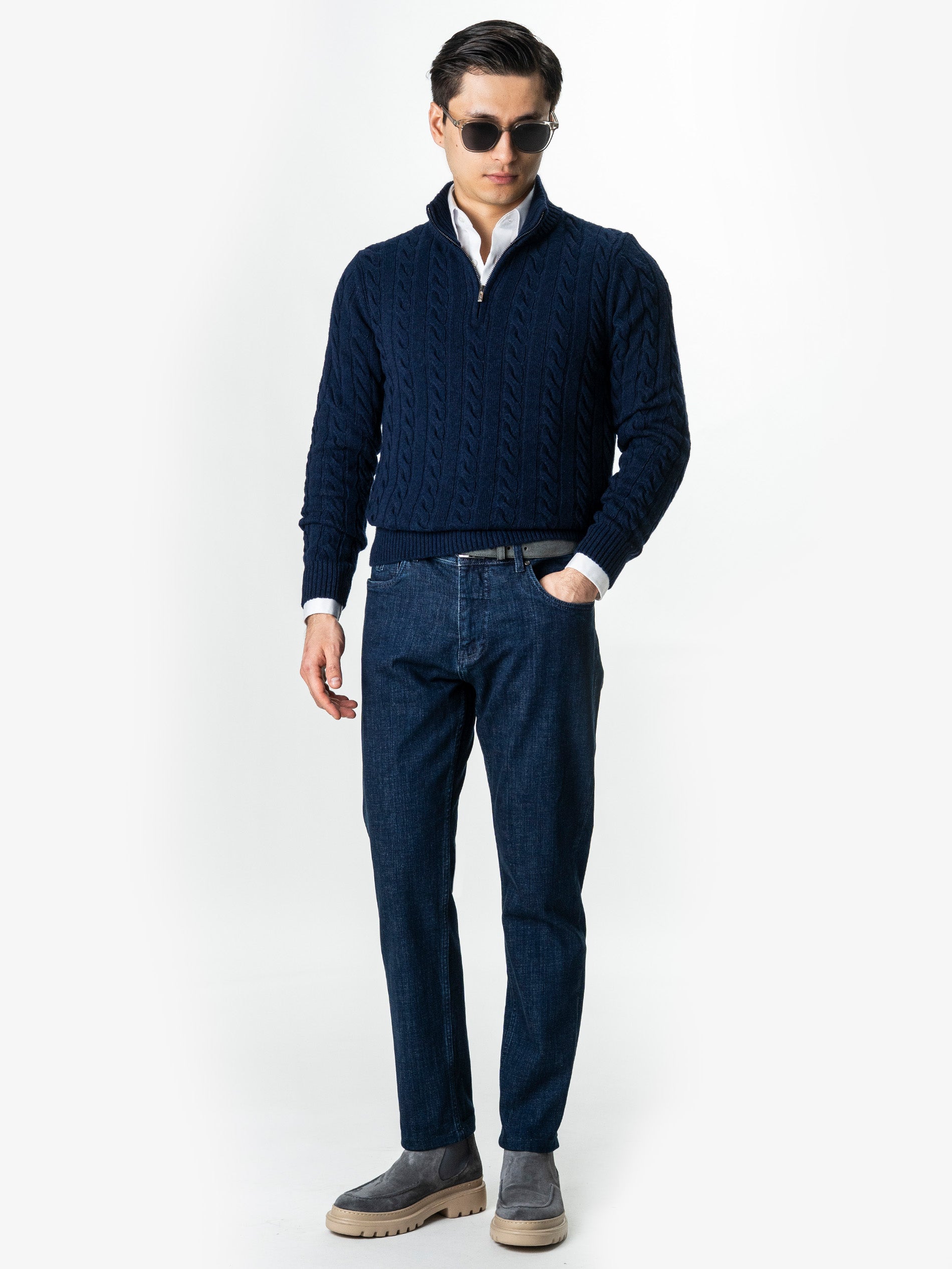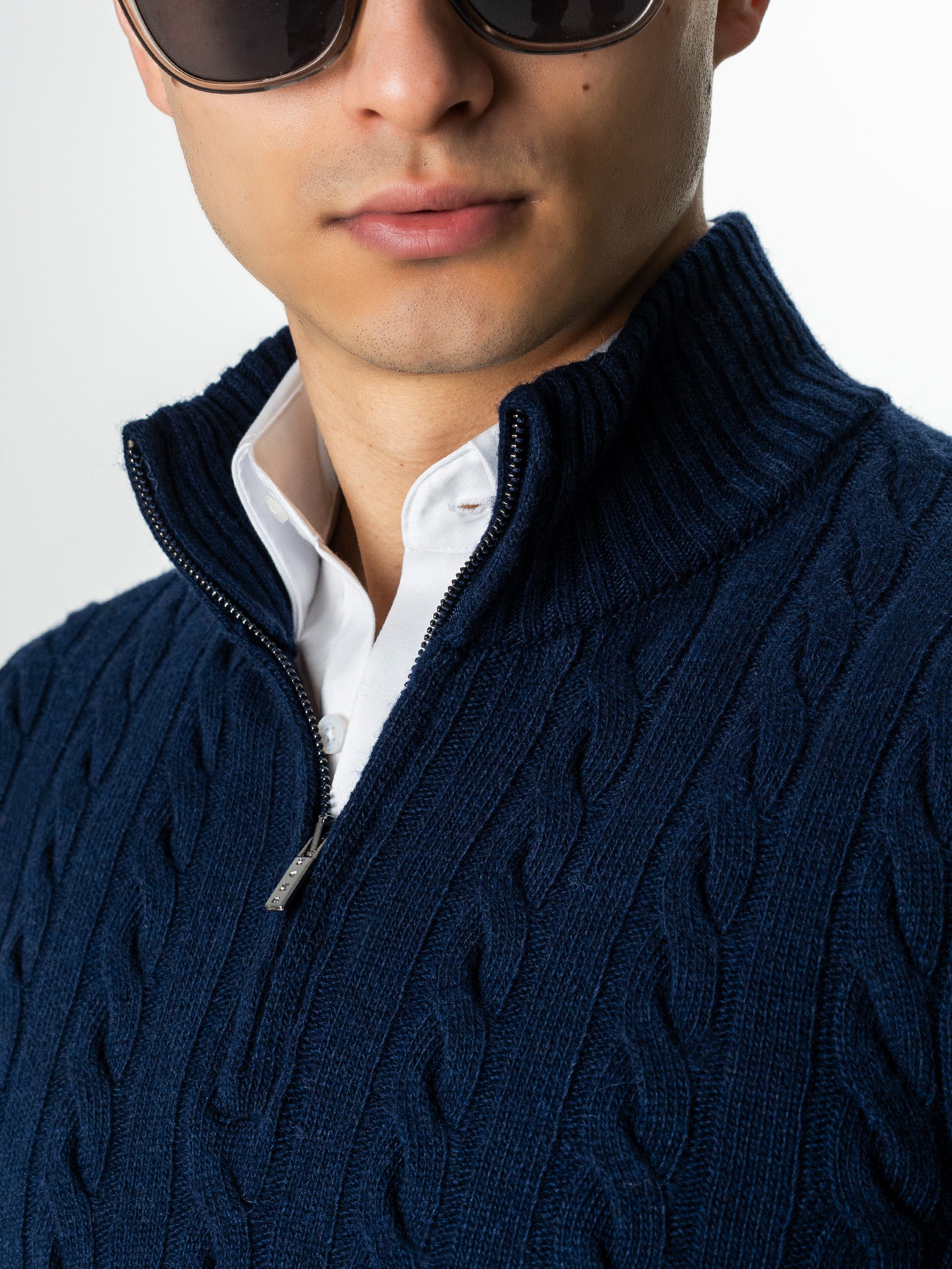 Pulover Barbati Torsade Bleumarin Cu Fermoar 100% Lana Lambswool BMan0034, construit intr-o textura clasica cu torsade, care ofera o senzatie autentica de caldura si structura. Materialul moale si dens imbraca elegant forma corpului, pastrand totusi un confort natural specific tricotajelor premium. Gulerul inalt cu fermoar scurt aduce un aer modern si permite ajustarea usoara a stilului, de la relaxat la sofisticat. Este o piesa versatila, potrivita pentru tinute de zi sau combinatii smart casual, atunci cand iti doresti un look curat si bine echilibrat.