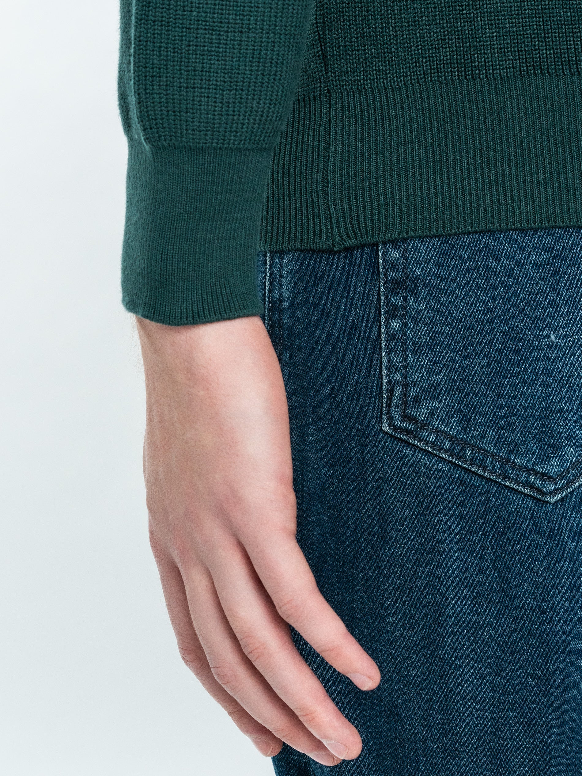 • Terminare maneci și bata cu mansete: Manecile și bata puloverului sunt dotate cu mansete din același tricot, fin și confortabil. Tehnologia avansată permite închiderea fără niciun retuș, asigurând un aspect impecabil.
