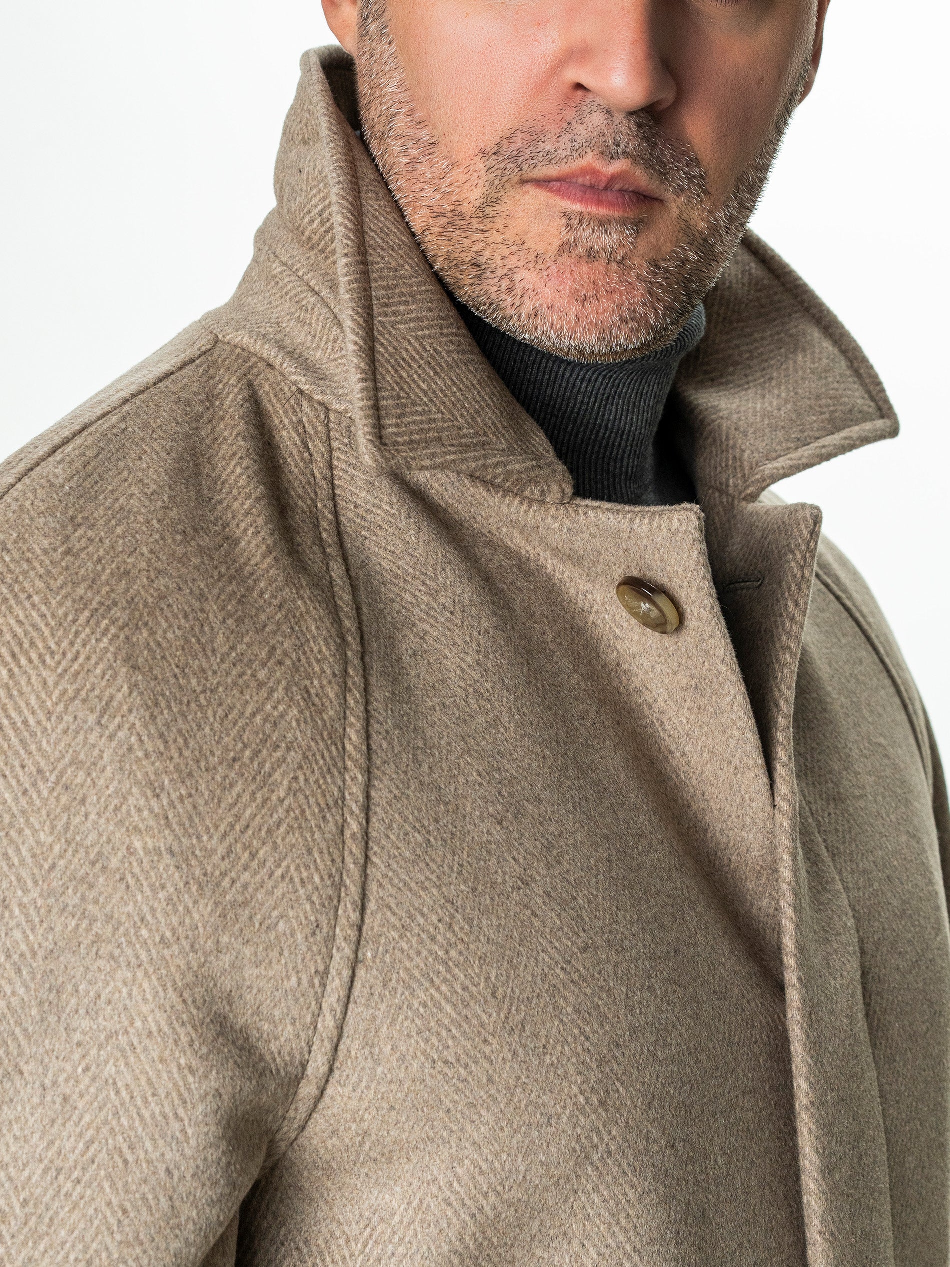 1. Palton Barbati Iarna Crem 100% Lana Twill BMan0006 realizat dintr-o tesatura twill cu diagonale fine vizibile, imbina durabilitatea materialului cu o estetica rafinata. Linia dreapta este echilibrata de umerii raglan fara cusaturi, care confera o pozitie naturala si eleganta a corpului.