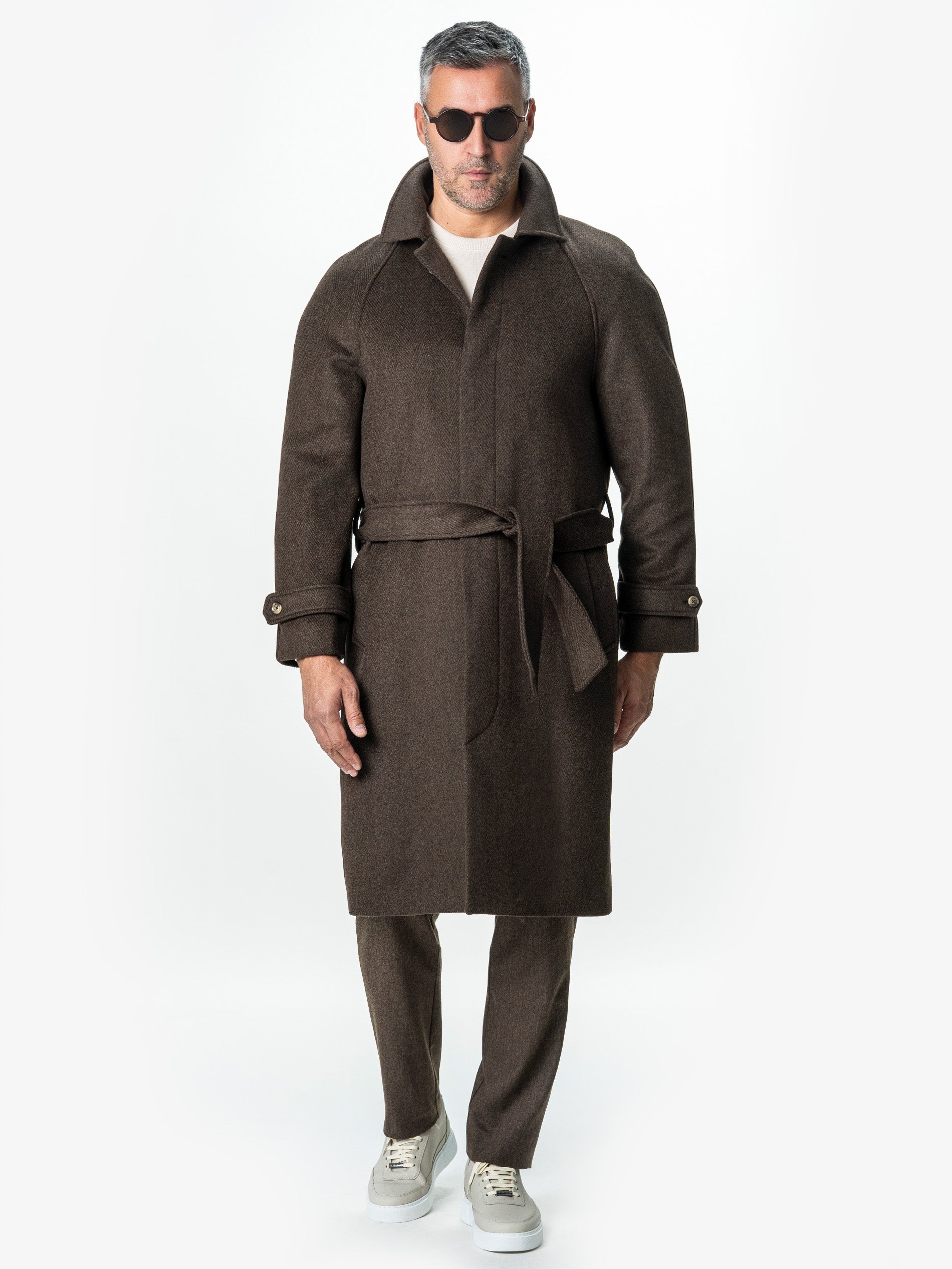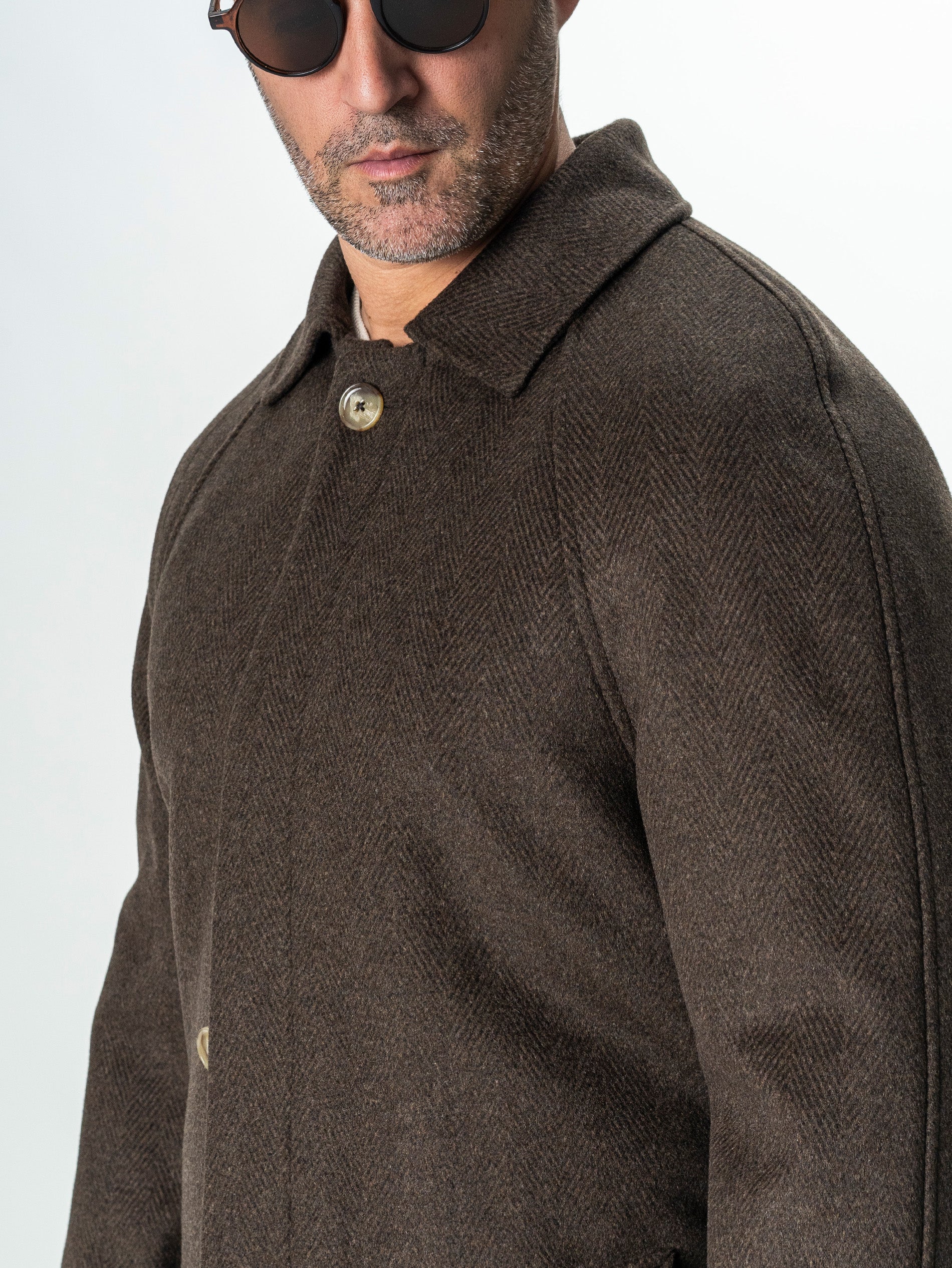 1. Palton Barbati Iarna Maro 100% Lana Twill BMan0006 realizat dintr-o tesatura twill cu diagonale fine vizibile, imbina durabilitatea materialului cu o estetica rafinata. Linia dreapta este echilibrata de umerii raglan fara cusaturi, care confera o pozitie naturala si eleganta a corpului.