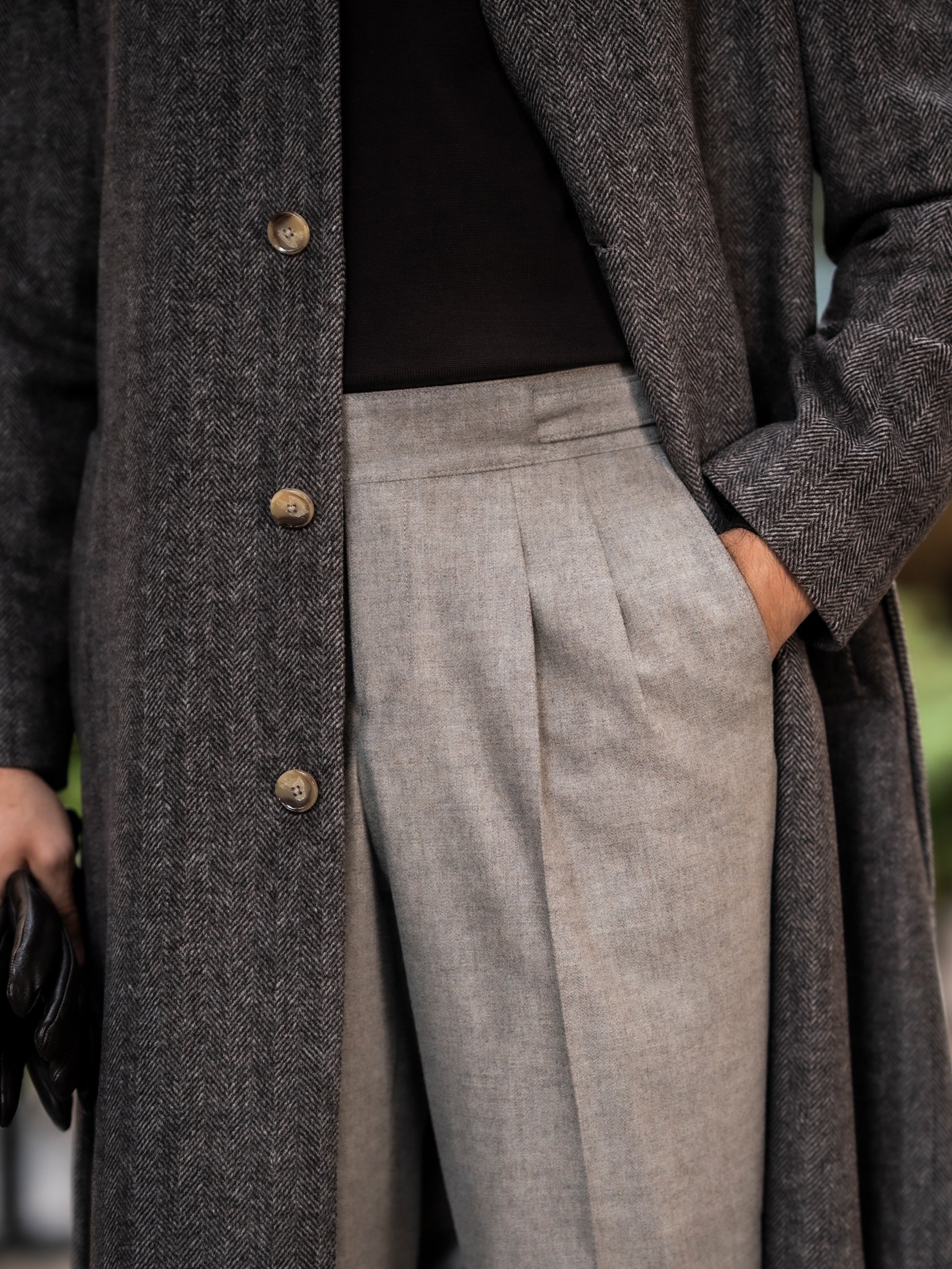 3. Pantalonii din lana fina BMan725 sunt o declaratie de stil pentru barbatii care apreciaza croitoria autentica. Talia inalta si pensele adanci ofera volum controlat si o linie impecabila, iar lipsa gaicilor de curea accentueaza estetica sartoriala britanica veritabila.