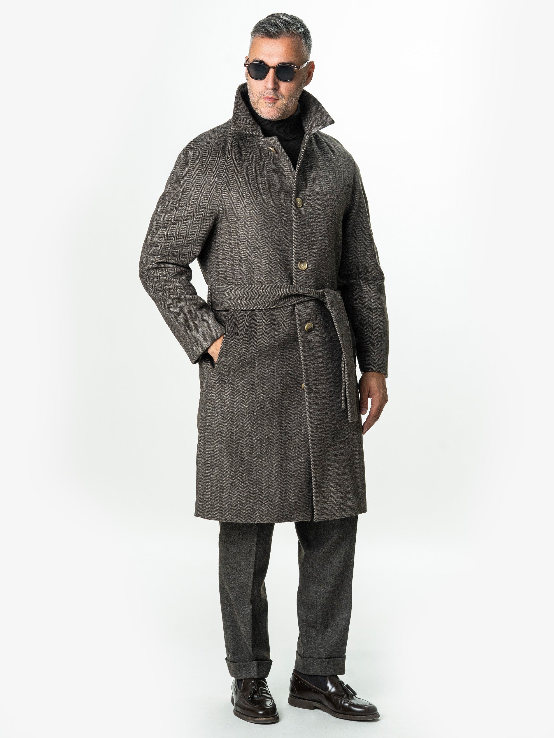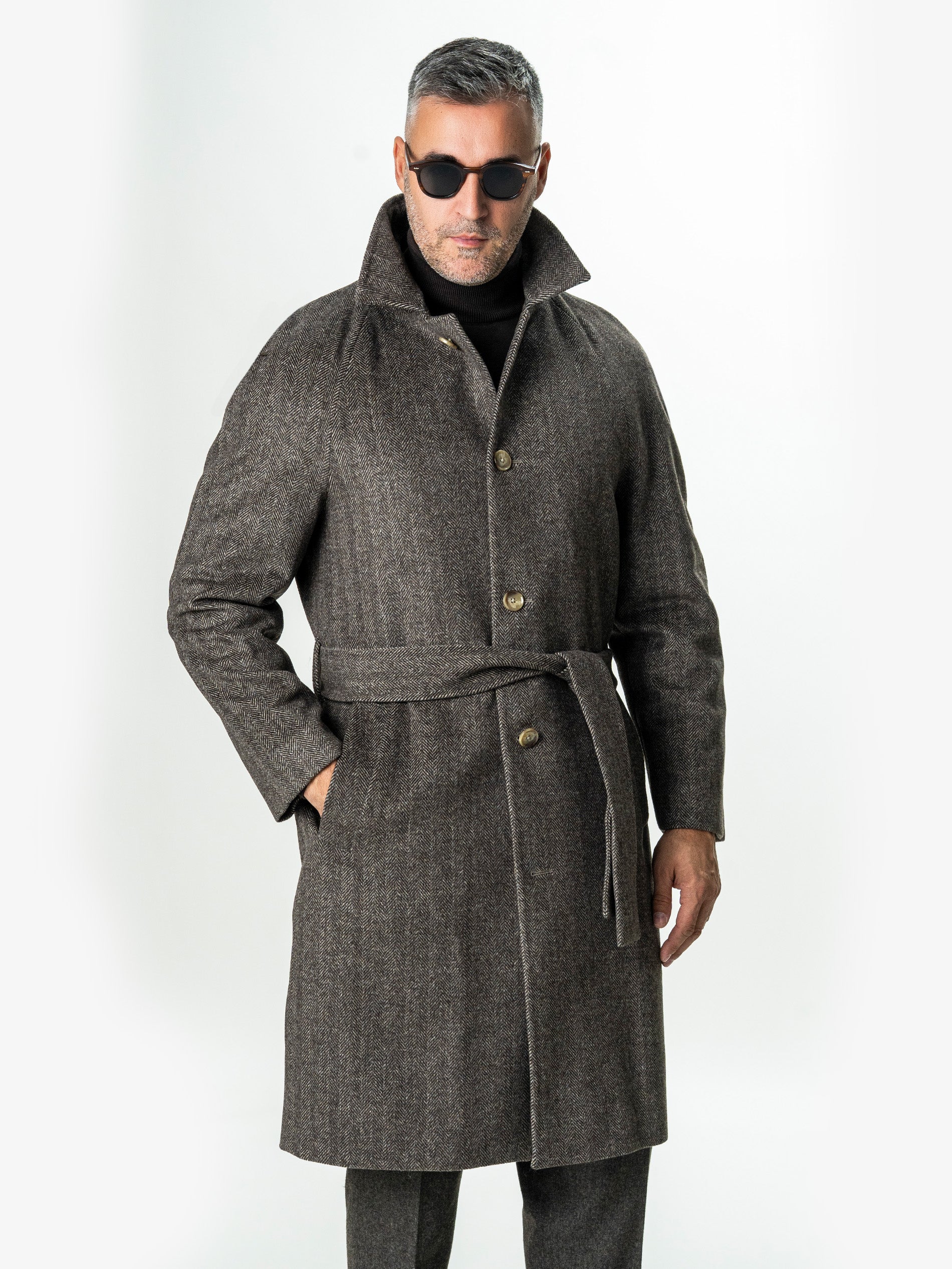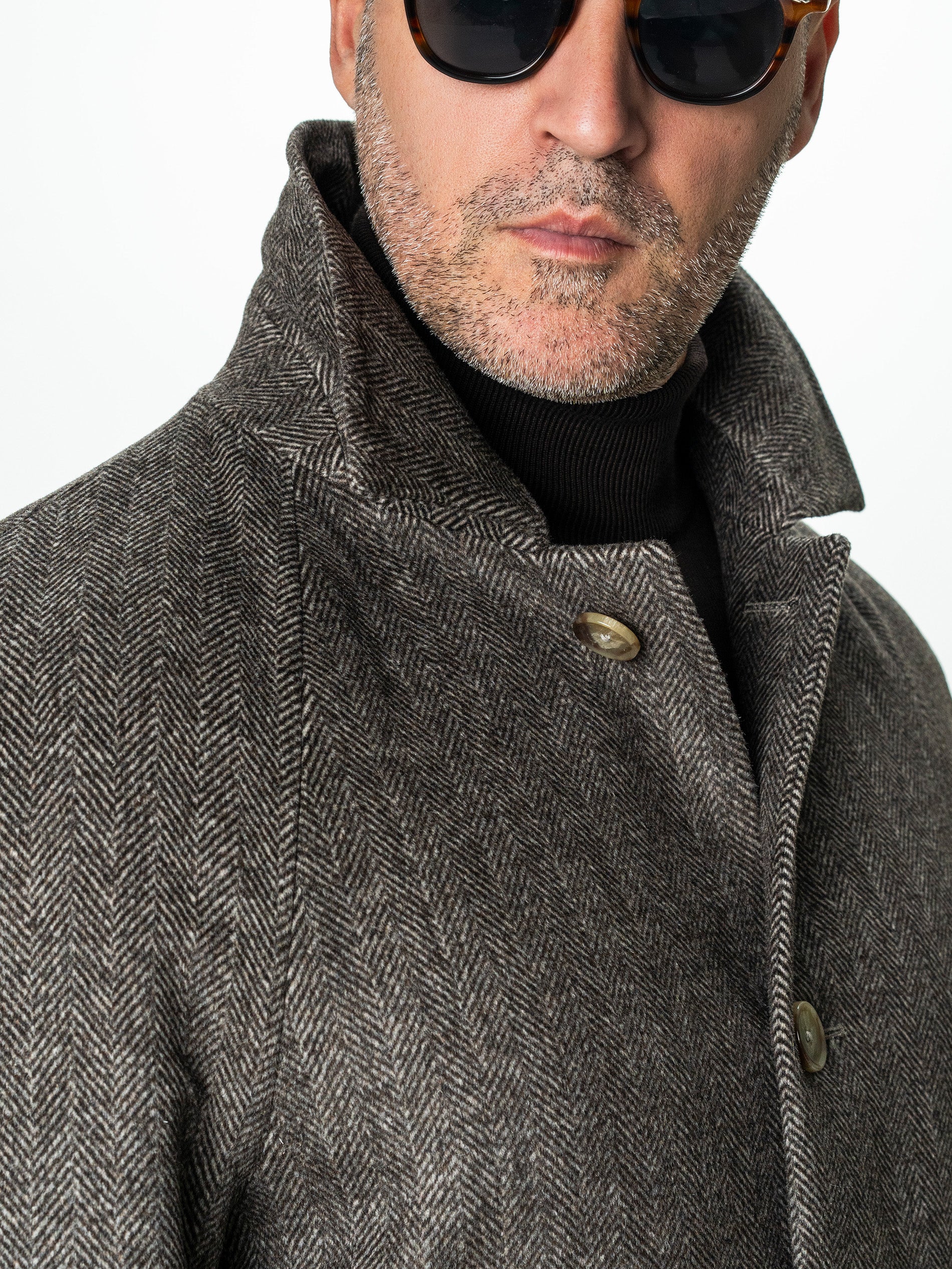 1. Palton Barbati Iarna Cafeniu 100% Lana Houndstooth BMan0005 realizat intr-un rafinat model houndstooth in nuante de gri si negru. Croiala dreapta, completata de umeri raglan fara cusaturi, ofera libertate naturala de miscare si o linie fluida, specifica paltoanelor de inspiratie sartoriala italiana.