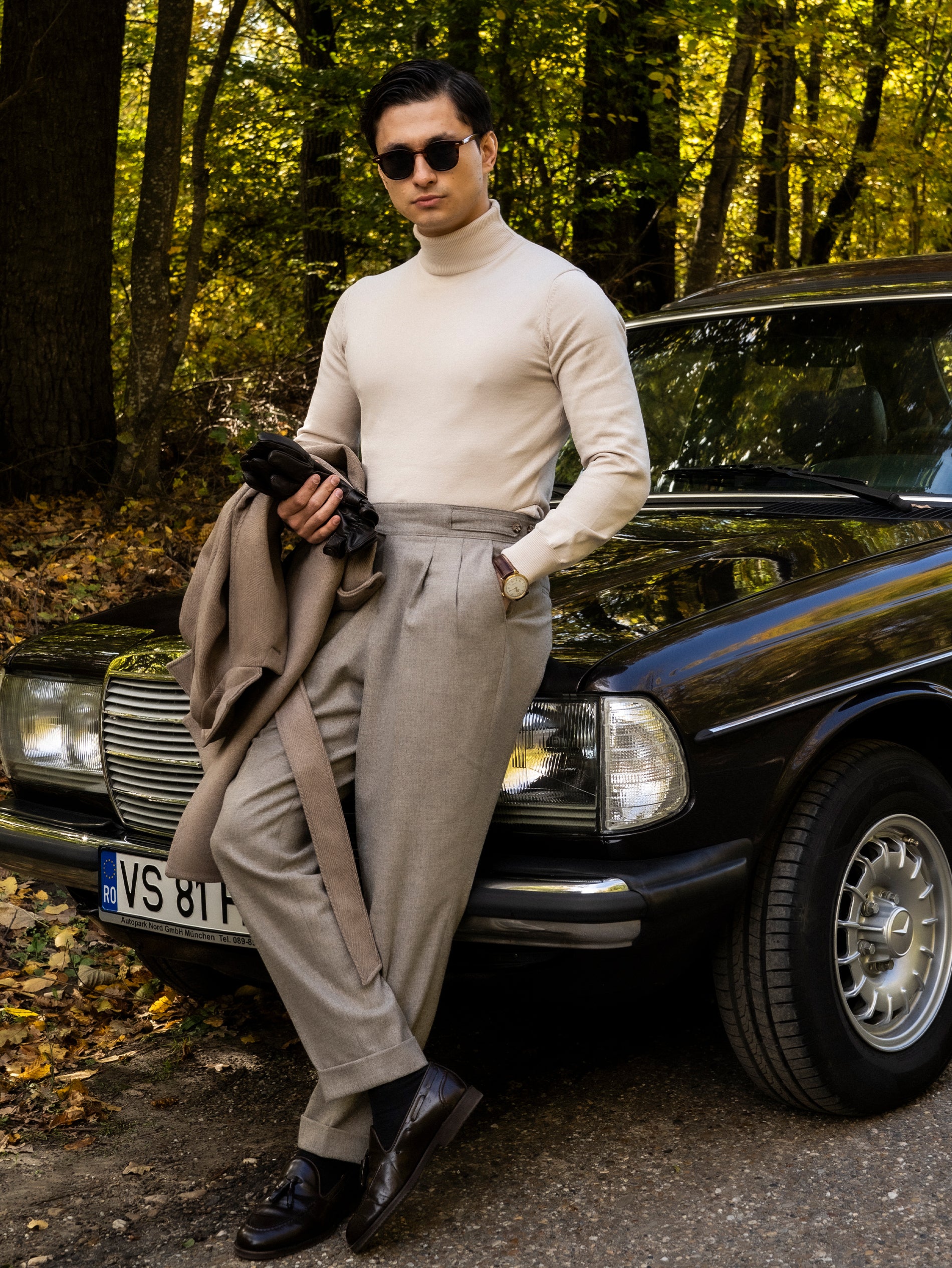 3. Pantaloni Barbati Bej British Model Gurkha Din Lana BMan725 sunt o declaratie de stil pentru barbatii care apreciaza croitoria autentica. Talia inalta si pensele adanci ofera volum controlat si o linie impecabila, iar lipsa gaicilor de curea accentueaza estetica sartoriala britanica veritabila.