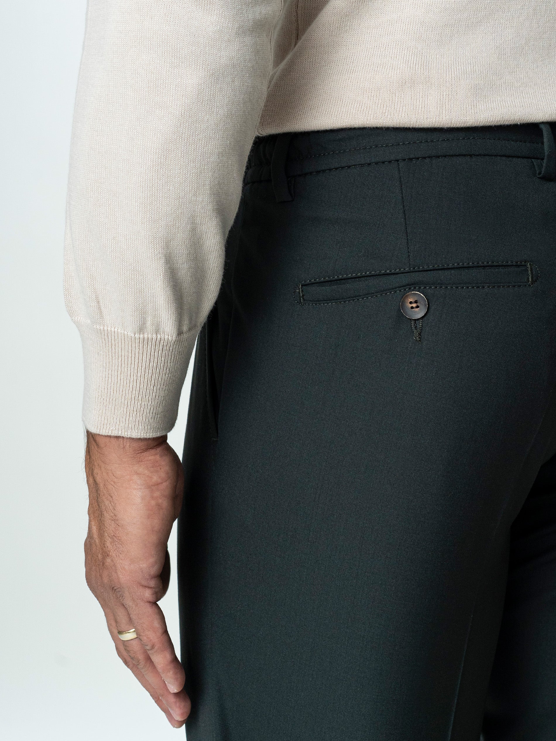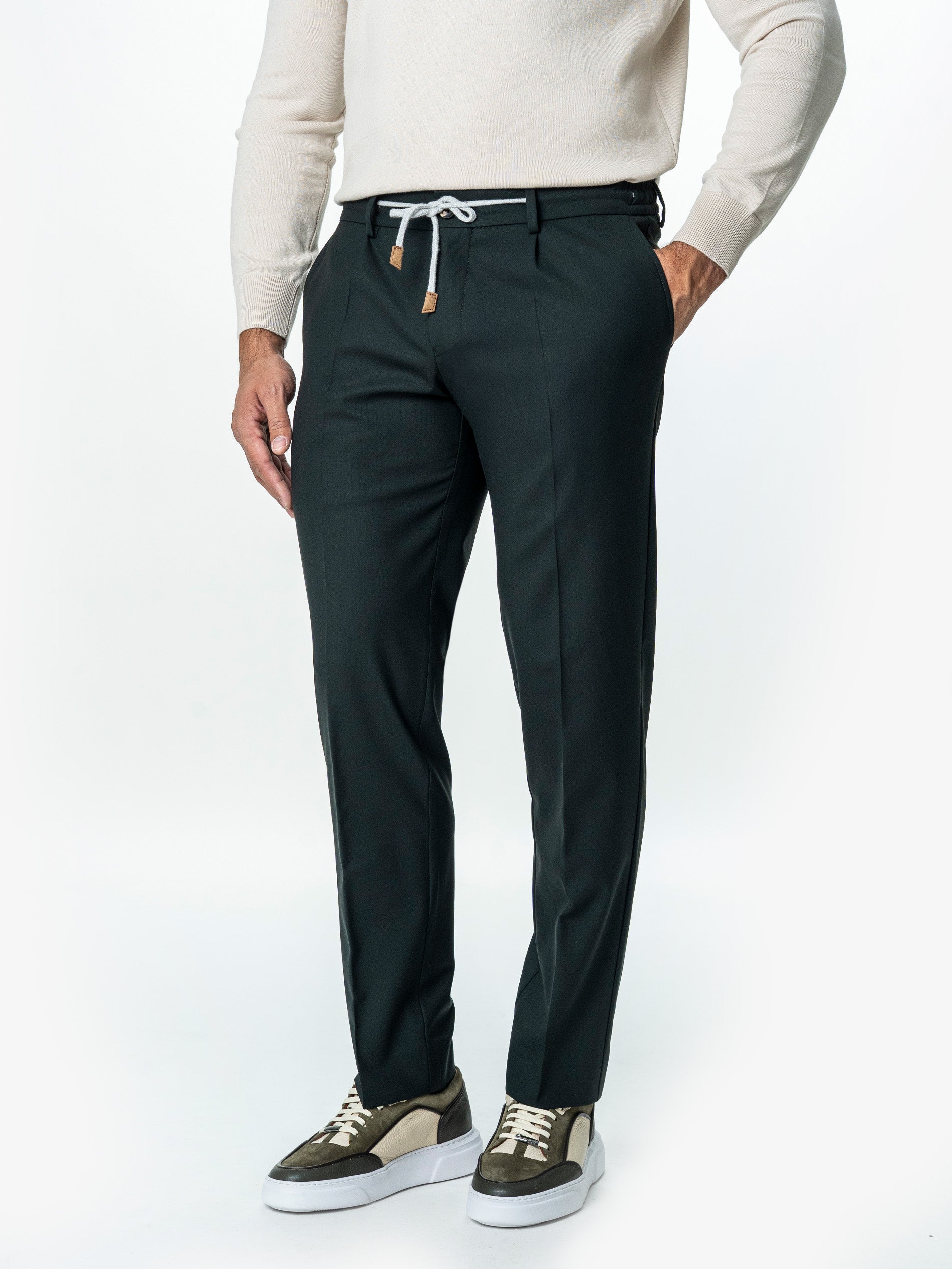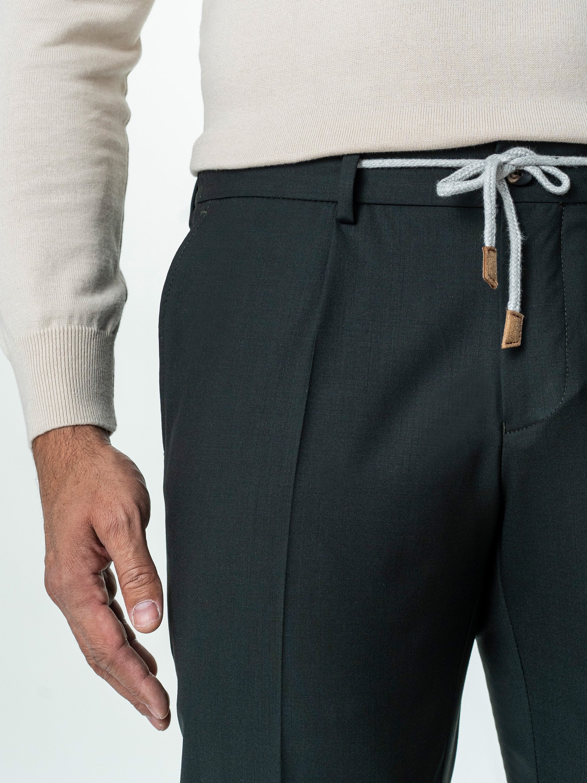 Tracksuit-ul este realizat dintr-o tesatura premium cu continut ridicat de lana (66%), imbinand confortul natural al fibrelor fine cu rezistenta poliesterului si elasticitatea oferita de elastan. Materialul are o textura usor groasa, ceea ce il face potrivit pentru sezonul de toamna, mentinand in acelasi timp o silueta curata si moderna.